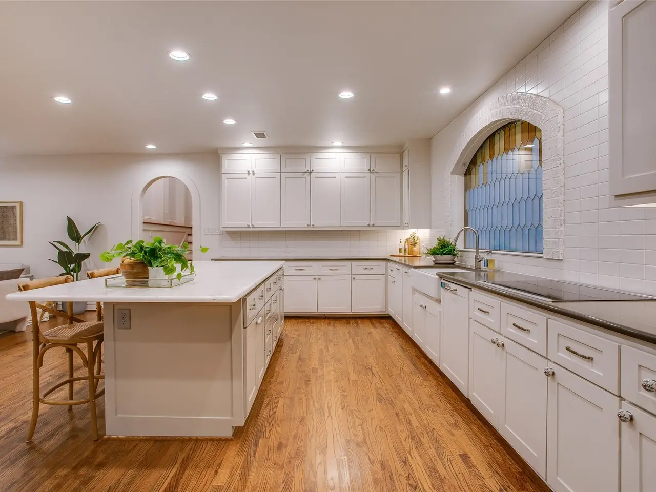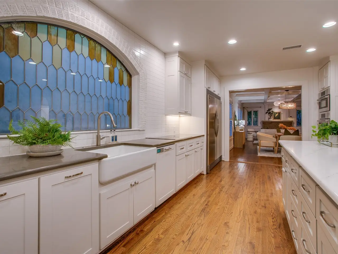 Tucked away on a gated half-acre lot in North Oak Cliff, this Tudor Revival blends storybook charm with thoughtful updates. Stained-glass windows, arched doorways, and coffered ceilings in the formals highlight timeless craftsmanship, while hardwood and tile flooring throughout, plantation shutters, and an original brick fireplace anchor the living spaces. A cathedral-like office or sitting room with vaulted ceilings, exposed beams, and stained-glass windows provides a striking retreat. The bright kitchen boasts a large island, double ovens, walk-in pantry, and oversized, built-in refrigerator. Multiple living areas include an upstairs bonus room ideal as a second living or playroom. The primary suite features a bath with dual vanities, soaking tub, walk-in shower, and walk-in closet. Outdoors, mature trees and wide lawns provide space for entertaining, with the walking trails and playgrounds of Kidd Springs Park just steps away.