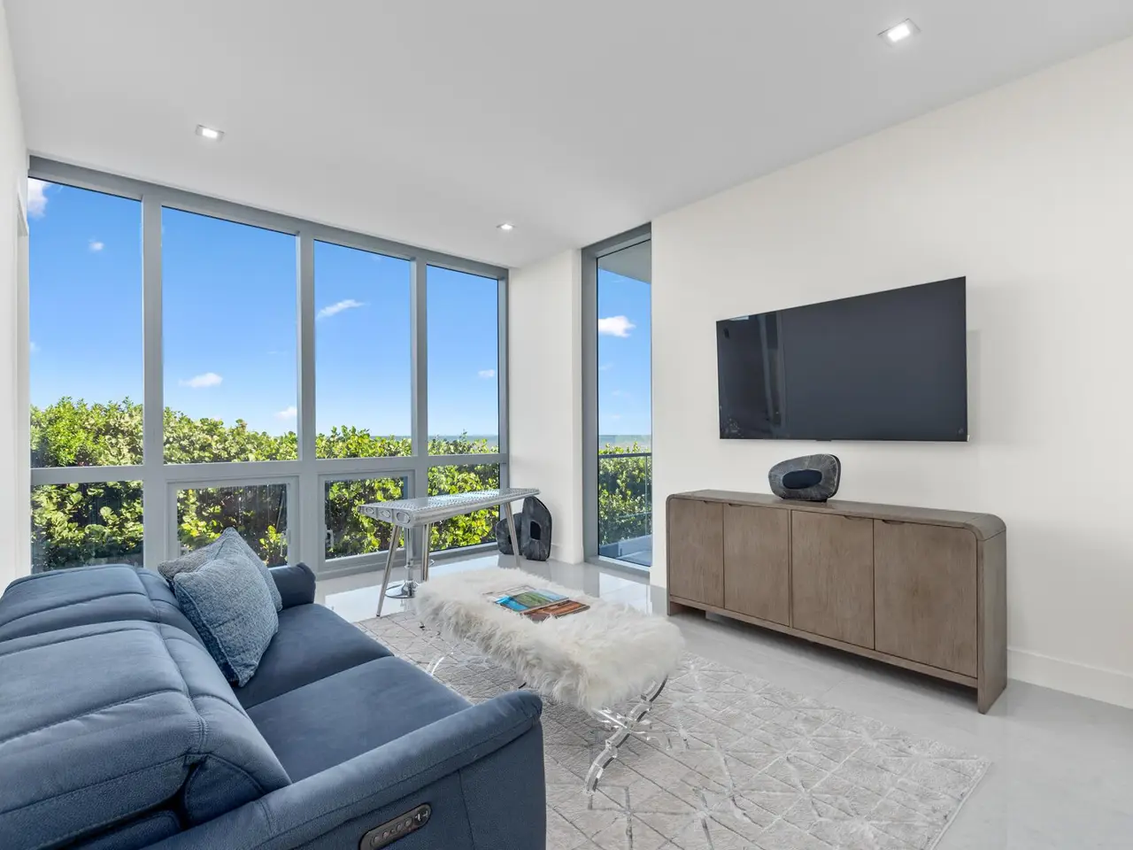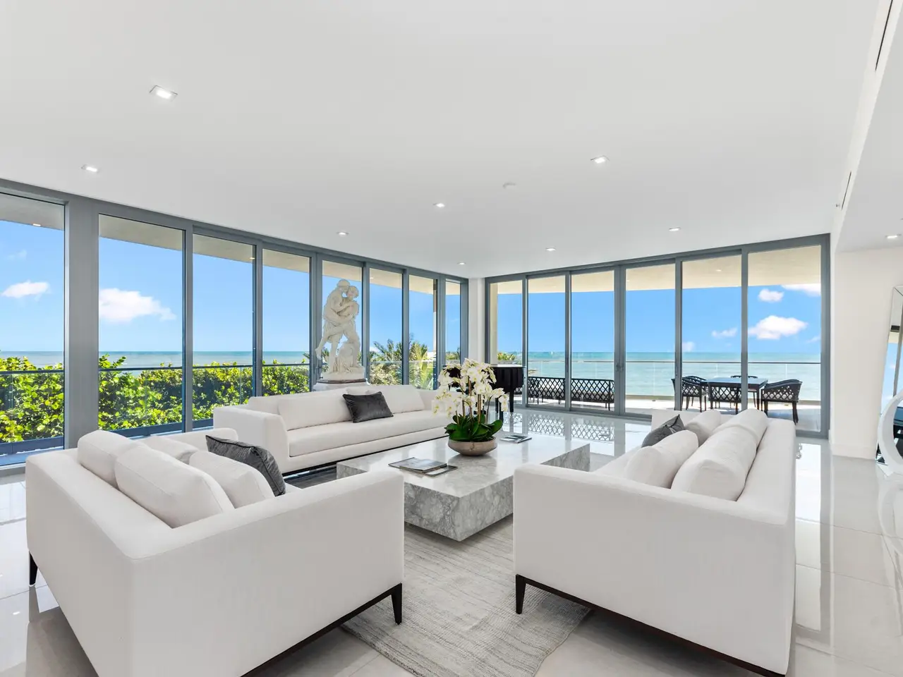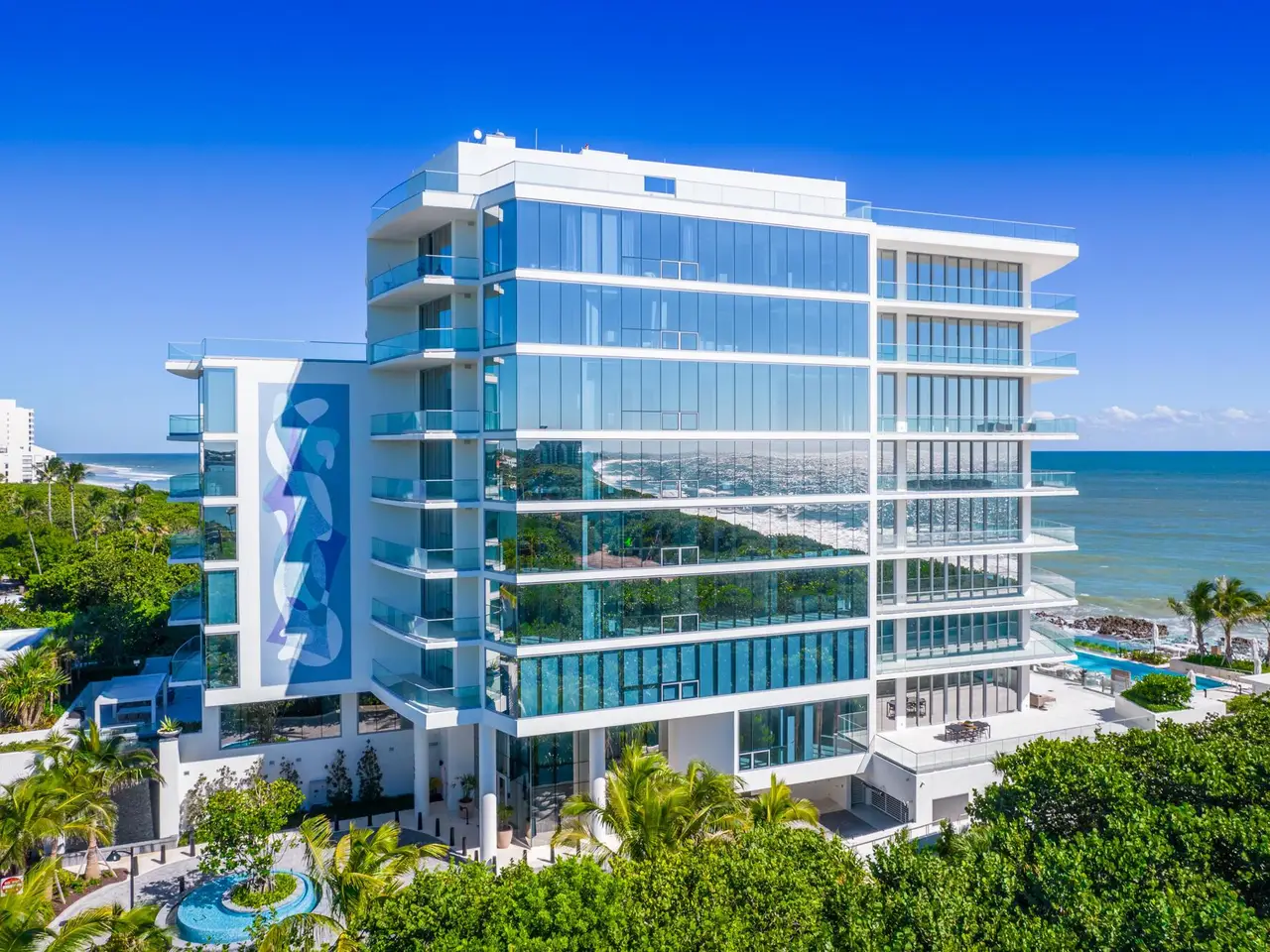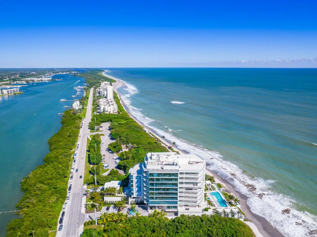 Exceptional opportunity to own this luxurious designer residence at the prestigious SeaGlass Condominium on Jupiter Island offering sweeping, uninterrupted ocean views. Completed in 2022 as the first new condominium development on Jupiter Island in over 20 years, SeaGlass offers just 21 exclusive residences, promising unparalleled luxury, remarkable vistas, and exceptional privacy. Set amidst the pristine beauty of the ocean, Intracoastal Waterway, and lush protected landscapes, Residence 302 is a masterpiece of modern design. Entering through your private foyer, you are welcomed by an expansive open floor plan with lavish marble flooring and floor-to-ceiling glass, providing panoramic views from the ocean to the Intracoastal. SEE MORE REMARKS... This residence includes three bedrooms, four and a half bathrooms, and a den, with each bedroom featuring an ensuite bath, walk-in closets, and stunning views. Additional features include three large terraces, a summer kitchen, imported Italian solid core wood interior doors and casings, 10-foot ceilings, recessed down lighting, and imported Snaidero cabinetry with integrated task lighting. The kitchen boasts a professional-grade stainless steel ventilation hood by Snaidero, top-tier appliances, a cabinet-paneled freezer column, a full-height Miele wine column with glass and cabinet panel front, and two Miele dishwashers. The master suite offers direct terrace access, dual walk-in closets, separate bathrooms with steam showers and frameless glass enclosures, imported marble, Italian wall-mounted vanities, and designer mirrors and lighting. The SeaGlass building offers an impressive range of amenities, including a gated entrance, a 24/7 attended lobby designed by Champalimaud Design, an emergency generator, a heated oceanfront infinity-edge pool, a sandy beach with chaise lounges, two gated stairways to the beach, a beachside summer kitchen, an outdoor viewing terrace, a heated spa, a full-time property manager, a fitness center, a yoga meditation lawn, a club room with a catering kitchen and game area, an outdoor social terrace with BBQs and a fire pit, a dog walk area and bathing station, a package room with keypad access, and a dedicated bike storage area. This one-of-a-kind property offers the rare chance to embrace the ultimate in coastal luxury living.