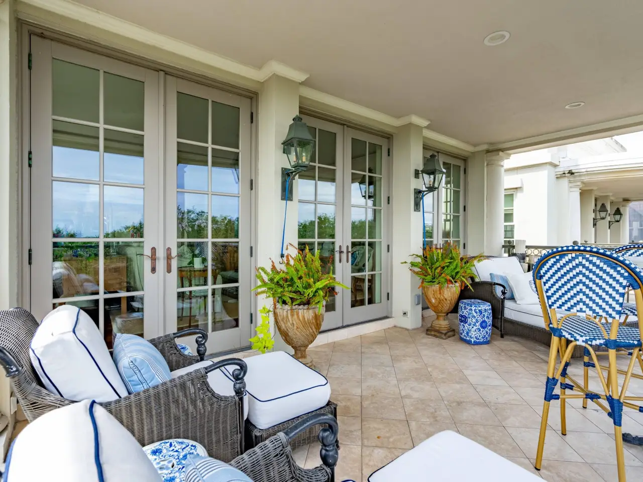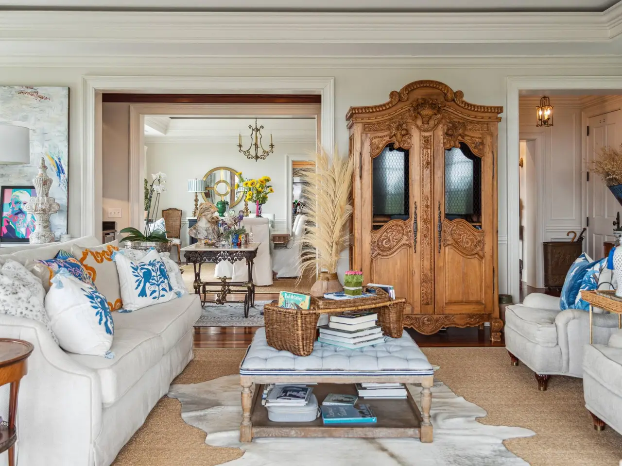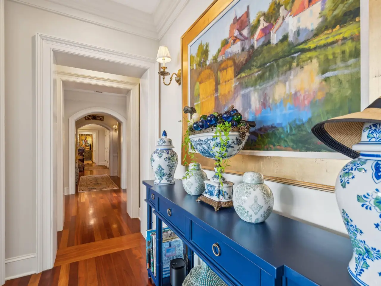 Rare, elegant penthouse-level apartment offering southern views of the Charleston Harbor from the living/dining room and terrace, with historic steeple views from the primary suite. This spacious residence offers the very best apartment floor plan in the city. Luxurious trim and mouldings throughout, this fine apartment lives like a grand home. Well-proportioned formal space with separate formal living room, and dining room divided by a mahogany paneled wet bar and storage. The side hall gallery connects the formal and informal spaces with abundant storage. The well-appointed kitchen offers a separate breakfast area with views of the harbor and beautiful sunrises. Adjacent to the kitchen is a library with mahogany built-ins and another fireplace perfect for evenings or desk working. The bedroom wing offers a comfortable guest bedroom with en suite bath. The luxurious primary suite features another fireplace with abundant light throughout. This suite is unique with two separate baths and two walk-in closets, all en suite. With its prime location, walkable to the very best restaurants and shopping, along with two garage spaces below, this luxurious residence is hands above any in the city.