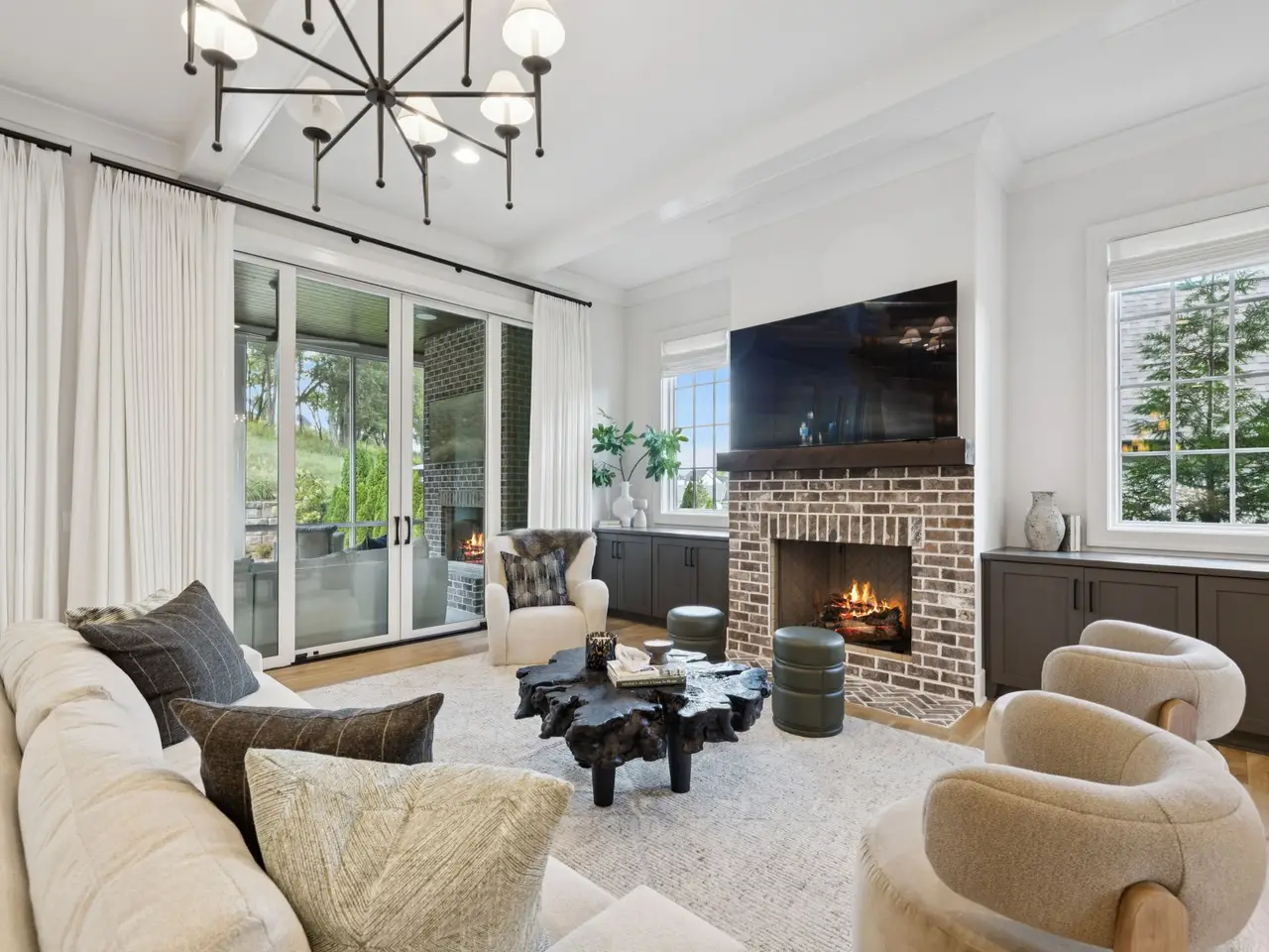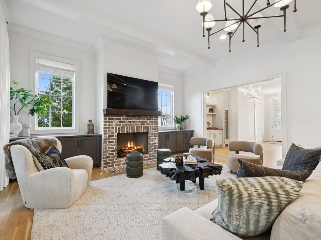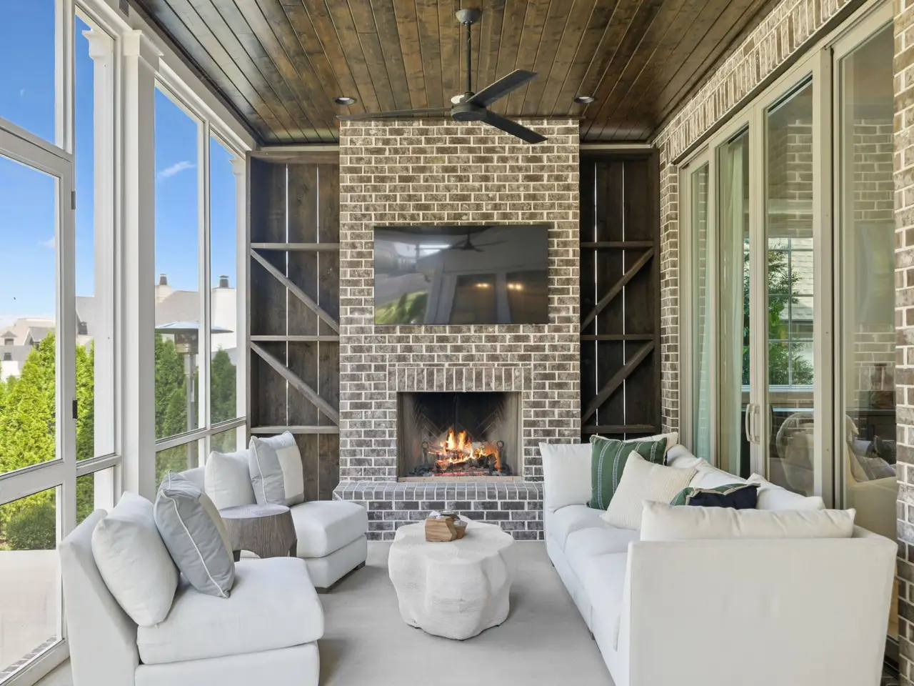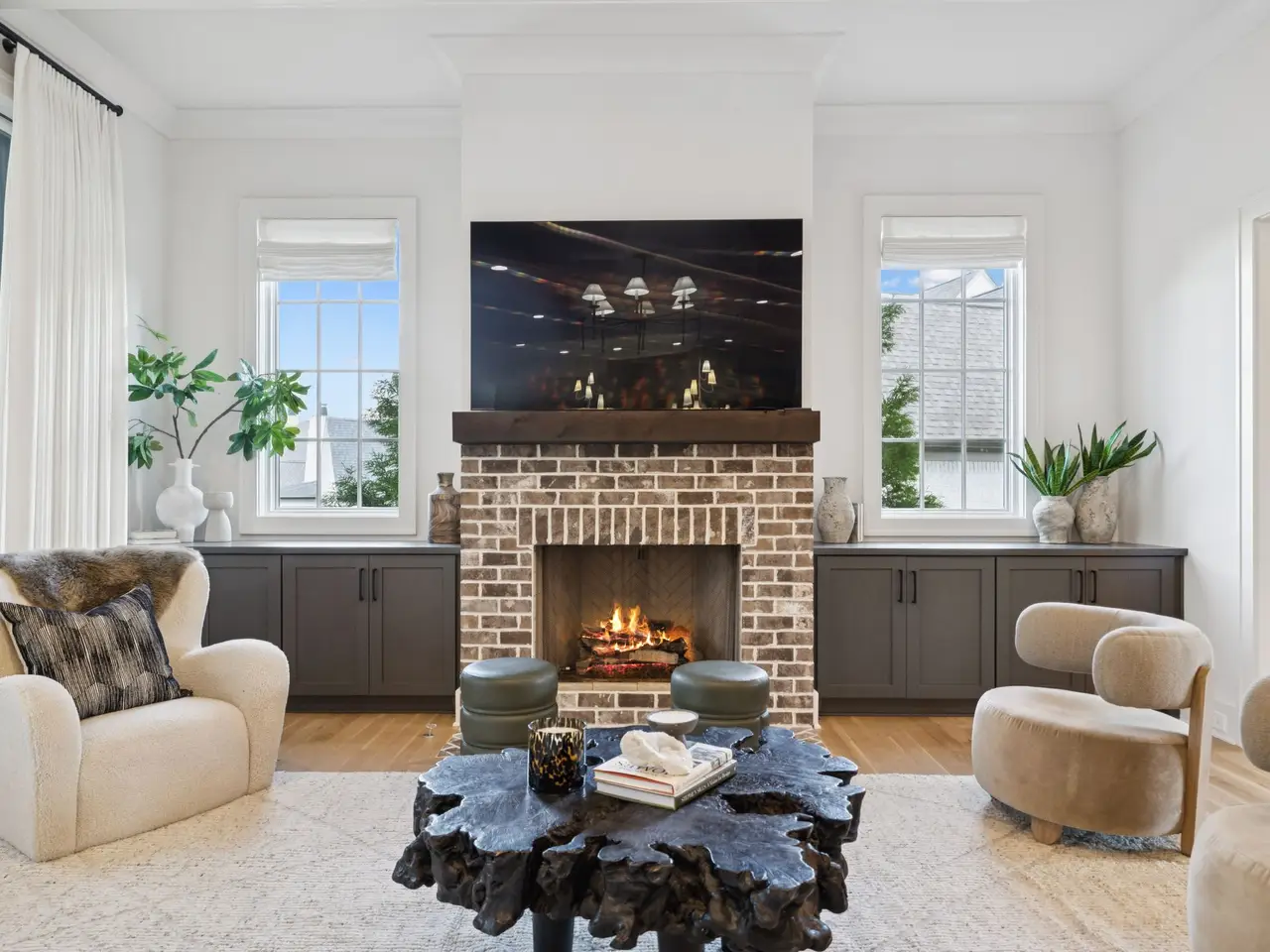 Brick fireplace with custom cabinetry
