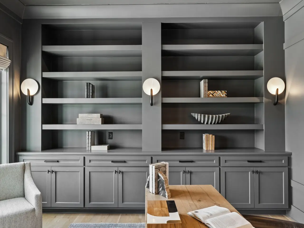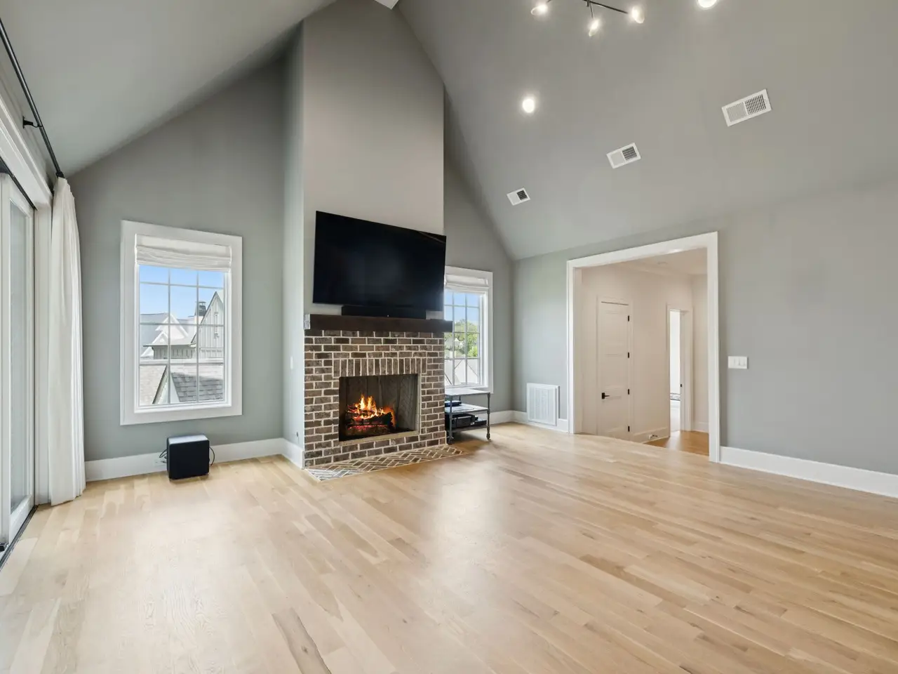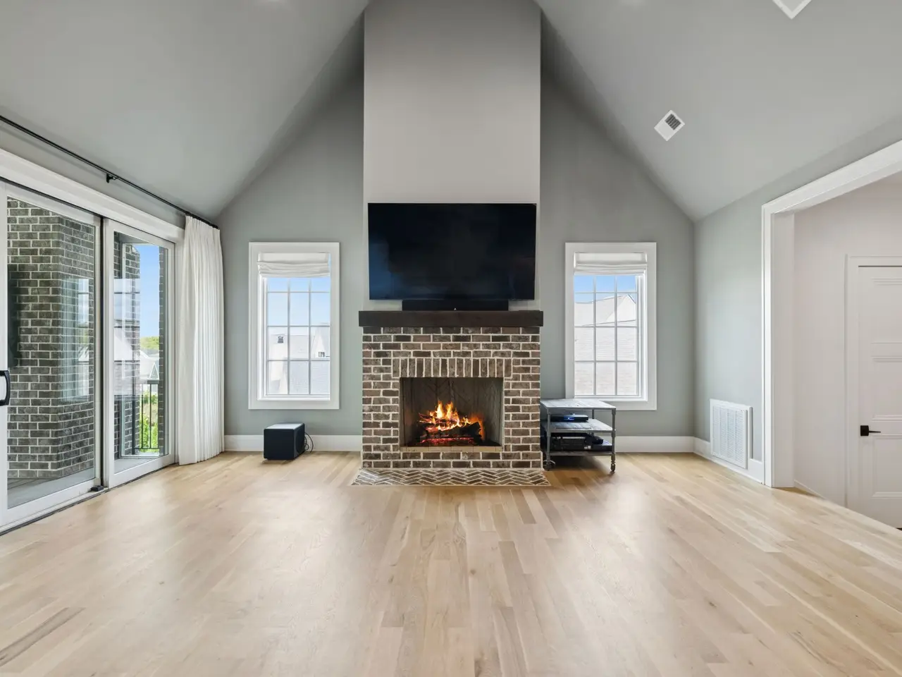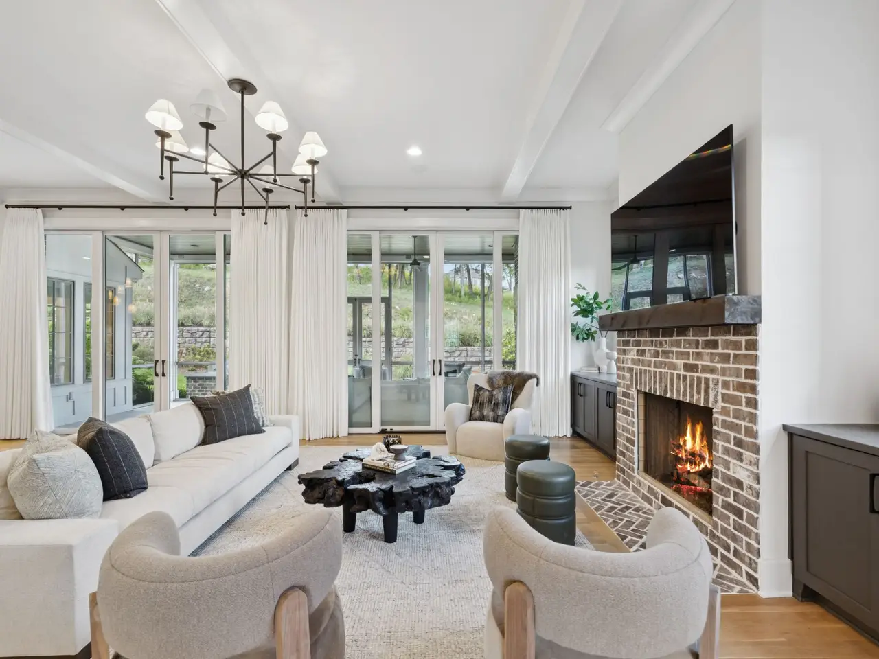 Brick fireplace with custom cabinetry
