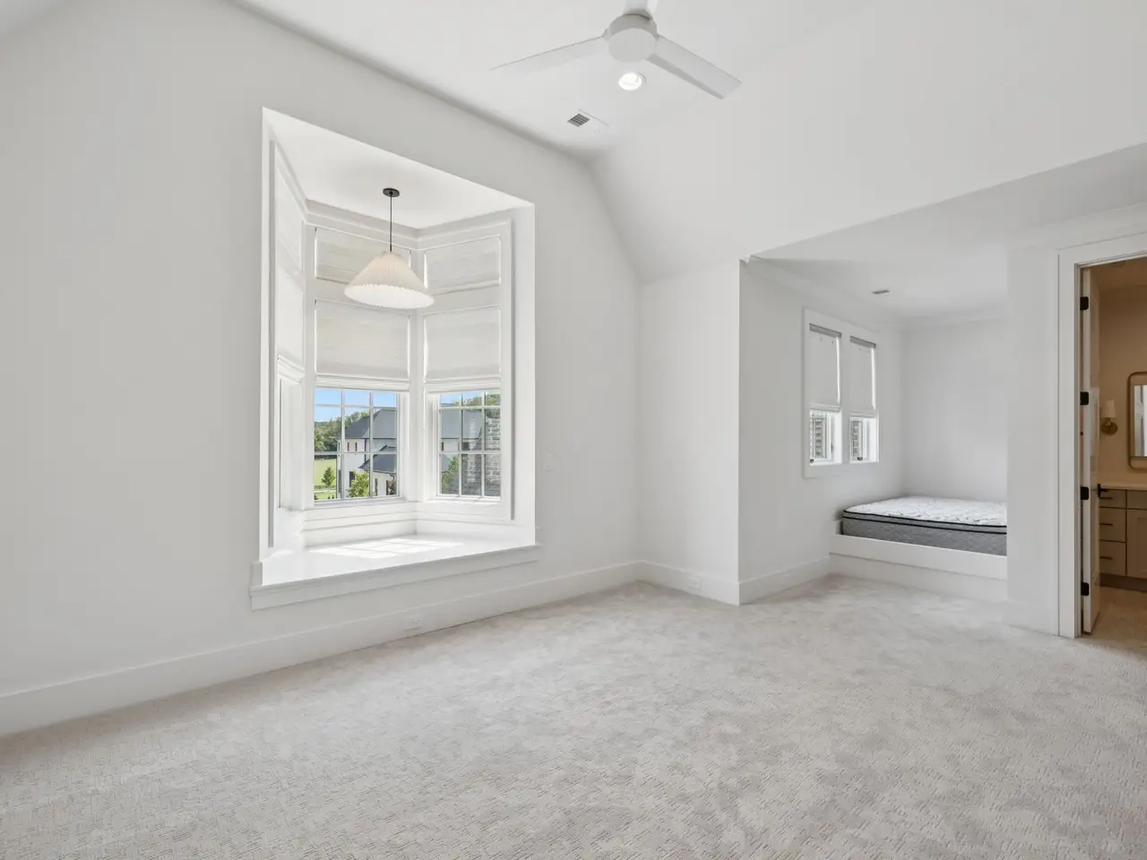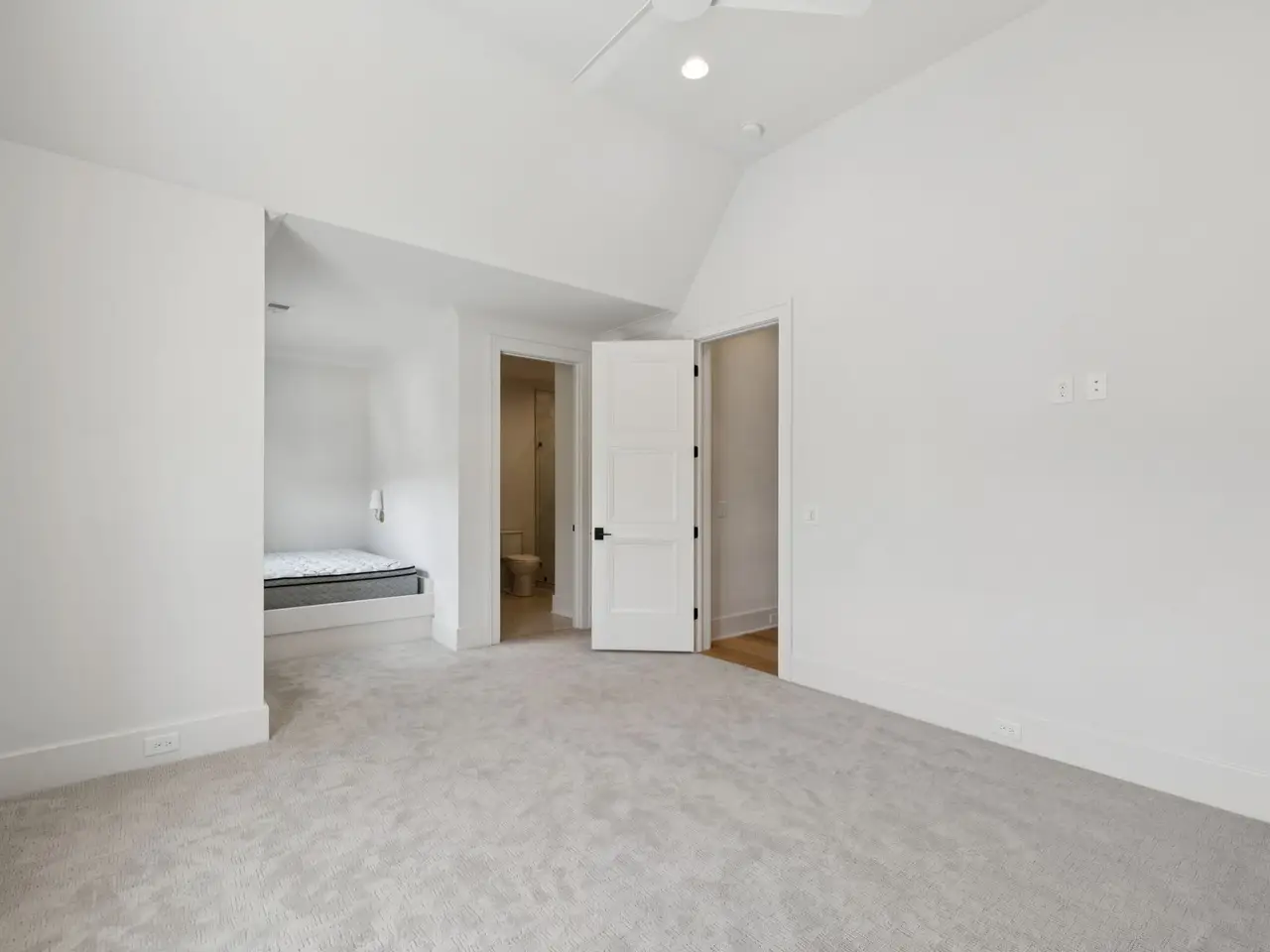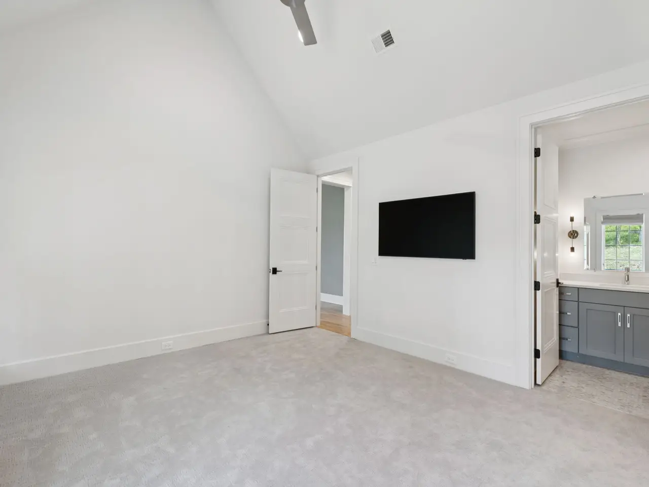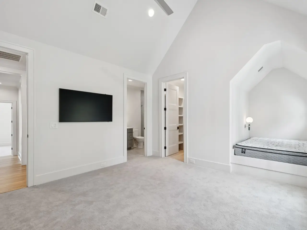 Vaulted primary suite with spa-like bath