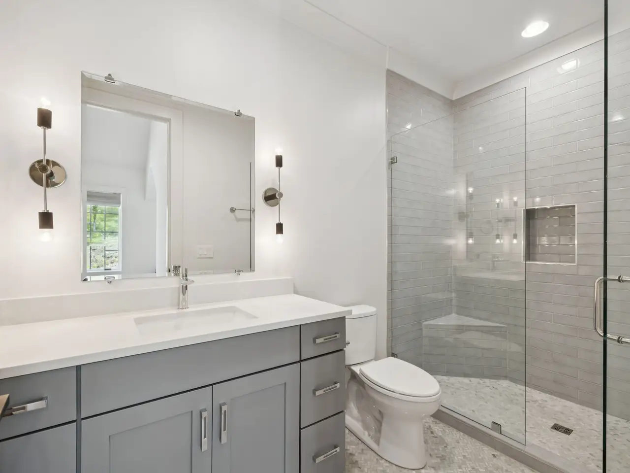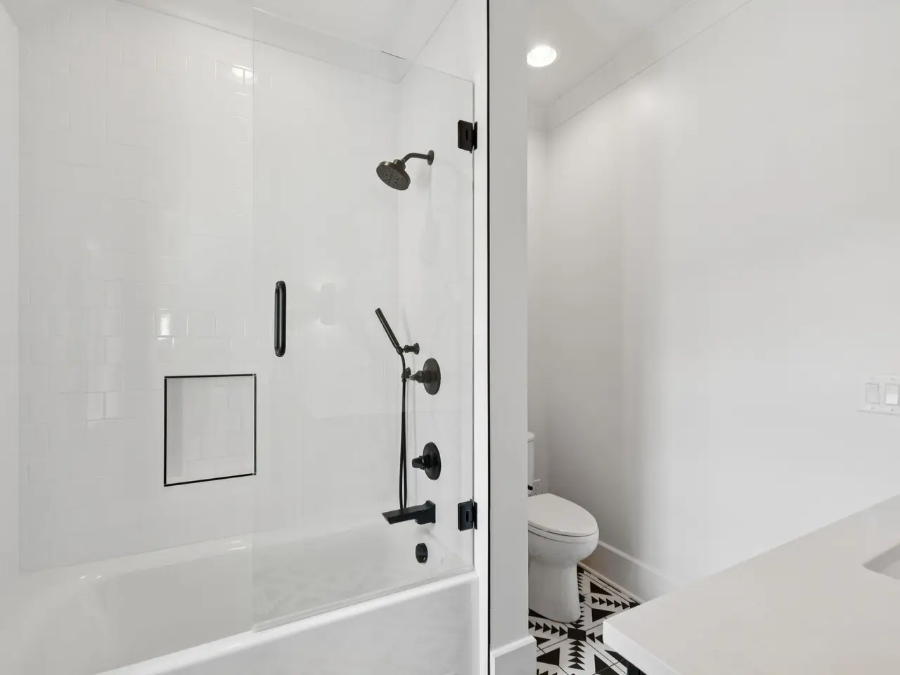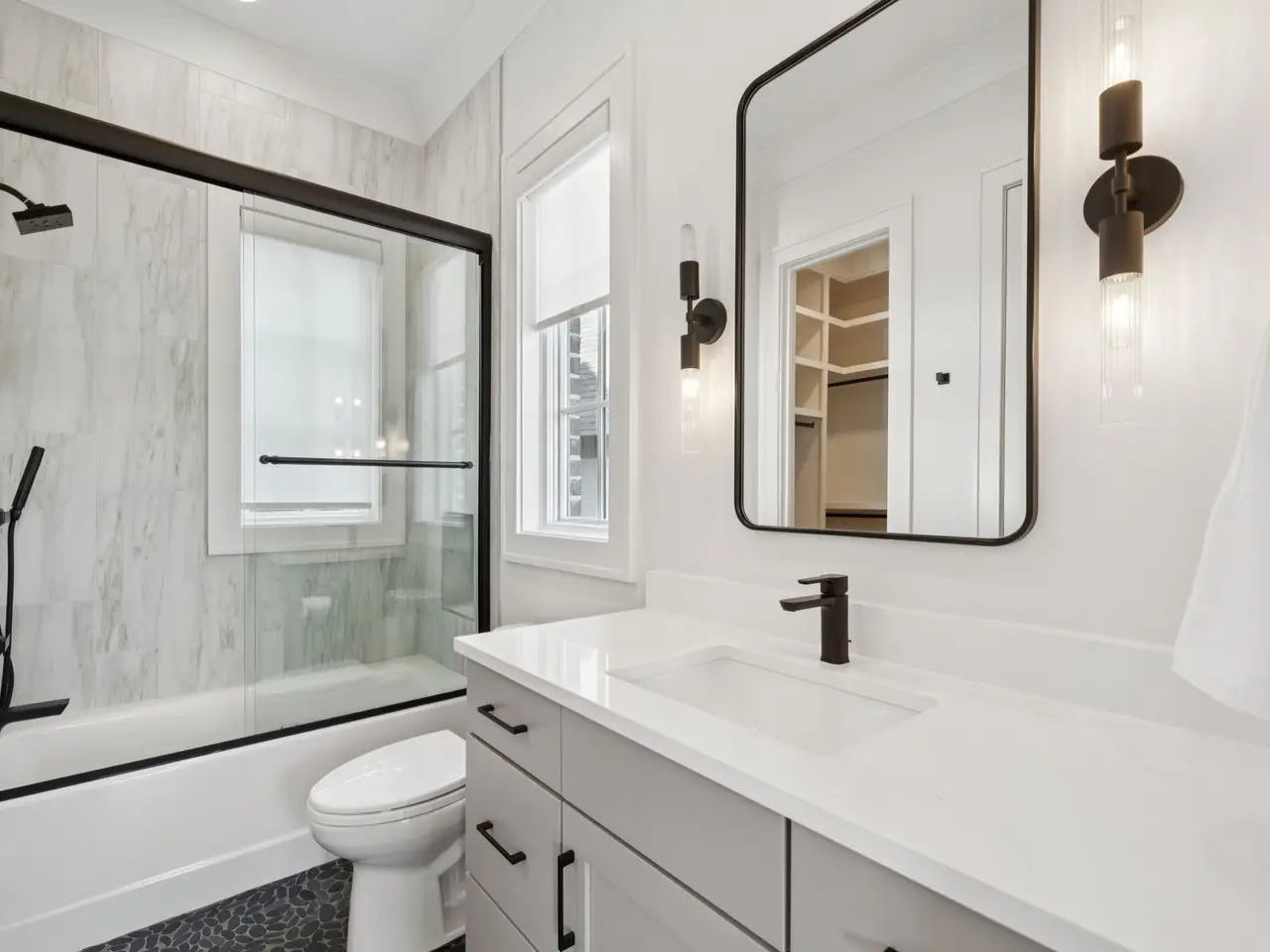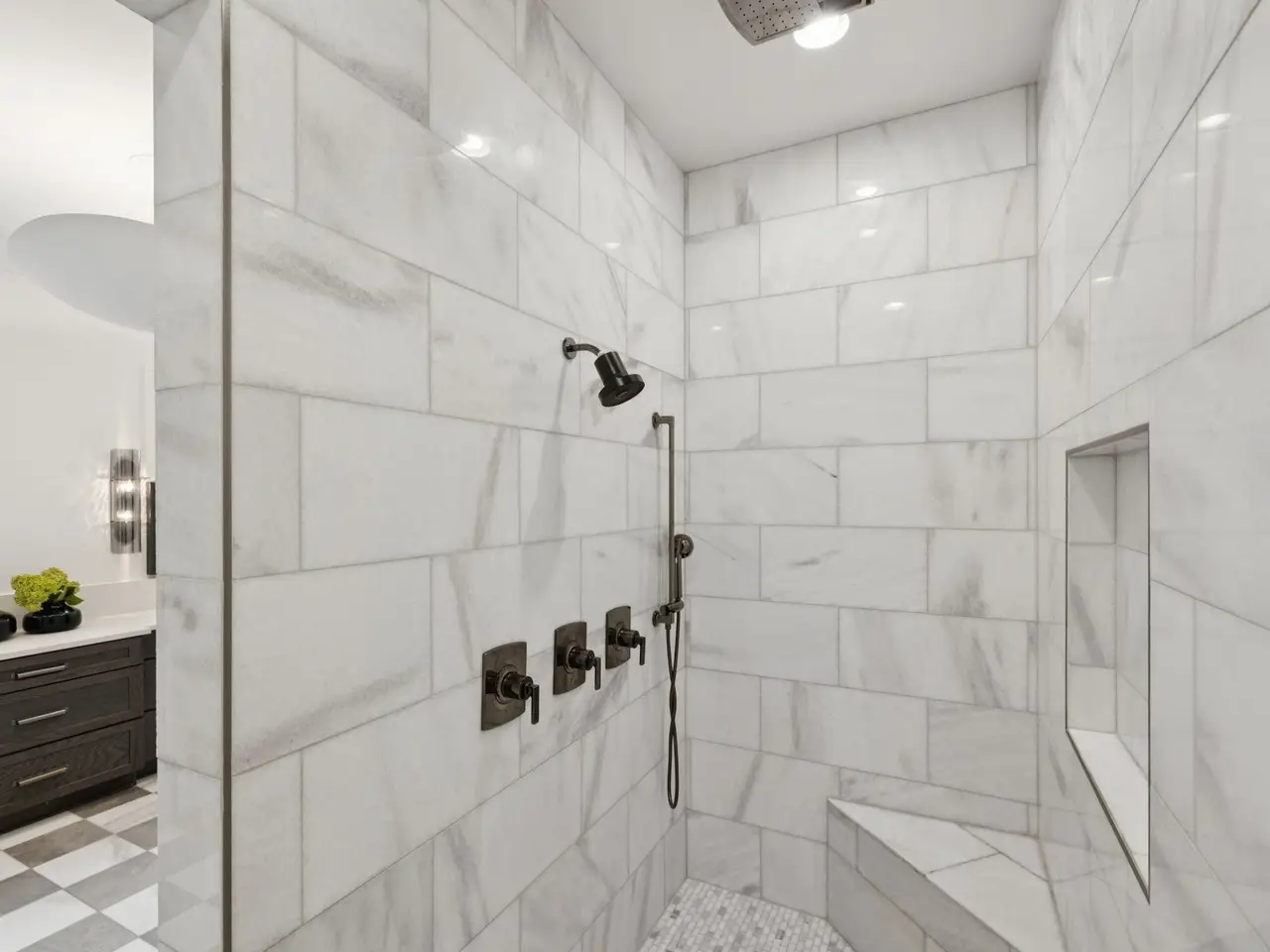 Vaulted primary suite with spa-like bath