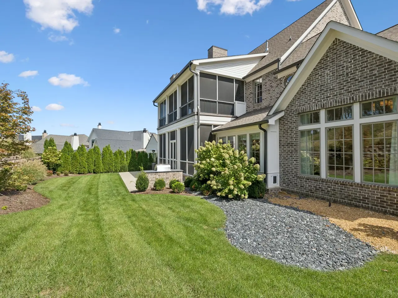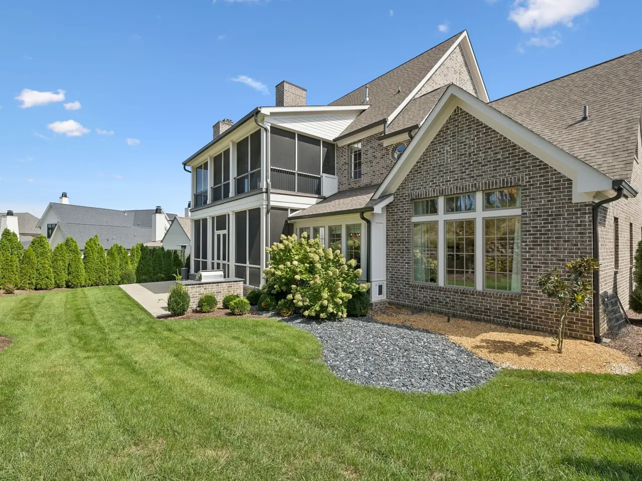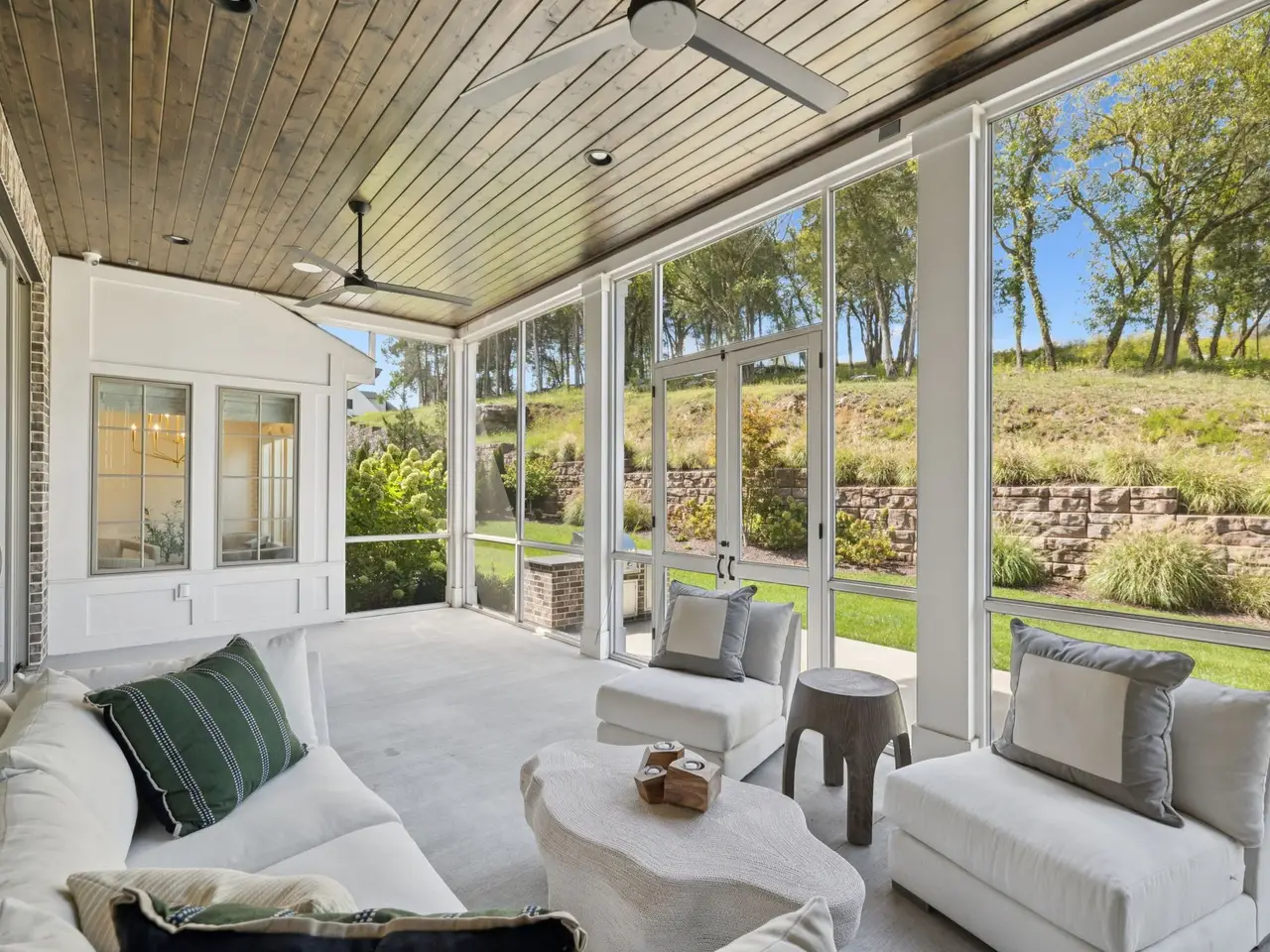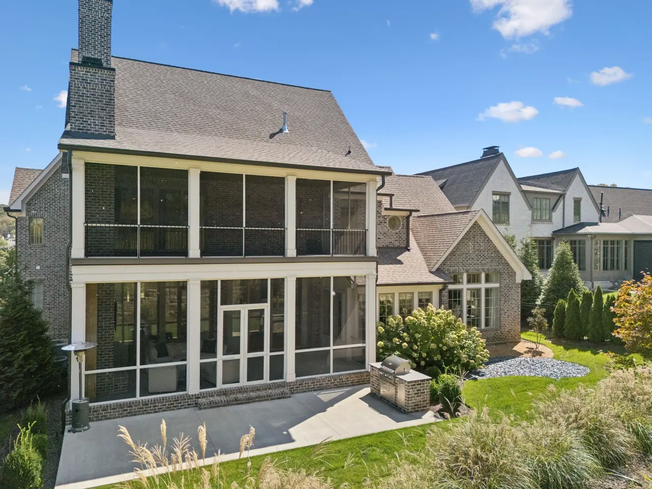 Gorgeous modern Tudor-style brick home in The Grove, one of Middle Tennessee's most sought-after gated communities. Offering resort-style living, residents enjoy a world-class spa, clubhouse, Greg Norman Signature golf course, fishing lakes, fine and casual dining, racquet courts, equestrian facilities, sports fields, walking trails, and multiple pools. Step inside to a welcoming foyer that leads to a private office with custom built-ins and wainscoting, accented by designer lighting. A stylish wet bar with paneled Thermador wine fridges and an ice maker sets the stage for effortless entertaining. The open-concept living room is anchored by a brick fireplace with custom cabinetry, flowing seamlessly into a chef's kitchen with custom-panel appliances, pull-out cabinet drawers, and a sink equipped with filtered water and instant hot water. A generous pantry with open shelving and cabinetry provides both storage and prep space. The vaulted primary suite is a retreat with shiplap accents, a spa-like bath featuring a soaking tub, a floor-to-ceiling tile shower, checkered tile flooring, and a walk-in closet with center vanity. A guest suite with private bath and powder room complete the main level. Upstairs, a vaulted rec room with surround sound and fireplace opens to a screened porch--perfect for game nights or relaxed evenings. Enjoy Tennessee living year-round with a peaceful backyard featuring a screened porch with wood-burning fireplace, built-in gas grill, and patio with room for a future pool. Additional highlights include custom draperies, a sealed crawl space, and convenient access just two minutes from the back gate. Blending timeless design with modern luxury, this home offers both elegance and comfort in a community where every day feels like a getaway.