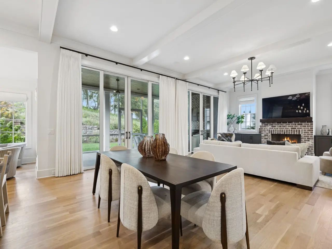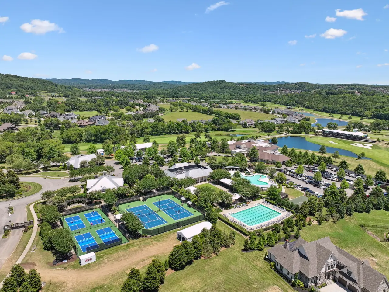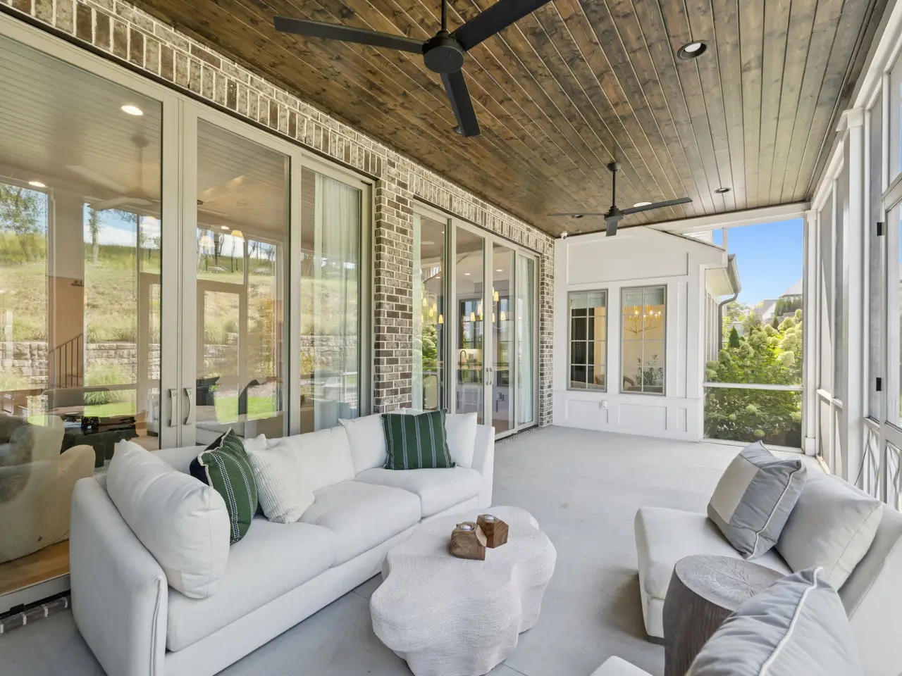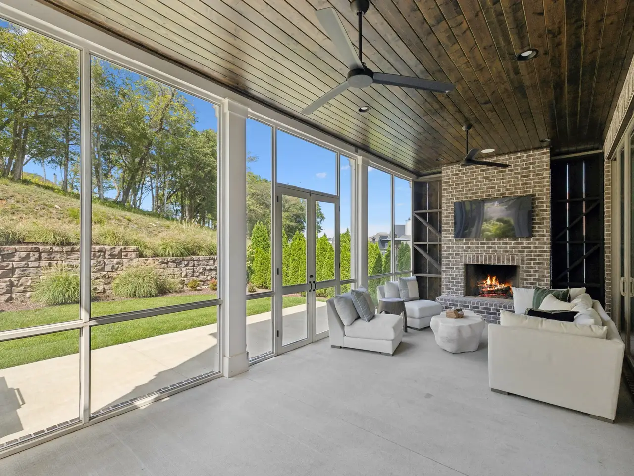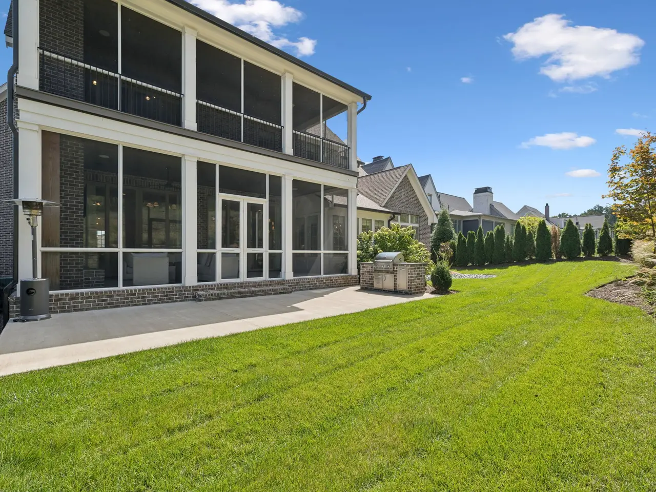 Gorgeous modern Tudor-style brick home in The Grove, one of Middle Tennessee's most sought-after gated communities. Offering resort-style living, residents enjoy a world-class spa, clubhouse, Greg Norman Signature golf course, fishing lakes, fine and casual dining, racquet courts, equestrian facilities, sports fields, walking trails, and multiple pools. Step inside to a welcoming foyer that leads to a private office with custom built-ins and wainscoting, accented by designer lighting. A stylish wet bar with paneled Thermador wine fridges and an ice maker sets the stage for effortless entertaining. The open-concept living room is anchored by a brick fireplace with custom cabinetry, flowing seamlessly into a chef's kitchen with custom-panel appliances, pull-out cabinet drawers, and a sink equipped with filtered water and instant hot water. A generous pantry with open shelving and cabinetry provides both storage and prep space. The vaulted primary suite is a retreat with shiplap accents, a spa-like bath featuring a soaking tub, a floor-to-ceiling tile shower, checkered tile flooring, and a walk-in closet with center vanity. A guest suite with private bath and powder room complete the main level. Upstairs, a vaulted rec room with surround sound and fireplace opens to a screened porch--perfect for game nights or relaxed evenings. Enjoy Tennessee living year-round with a peaceful backyard featuring a screened porch with wood-burning fireplace, built-in gas grill, and patio with room for a future pool. Additional highlights include custom draperies, a sealed crawl space, and convenient access just two minutes from the back gate. Blending timeless design with modern luxury, this home offers both elegance and comfort in a community where every day feels like a getaway.