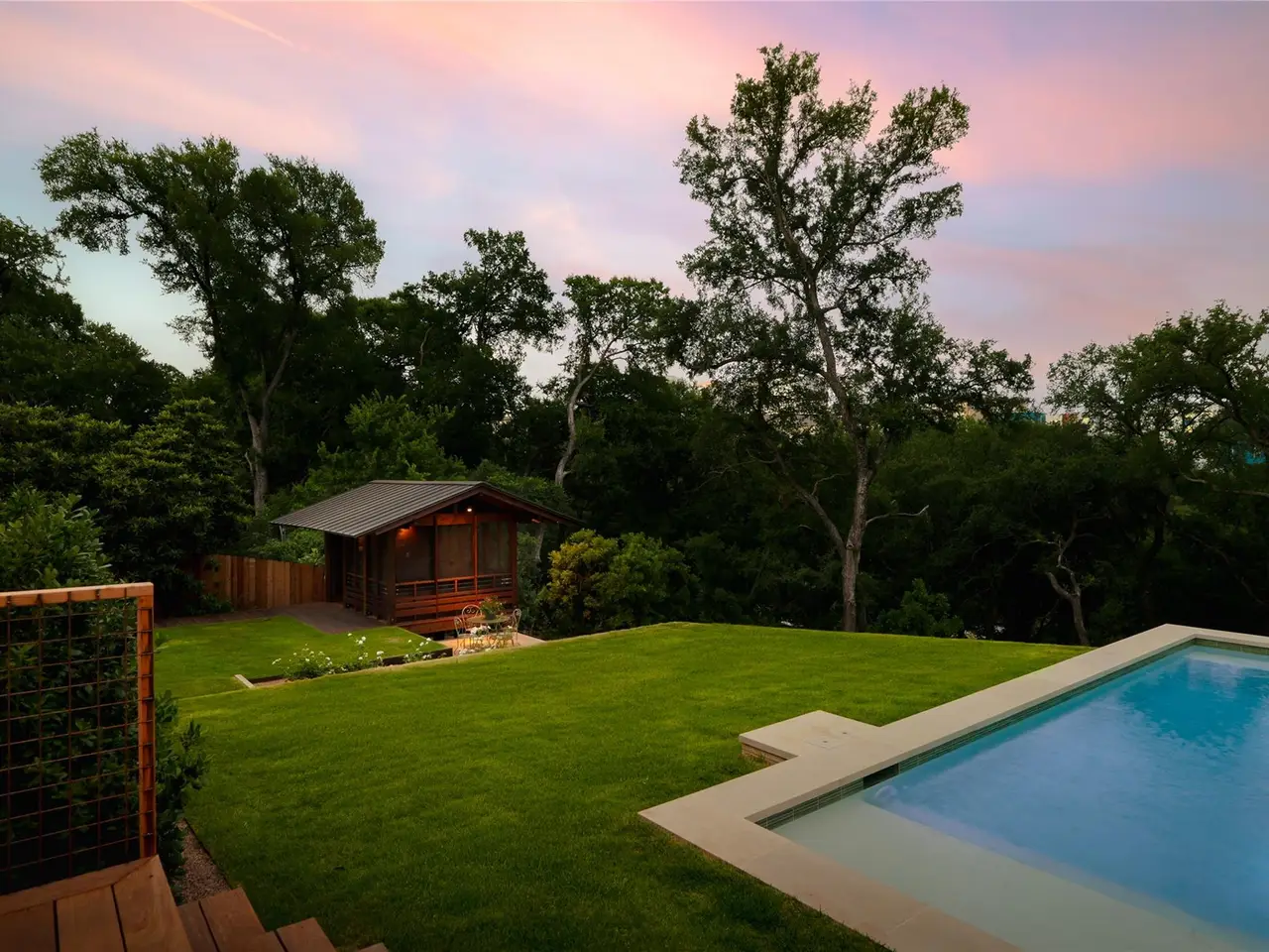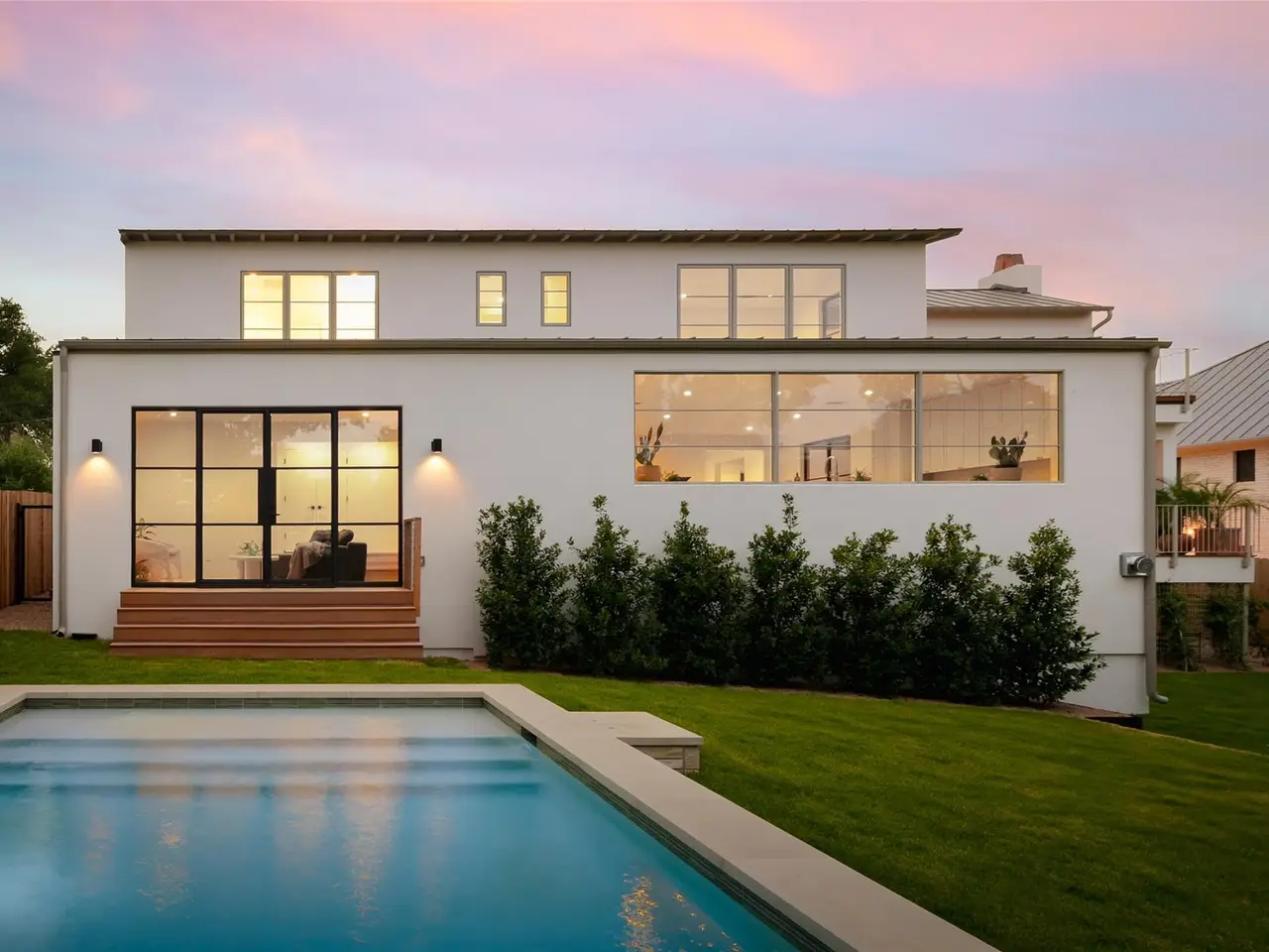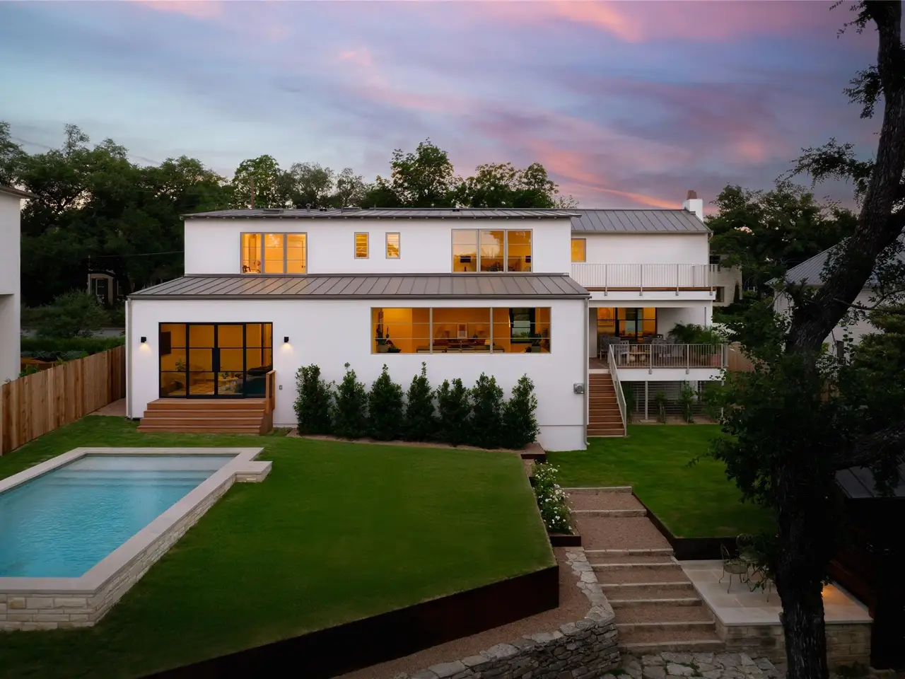 Completely reimagined with a discerning eye for detail, this luxurious residence blends timeless craftsmanship with modern sophistication. Smooth plaster walls, curated high-end finishes, and a thoughtfully reconfigured floor plan create a home that feels both grounded and elevated. The main level includes a formal living room, an open-concept kitchen and breakfast area, a casual family room overlooking the pool, a wine room, and a handsome study or flex space that can serve as an additional bedroom or guest retreat. Upstairs, four bedrooms--each with its own ensuite bathroom--provide a quiet escape. The primary suite is a tranquil haven, featuring beautiful French doors that open to a private balcony with sweeping views of the expansive backyard and downtown skyline. Outdoors, the backyard unfolds into a lush sanctuary with mature trees covering over half the property and offering a natural playground for kids--or goats, if you dare! The pool, nestled in the shade, is enhanced by established landscaping and a screened casita that adds both charm and functionality--ideal for outdoor dining, entertaining, or simply relaxing. Located in the prestigious Pemberton Heights neighborhood and backing directly to the Pease Park greenbelt, this home offers a rare fusion of refined design and natural beauty, where every element has been thoughtfully curated.