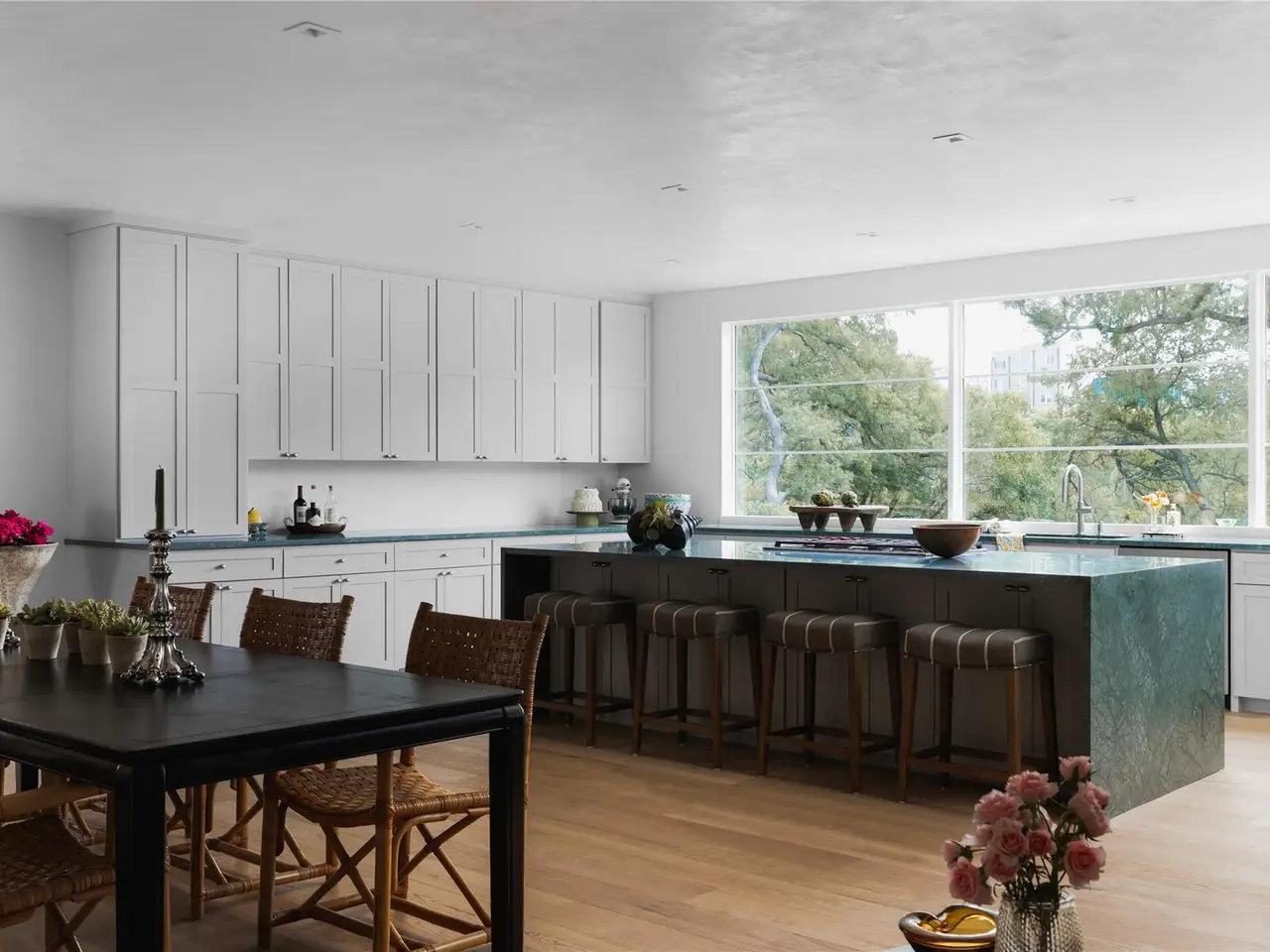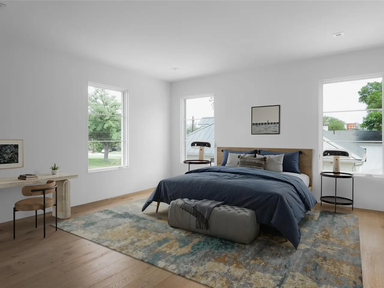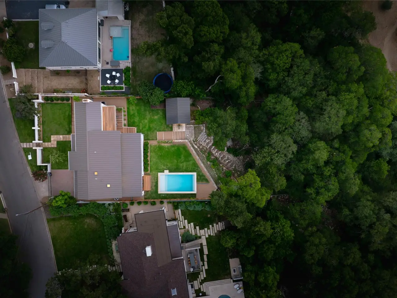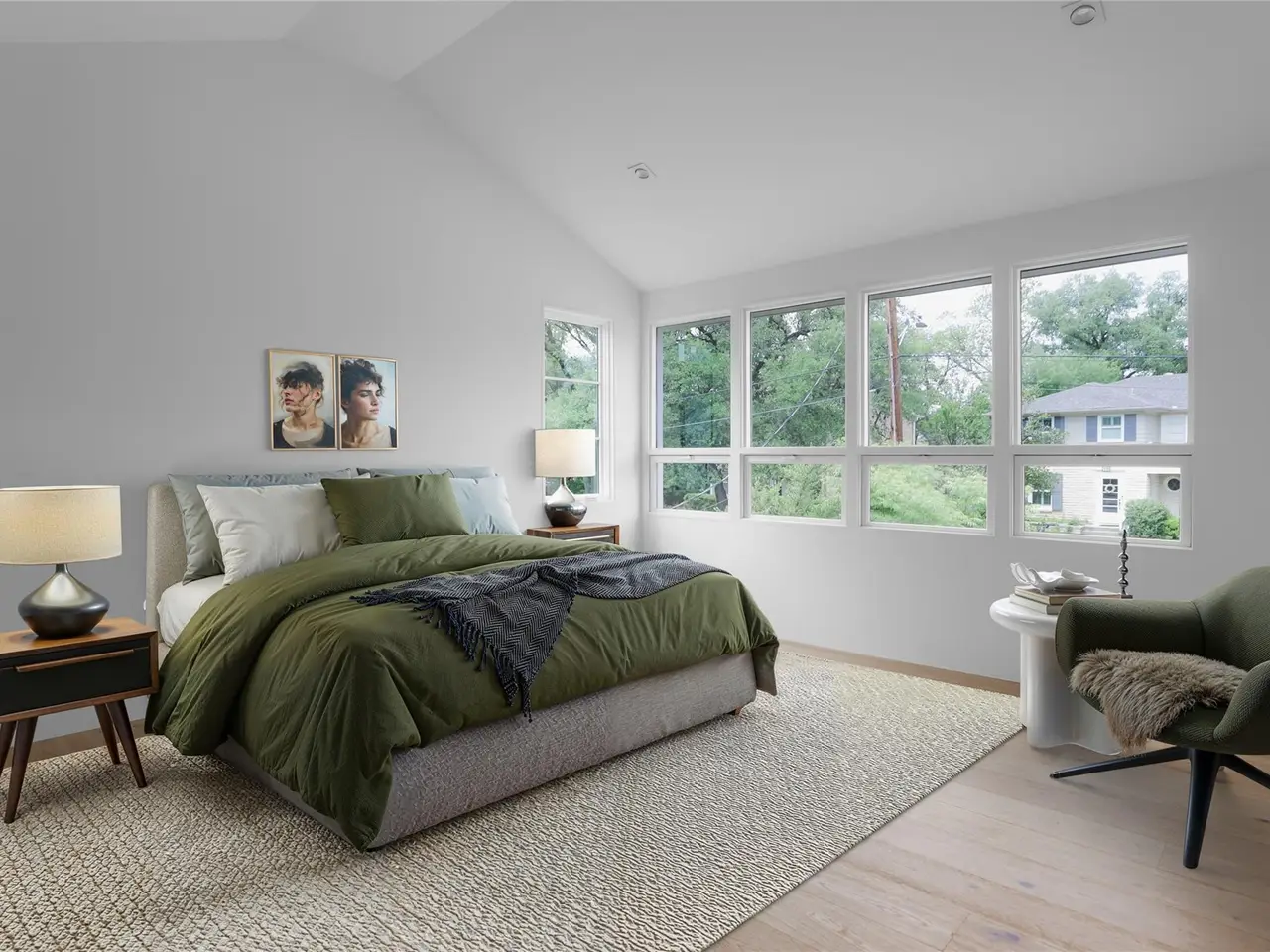 Completely reimagined with a discerning eye for detail, this luxurious residence blends timeless craftsmanship with modern sophistication. Smooth plaster walls, curated high-end finishes, and a thoughtfully reconfigured floor plan create a home that feels both grounded and elevated. The main level includes a formal living room, an open-concept kitchen and breakfast area, a casual family room overlooking the pool, a wine room, and a handsome study or flex space that can serve as an additional bedroom or guest retreat. Upstairs, four bedrooms--each with its own ensuite bathroom--provide a quiet escape. The primary suite is a tranquil haven, featuring beautiful French doors that open to a private balcony with sweeping views of the expansive backyard and downtown skyline. Outdoors, the backyard unfolds into a lush sanctuary with mature trees covering over half the property and offering a natural playground for kids--or goats, if you dare! The pool, nestled in the shade, is enhanced by established landscaping and a screened casita that adds both charm and functionality--ideal for outdoor dining, entertaining, or simply relaxing. Located in the prestigious Pemberton Heights neighborhood and backing directly to the Pease Park greenbelt, this home offers a rare fusion of refined design and natural beauty, where every element has been thoughtfully curated.