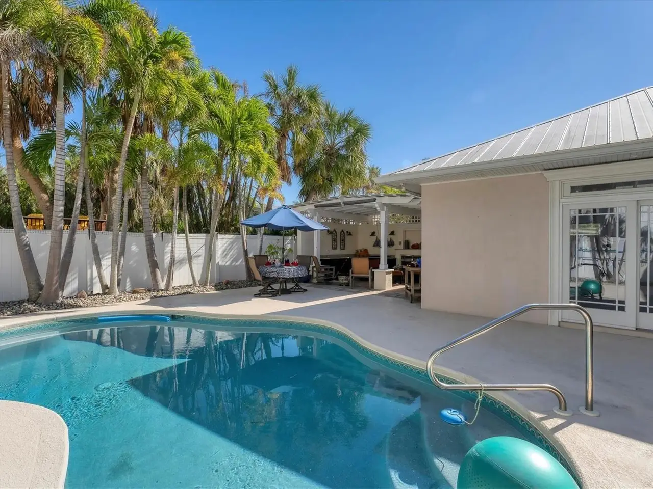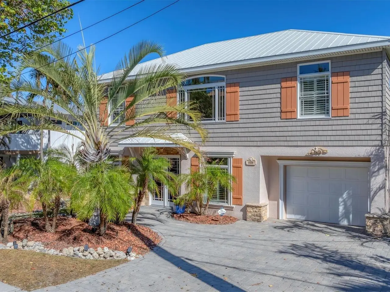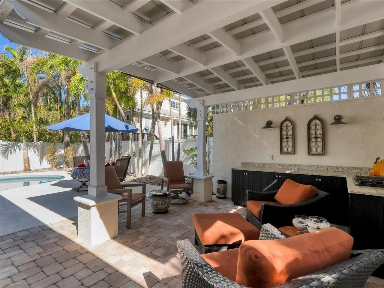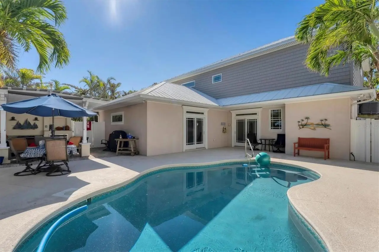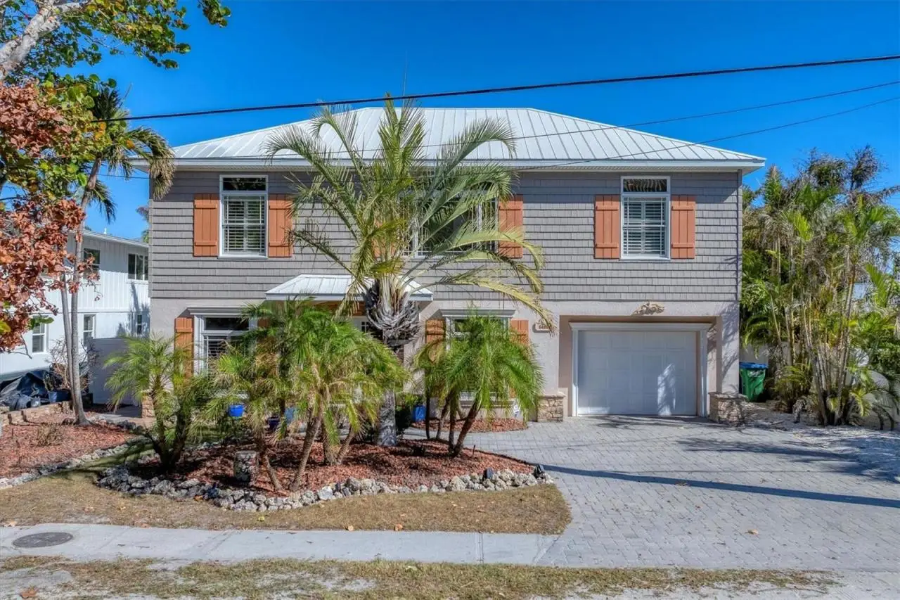 Location, location, location! This beautiful custom home in West Wind Shores is just across the street from the beach and minutes from Anna Maria Island. With an oasis-like backyard and swimming pool, this property offers the ultimate coastal lifestyle. Custom features abound, including high ceilings, arched entryways, travertine flooring, plantation shutters, 5-inch baseboards, recessed lighting, and large walk-in closets. As you enter through the front French doors, you're greeted by a cozy main living area complete with a gas fireplace. To the right, a versatile bonus space awaits, ideal for a dining area or hobby room. The thoughtfully designed split floor plan flows seamlessly, offering two primary bedrooms-one on each floor. The kitchen is a chef's delight, featuring granite countertops, custom cabinetry, newer Bosch appliances, including a Wolf gas stovetop with electric Wolf oven (rare on the island), a breakfast bar with pendant lighting, a glass-tiled backsplash, a wine refrigerator, and elegant travertine flooring. The downstairs primary suite overlooks the pool and offers ample space and luxurious details, including an oversized marble-tiled shower with a glass enclosure, dual sinks, extra storage, and a makeup/dressing table. Upstairs, the second primary suite boasts a large walk-in closet, an ensuite bath, and double doors leading to a loft area with large, picturesque windows that invite you to relax with a book in the afternoon light. The third bedroom is currently being used as an office, complete with built-in bookshelves and a Murphy bed for added flexibility. Sliding glass doors lead to a backyard oasis featuring palm trees, a pergola, a partially covered paver patio, and a completely fenced-in yard. The heated pool and outdoor kitchen, complete with a gas fireplace, create the perfect setting for entertaining. The space is wired for cable, allowing you to enjoy your favorite games while lounging or barbecuing. For pet lovers, there is a separate fenced area and a convenient storage shed. This custom home combines luxury, comfort, and an unbeatable location near the beach and Anna Maria Island. Convenient and complimentary trolley across the street. Walk across the street for sunset every night on the other side of a tall building complex. Don't miss your chance to own this coastal retreat