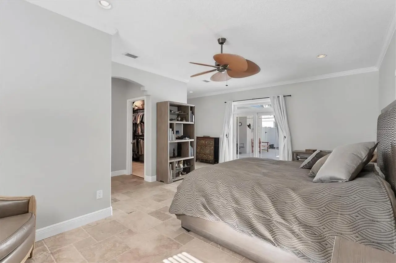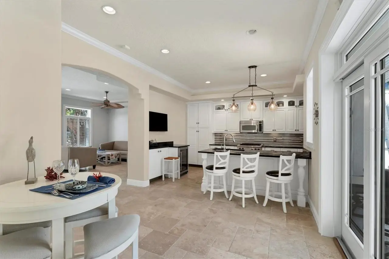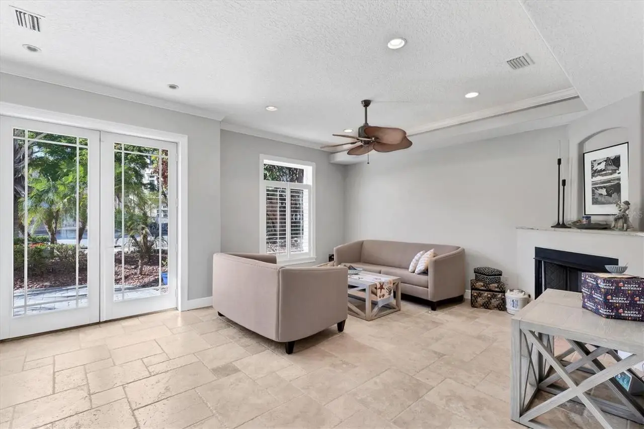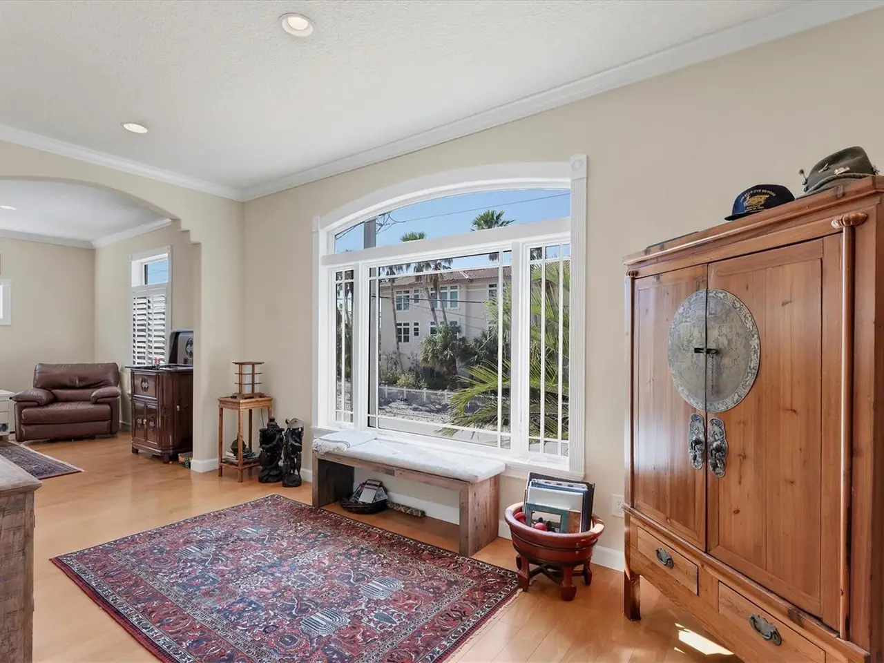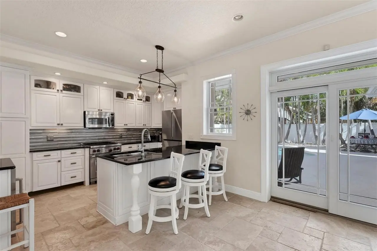 Location, location, location! This beautiful custom home in West Wind Shores is just across the street from the beach and minutes from Anna Maria Island. With an oasis-like backyard and swimming pool, this property offers the ultimate coastal lifestyle. Custom features abound, including high ceilings, arched entryways, travertine flooring, plantation shutters, 5-inch baseboards, recessed lighting, and large walk-in closets. As you enter through the front French doors, you're greeted by a cozy main living area complete with a gas fireplace. To the right, a versatile bonus space awaits, ideal for a dining area or hobby room. The thoughtfully designed split floor plan flows seamlessly, offering two primary bedrooms-one on each floor. The kitchen is a chef's delight, featuring granite countertops, custom cabinetry, newer Bosch appliances, including a Wolf gas stovetop with electric Wolf oven (rare on the island), a breakfast bar with pendant lighting, a glass-tiled backsplash, a wine refrigerator, and elegant travertine flooring. The downstairs primary suite overlooks the pool and offers ample space and luxurious details, including an oversized marble-tiled shower with a glass enclosure, dual sinks, extra storage, and a makeup/dressing table. Upstairs, the second primary suite boasts a large walk-in closet, an ensuite bath, and double doors leading to a loft area with large, picturesque windows that invite you to relax with a book in the afternoon light. The third bedroom is currently being used as an office, complete with built-in bookshelves and a Murphy bed for added flexibility. Sliding glass doors lead to a backyard oasis featuring palm trees, a pergola, a partially covered paver patio, and a completely fenced-in yard. The heated pool and outdoor kitchen, complete with a gas fireplace, create the perfect setting for entertaining. The space is wired for cable, allowing you to enjoy your favorite games while lounging or barbecuing. For pet lovers, there is a separate fenced area and a convenient storage shed. This custom home combines luxury, comfort, and an unbeatable location near the beach and Anna Maria Island. Convenient and complimentary trolley across the street. Walk across the street for sunset every night on the other side of a tall building complex. Don't miss your chance to own this coastal retreat