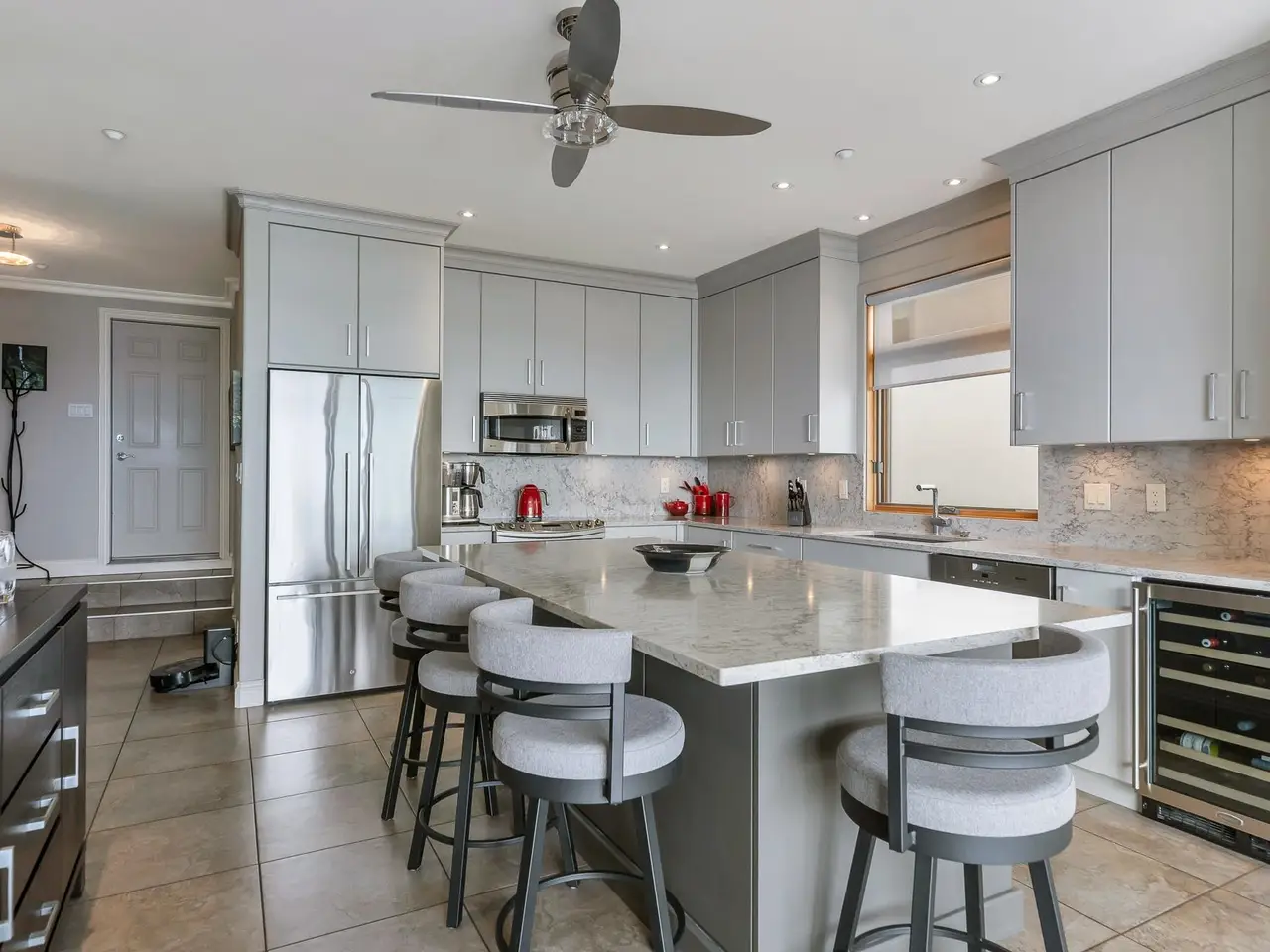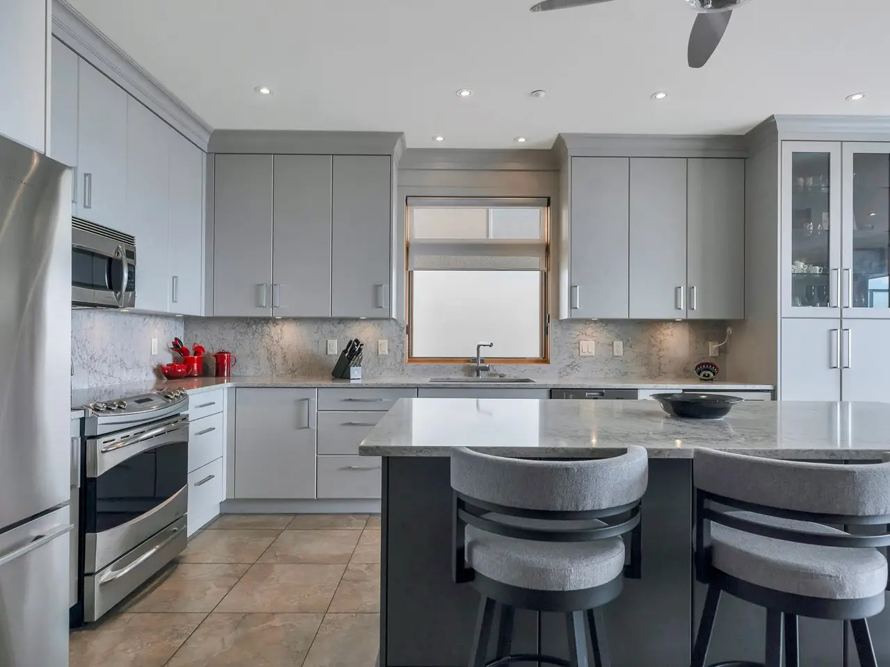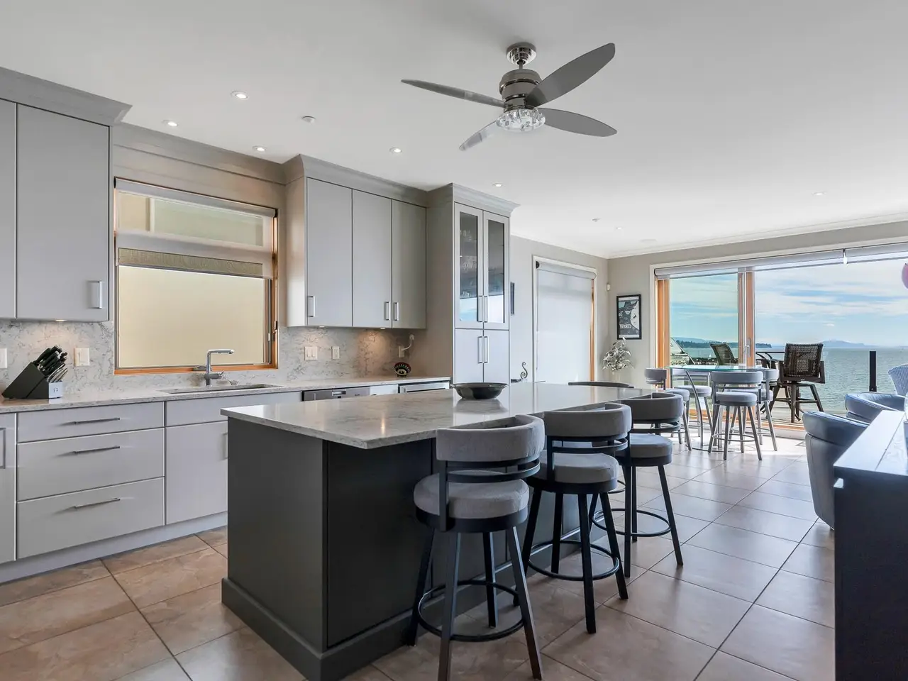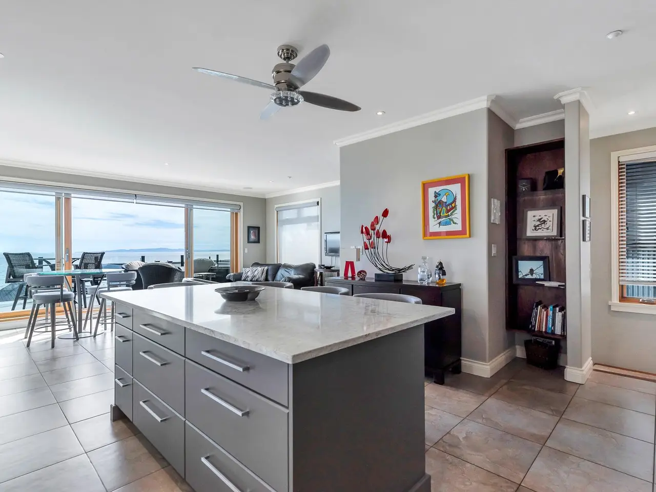 Ocean view updated 3 bedroom hillside home with 2 bedroom legal suite with separate access & laundry and great parking. Quality built home with hot water radiant heat for all 3 levels with 5 zones, low maintenance hardie plank siding. wood metal clad windows & sliding doors, 9' ceilings, tiled floors on the main floor with double 4' sliding doors leading to spacious ocean view deck featuring 2 cm porcelain tiles complimented with topless railings & privacy screens both sides of the deck. Some extra feature include wood interior doors and trims, tall baseboards, crown and detailed ceilings, gorgeous updated kitchen with cabinets to the ceiling complimented with stainless steel appliance package, quartz countertops, backsplash & matching island/breakfast bar with storage. Bonus media room!