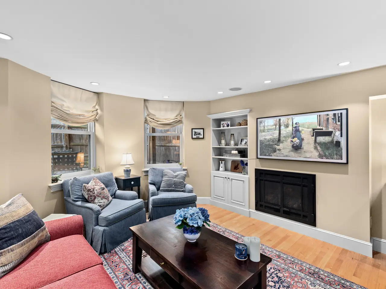 Located on picturesque Braddock Park, this bright and sunny garden-level duplex offers a large private patio—perfect for entertaining or relaxing outdoors. The open floor plan features a chef’s kitchen, dining area, and living room with gas fireplace and custom built-ins. The upper level includes two oversized bedrooms with a primary en-suite bath and built-ins. The second bedroom offers a built-in Murphy bed and ample storage. Additional features include in-unit laundry, hardwood floors, radiant heat, A/C, and a sound system on the first floor. Ideally located near South End restaurants, Prudential Center, Back Bay, SW Corridor, Titus Sparrow Park and playground, dog park, and public transit.