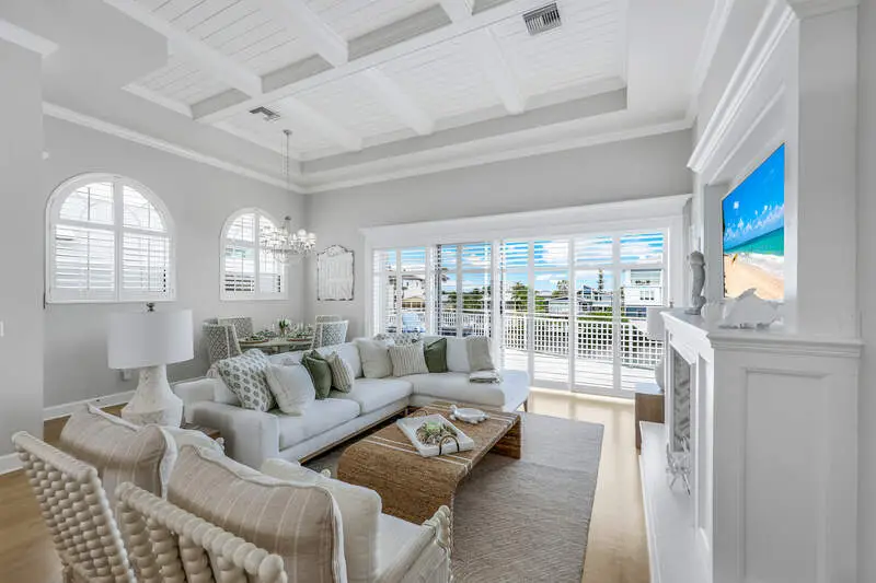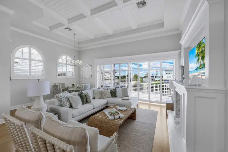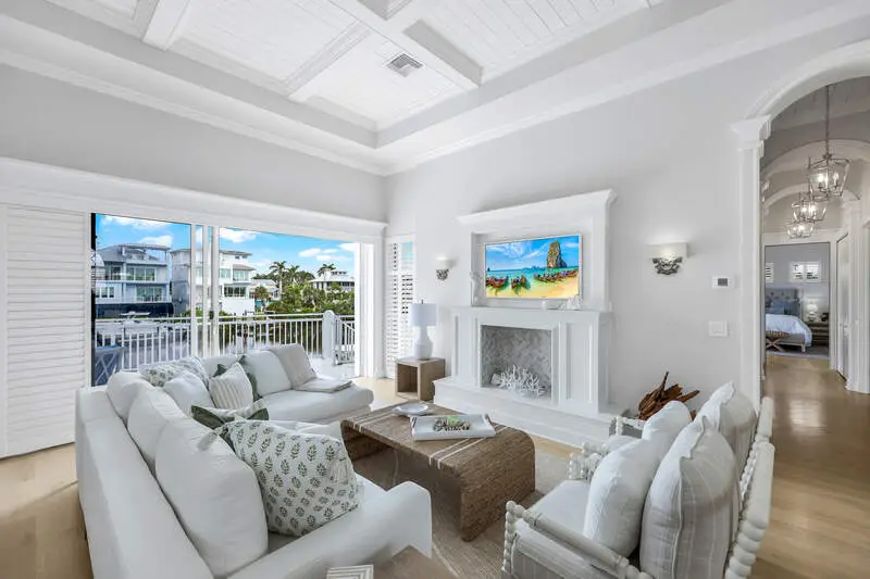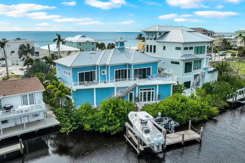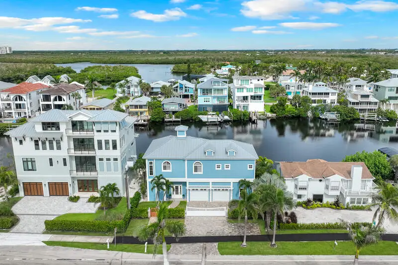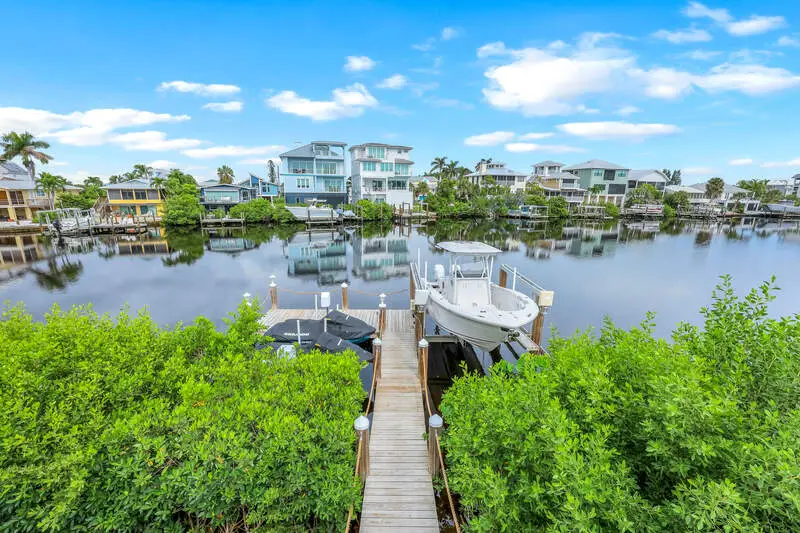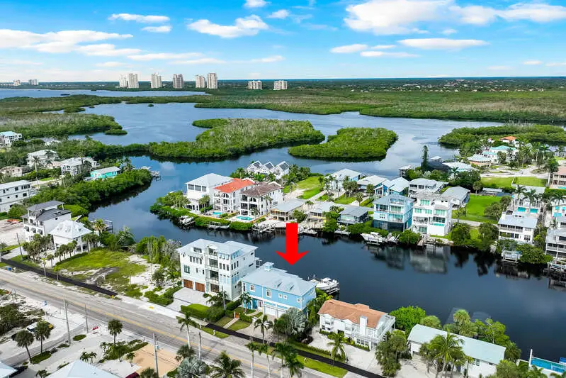 Steps from the white sand beaches and your backyard boat dock, this coastal retreat offers immediate enjoyment of the Gulf of Mexico in a prime Bonita Beach location. A NEW METAL ROOF in 2025, and dock newly fitted with lifts for jets skis and your private boat with 10,000-pound hydraulic lift. This exceptional elevated coastal home offers the best of both worlds with immediate beach and boating access, fully furnished and ready for season 2025-26! Enjoy water views from every room in the home, expansive outdoor living space, and private yard and driveway with extra parking and gated access. The light-filled interior offers architectural refinement and an ease of living. A modern kitchen is open to the great room with fireplace, dining area, and pocketing sliders to the waterfront balcony. The spacious primary bedroom and 3rd bedroom/office each open to the outdoor living allowing for ultimate enjoyment of this premier location. A third en suite bedroom offers a serene guest retreat. The recently reimagined downstairs encompasses an enclosed 1100 sq ft 3-car garaged and additional 950 sq ft of air-conditioned bonus living/rec room that opens to the lanai space and boat dock. Situated in the heart of Bonita Beach, you are just steps from the areas popular restaurants, the bay waters, and the pristine beaches. This home is a must-see, offering character, charm, and sophistication coupled with an unparalleled lifestyle in one of southwest Florida's most desirable beach locations.