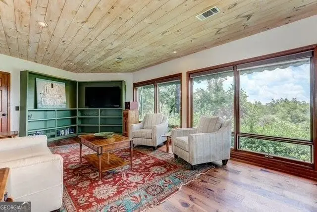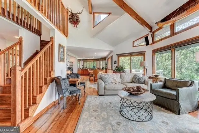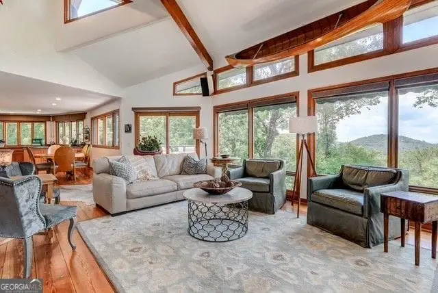 This is the GA mountain retreat you have been looking for! It is a spectacular custom Home nestled in the mountains of Big Canoe. Enjoy short and long views as far as the Atlanta Skyline. Artist/Architect designed, this home with its open floor plan, seamlessly integrates nature into every corner. Antique pegged wide-pine floors, exposed beams, and abundant windows create a bright and inviting atmosphere. Step outside to admire the beautiful gardens and pet-friendly yard, complete with several private patio areas perfect for outdoor entertaining. Remote control awnings over the living room windows ensure optimal outdoor exposure. Too many special features to mention. You must see it to appreciate the craftmanship. Welcome to your new mountain retreat with a private view from 'every' angle. Welcome to North Georgia and the southern point of the Appalachian Trail.