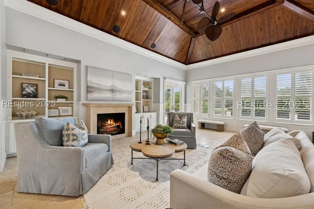 Set along Osprey Lake in Colleton River, this stunning residence offers over 5,000 sq. ft. of refined Southern living with 5 bedrooms and 5.5 baths. The thoughtful floor plan places three en suite bedrooms on the main level, complemented by spacious living areas finished with limestone and heart pine floors, exquisite moldings, and timeless architectural detail. The chef's kitchen is a true centerpiece, showcasing a Sub-Zero refrigerator, Wolf cooktop, and granite and slate counters throughout. Just beyond, a screened porch extends the living space outdoors, where a private pool, covered poolside bar with grill and TV, and a fully fenced backyard create an ideal entertaining retreat, perfect for gatherings or simply enjoying the Lowcountry lifestyle. Two separate stairwells lead to private upstairs retreats, each with a bedroom and full bath. These versatile spaces provide endless possibilities, serving as guest suites, home offices, media rooms, gyms, or even a golf simulator. A walk-in attic with 1,500+ sq. ft. of storage and an oversized three-car garage add everyday practicality. Every detail of this home has been designed with intention, offering a rare combination of craftsmanship, comfort, and livability. From formal entertaining to casual gatherings by the pool, this Colleton River residence is as versatile as it is timeless.