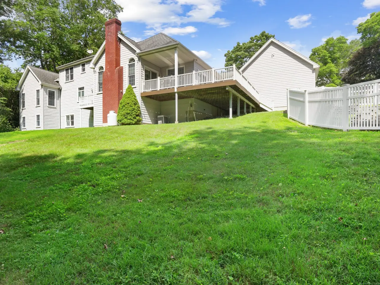Stunning 5,000-plus square foot custom Ranch/Cape on 2.25 private acres at the end of a quiet cul-de-sac in central Woodbridge. Enter the home through a circular driveway and enjoy views of woods and a nearby golf course. Bright open floor plan with cathedral ceilings, large windows, wraparound Trex deck and beautiful light. Chef's kitchen with AGA Elise induction range (3 ovens) plus two more ovens and walk-in pantry. Family room off kitchen features a dramatic stone fireplace. Five beds, five baths, library, home office, guest suite, plus a luxurious primary bedroom with his and her custom walk-in closets, whirlpool tub, and separate shower. Finished walk-out lower level with game room, bath and au pair setup. Upstairs: 2 more bedrooms share a Jack and Jill bath, with room to expand living space. Five-car garage total - two attached and three-car heated detached garage with lift-height ceilings and loft. New Buderus furnace, 53-gallon hot water heater, Generac generator, EV charger, fiber internet, central vacuum, two large propane tanks and security system. In-ground pool and landscaped yard. Award-winning public schools, plus private schools nearby. Just 20 minutes to downtown New Haven, Yale and Sikorsky. Easy access to Bradley airport (1 hour) and Metro North to NYC (2 hours). A unique blend of elegance and comfort. A rare opportunity. Job relocation is the only reason this home has become available. Total heated living area is 7,734 which includes the walk out lower level. Lower level has a bedroom/office, bath, game room and gym.