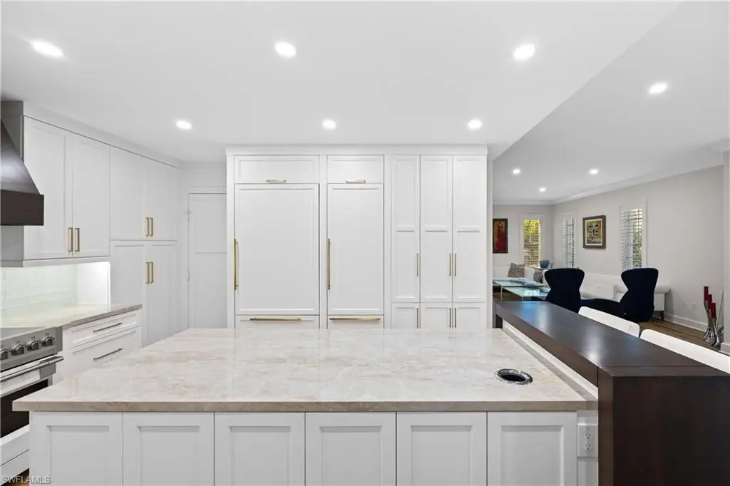 Welcome to Chatham Place, an exclusive enclave of just 16 residences where southern charm meets modern luxury. Nestled in a serene setting adorned with fountains, courtyards, lush gardens, wrought iron fences, and inviting balconies, this exquisite three-story villa seamlessly blends timeless elegance with contemporary comforts. The home features a spacious open floor plan, an oversized two-car garage, and a private elevator servicing all levels. Every detail has been carefully considered, from the luxury flooring on all levels to the beautifully renovated kitchen and bathrooms. Custom closets in every room, plantation shutters, and impact-resistant windows and doors further enhance the home's sophisticated design. At the heart of the home is the stunning, newly renovated kitchen, a true culinary masterpiece. Custom cabinetry, rare Dekton countertops, top-of-the-line appliances, in counter wine chiller, custom tile backsplash, and a walk-in pantry combine to create a space exceeding all expectations. The kitchen flows effortlessly into the expansive great room and dining area, where walls of windows bathe the interiors in natural light. Glass doors open to reveal an extraordinary private outdoor oasis, offering a one-of-a-kind living experience. This unparalleled space invites you to enjoy evenings by the fire, prepare meals in the outdoor kitchen, and relax in the warmth of the outdoor fireplace while soaking in the heated spa. Efficiency and convenience abound, including a tankless hot water heater and large upper-level laundry center. The second level is equally impressive, with two ensuite guest rooms. The third level primary suite provides the ultimate retreat, with a generous walk-in closet outfitted with custom cabinetry, a private balcony, and an adjoining den, perfect for a home office or relaxation. Chatham Place is a pet-friendly community offering the perfect balance of tranquility and accessibility. Within walking distance, you'll find the vibrant 3rd Street South and 5th Avenue South districts, brimming with dining, shopping, and cultural attractions. The pristine Gulf beaches are also just steps away, adding to the allure of this exceptional property. This villa is a rare gem, combining timeless charm with unmatched luxury and a higher elevation than most in Olde Naples with no hurricane damage.