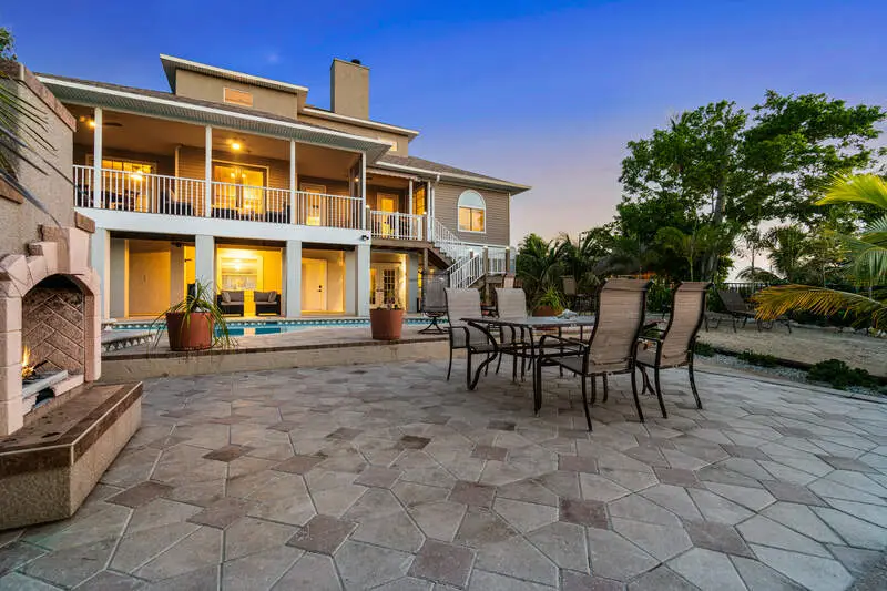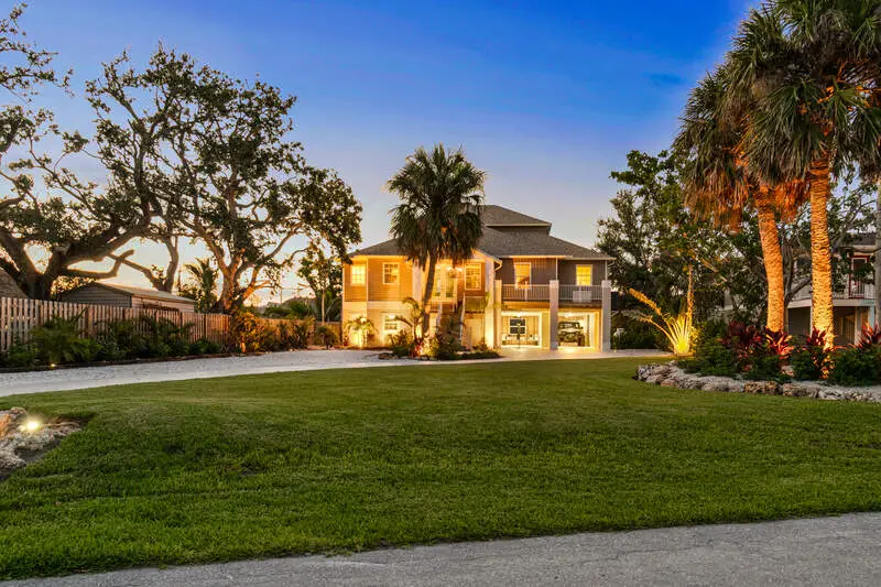 Stunning coastal retreat with breathtaking water views, nestled on an oversized lot on Fort Myers Beach. Just a short 5-minute walk to the beach, it's a true sanctuary for beach lovers and boating enthusiasts alike-complete with direct Gulf-access from your private dock featuring a 10,000 lb lift and canopy. The resort-style backyard is designed for both relaxation and entertaining, with a spacious screened-in second-floor balcony, large pool, spa, and multiple lounge areas-including your own private beach oasis. Inside, the open-concept floor plan is equally impressive with 3 bedrooms & a den, soaring 21-foot ceilings, beautiful wood-look flooring, and a charming wood-burning fireplace. The chef's kitchen has a unique modern design featuring wood-paneled ceilings, sleek steel accents, stainless-steel appliances, and a professional-grade 8-burner gas stove. The expansive primary suite is a true retreat with its own attached den/seating area and a spa-like bathroom offering dual rainfall shower heads, dual vanities, and a deep soaking tub. Upstairs, you'll find a spacious loft area that makes for the perfect media lounge. Additional highlights include versatile ground-floor flex space, a whole-house generator, and room to add a private elevator. Ideally situated on a quiet stretch of Estero Island, this extraordinary home is just minutes from fantastic restaurants and offers easy access to Lovers Key and Bonita Beach.