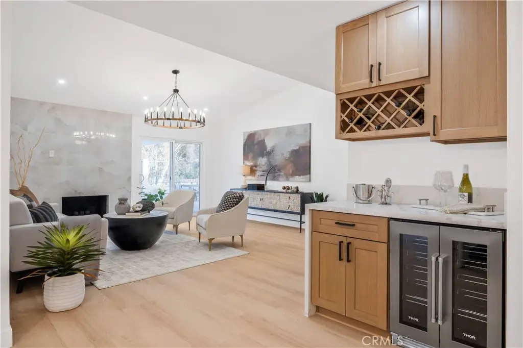 This beautifully renovated single story home sits on a quiet cul de sac in Mission Viejo and perfectly blends modern upgrades with style and functionality. Every detail has been thoughtfully designed, from energy efficient systems to designer finishes, making it a truly move in ready residence. Inside, high end waterproof hybrid laminate flooring flows seamlessly throughout, accented by modern baseboards, fresh paint, updated outlets, switches, hardware, and energy efficient LED recessed lighting. The fully remodeled gourmet kitchen showcases custom white and oak Shaker cabinetry with soft close drawers, quartz countertops with a full height backsplash and waterfall edges, ceiling height cabinets, touchless sink with pot filler, and professional grade appliances including a 36" 6 burner Thor gas range, Thor drawer microwave, Thor wine fridge, GE Profile double drawer dishwasher, Samsung refrigerator, and sleek range hood. An elegant farmhouse chandelier and updated fireplace bring warmth to the family room, while new hallway cabinetry and a high capacity washer dryer with overhead storage add convenience. The primary suite offers a spa like retreat with a walk in shower featuring oversized shampoo niches, double vanities with quartz counters, soft close cabinetry, and upgraded fixtures. All bathrooms have been fully remodeled with modern cabinets, countertops, faucets, mirrors, and low flow toilets. Each bedroom has new flooring, baseboards, paint, and lighting for a fresh, modern feel. Additional smart home features include a Nest thermostat, Ring camera doorbell, and a full PEX repipe for added peace of mind. The private backyard is fully enclosed, perfect for pets and children, and offers serene mountain views with no neighbors behind. A stylish maintenance free privacy fence with lush greenery enhances the outdoor living space. The finished two car garage has been freshly drywalled, painted, and upgraded with epoxy flooring. Residents also enjoy exclusive access to Lake Mission Viejo, featuring sandy beaches, swimming, boating, fishing, a clubhouse, and year round events. With no Mello Roos, a low HOA, and a prime location, this turnkey single story is a rare opportunity in one of Mission Viejo's most sought after neighborhoods.