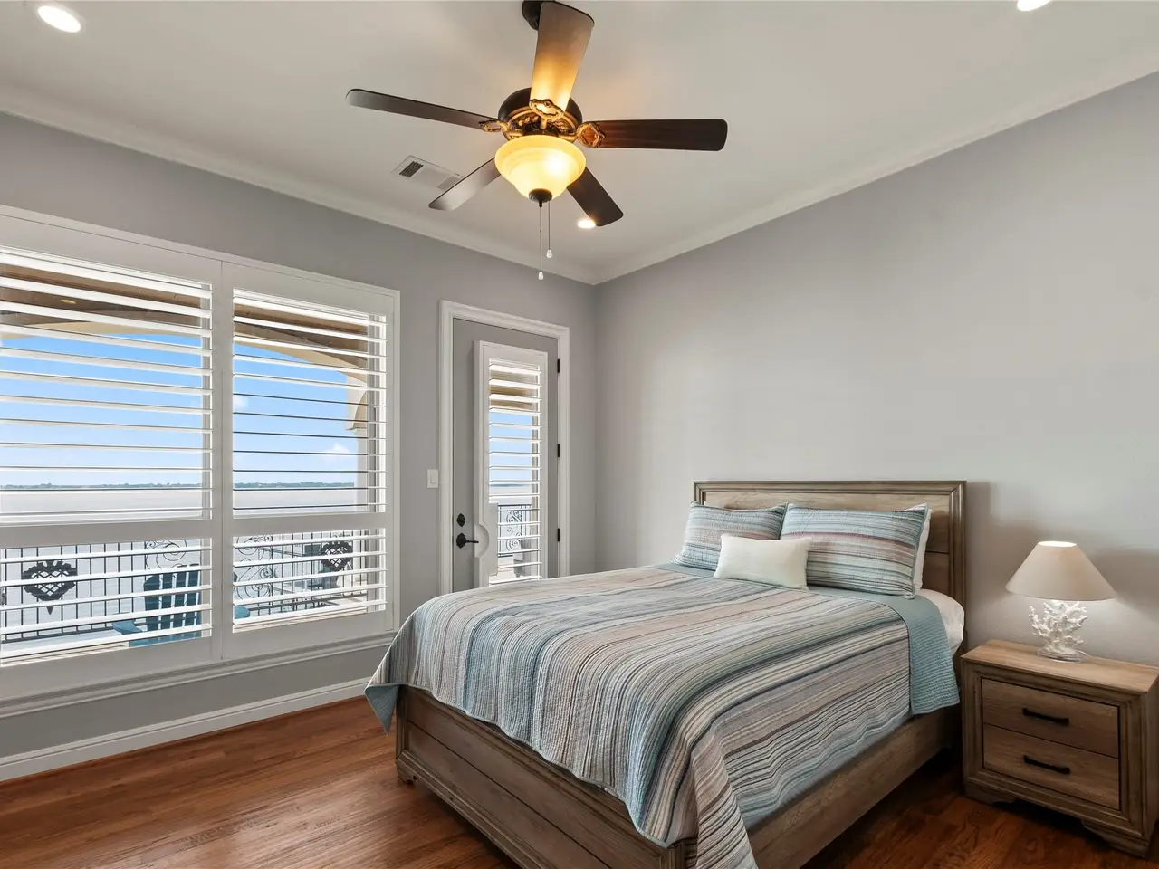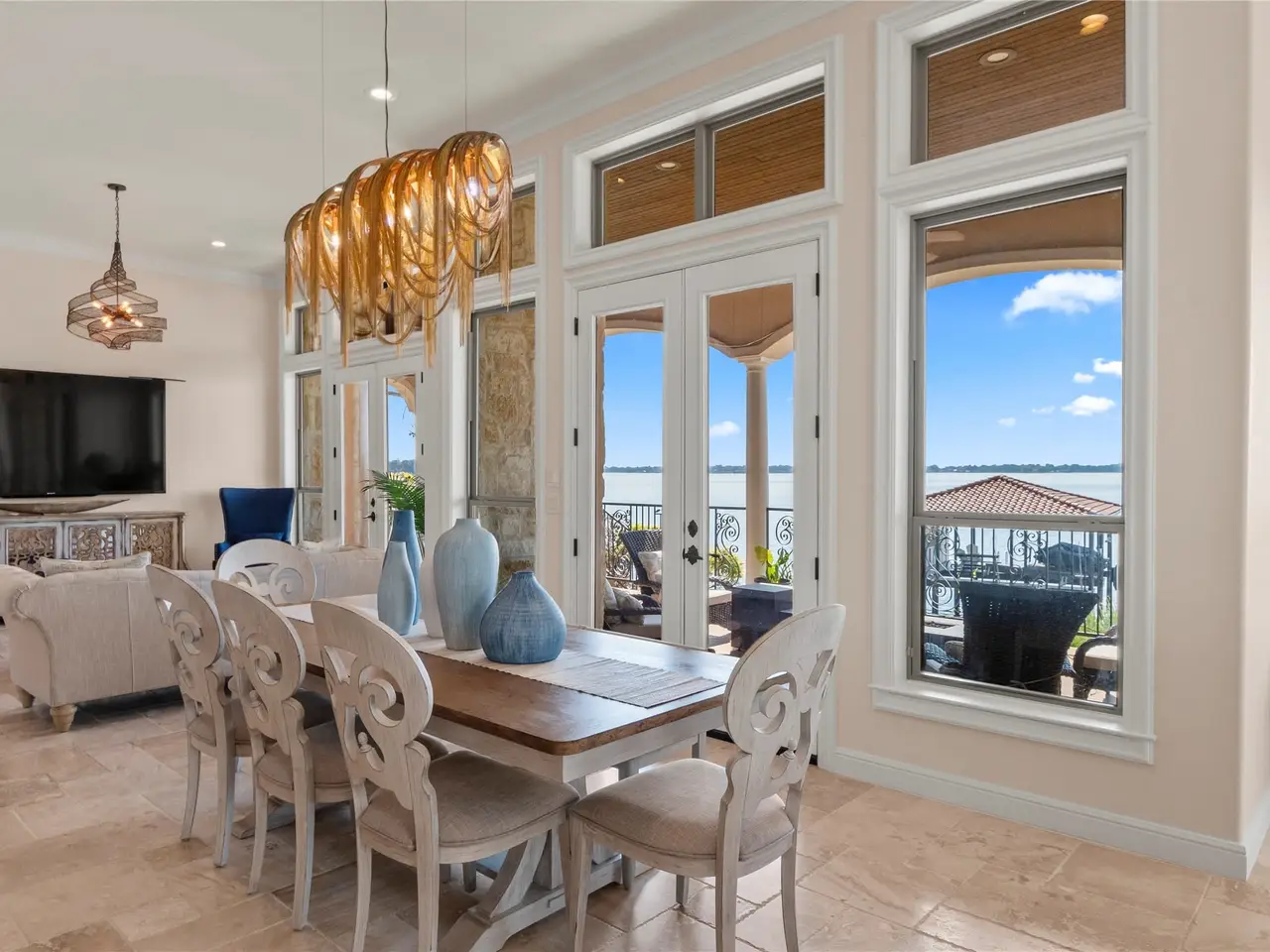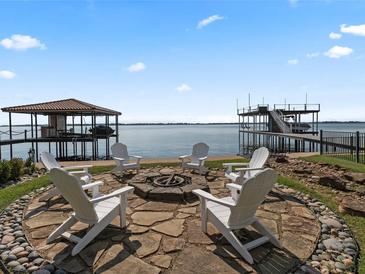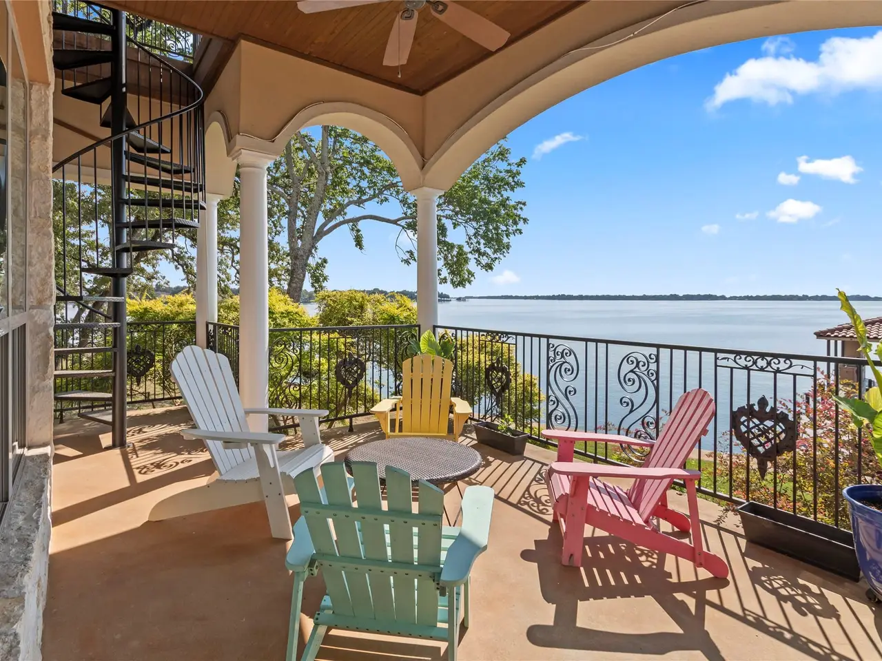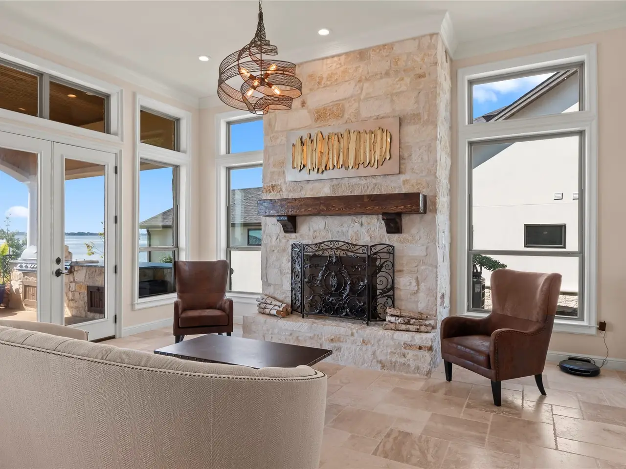This stunning 2018 home, inspired by the timeless elegance of a Tuscan villa nestled in the foothills of Italy, offers 5,570 sq ft of refined waterfront living on a half-acre lot with 94 feet of open water frontage in the prestigious Pinnacle Golf Club at Cedar Creek Lake. Located in one of the most sought-after areas of the community, it's within walking distance to the clubhouse, restaurant, pool, and fitness center - and perfectly positioned next to the annual July 4 Pinnacle fireworks show for front-row lakeside views. Designed for both luxury and livability, the home features 5 bedrooms, 6 baths, 3 living areas, an office, exercise room, and a 3-car garage. A grand foyer welcomes you with a winding staircase, inlaid tile, chandelier, and sweeping lake views that instantly transport you to a Mediterranean retreat. The main living area is anchored by a stone fireplace and wet bar, flowing into a dining space with butlers pantry into a second spacious living area. The gourmet kitchen boasts a Thermador 6-burner gas range with pot filler framed in stone, Thermador fridge, custom cabinetry, and walk-in pantry. The waterside primary suite features soaring ceilings, plantation shutters, dual vanities, jetted soaking tub, walk-in shower, and two spacious closets. A private office and two full guest baths, including one with outdoor access, complete the main floor. Upstairs offers four bedrooms - two with en suite baths - and a private guest suite with its own living area. A bonus room with wet bar and balcony, plus an exercise room and full bath, create more space to unwind. Outdoor living includes a firepit, full-length balcony with composite decking, and kitchen with griddle and sink. The boathouse offers a boat slip, dual PWC lifts, and a covered seating area. Ownership includes social membership with clubhouse dining, pool, fitness center, tennis and pickleball; golf memberships available separately