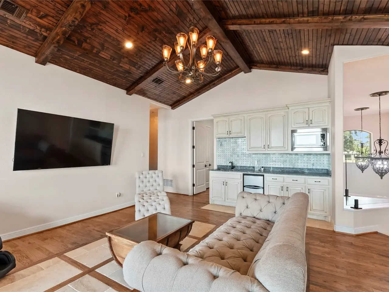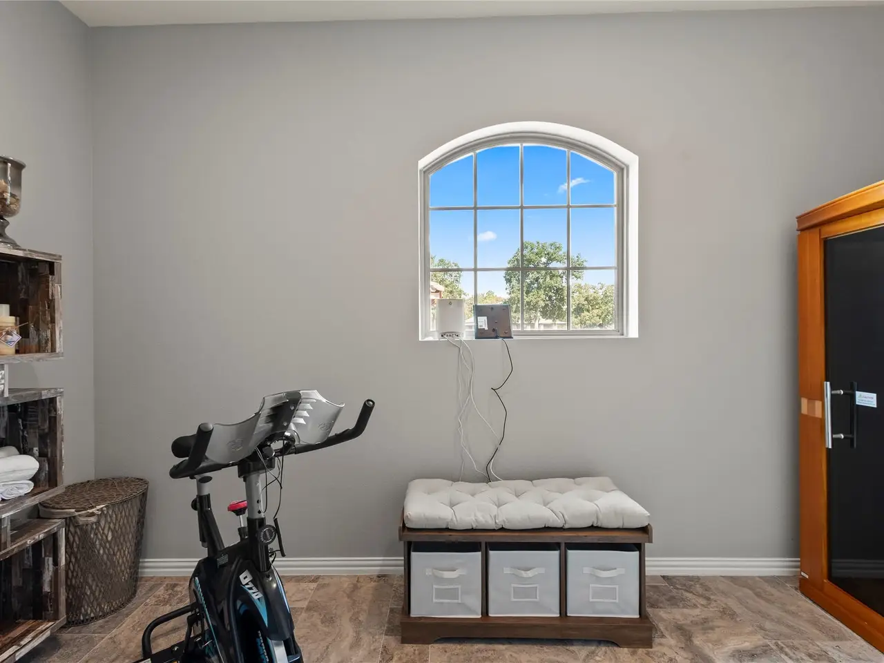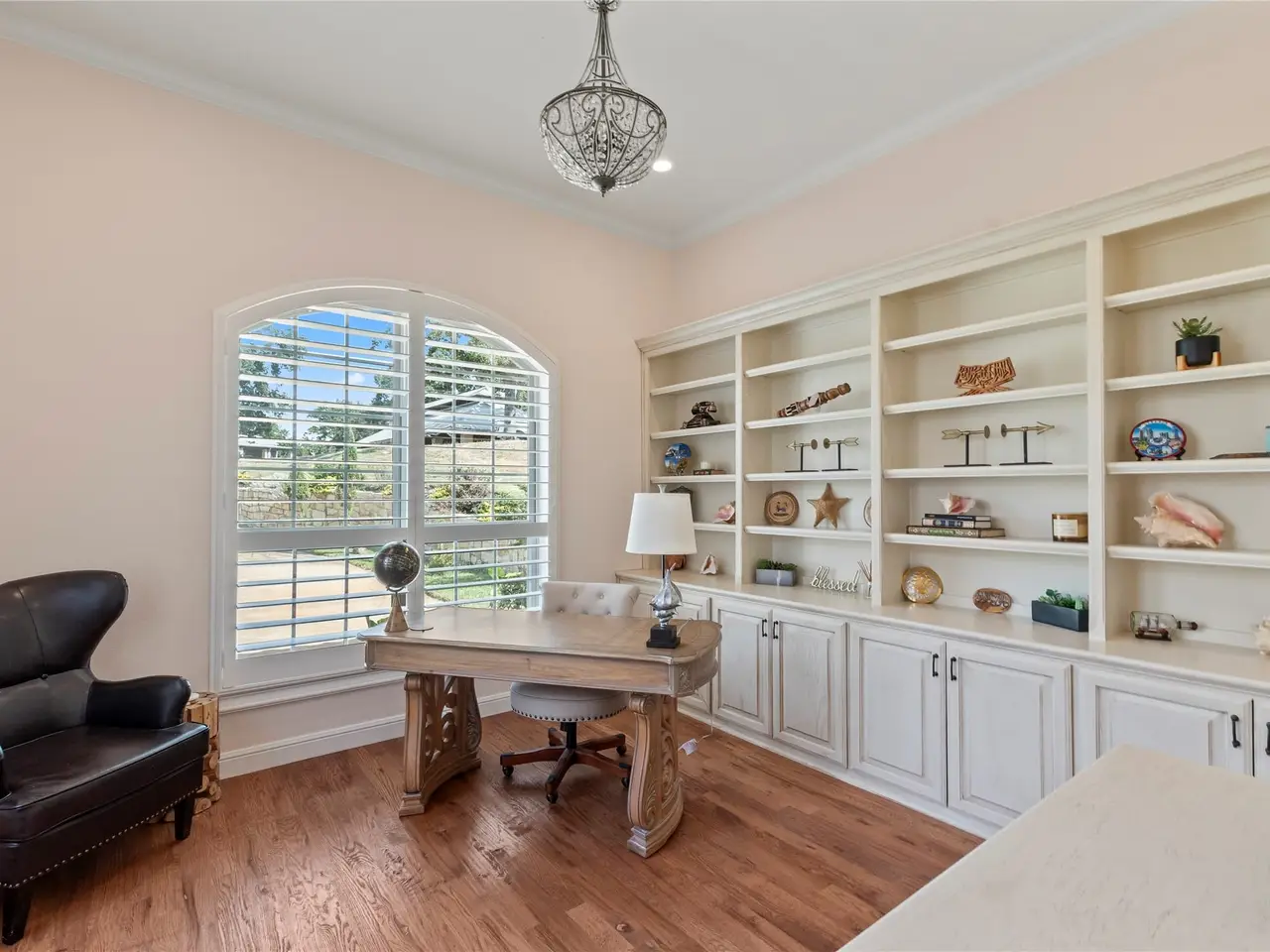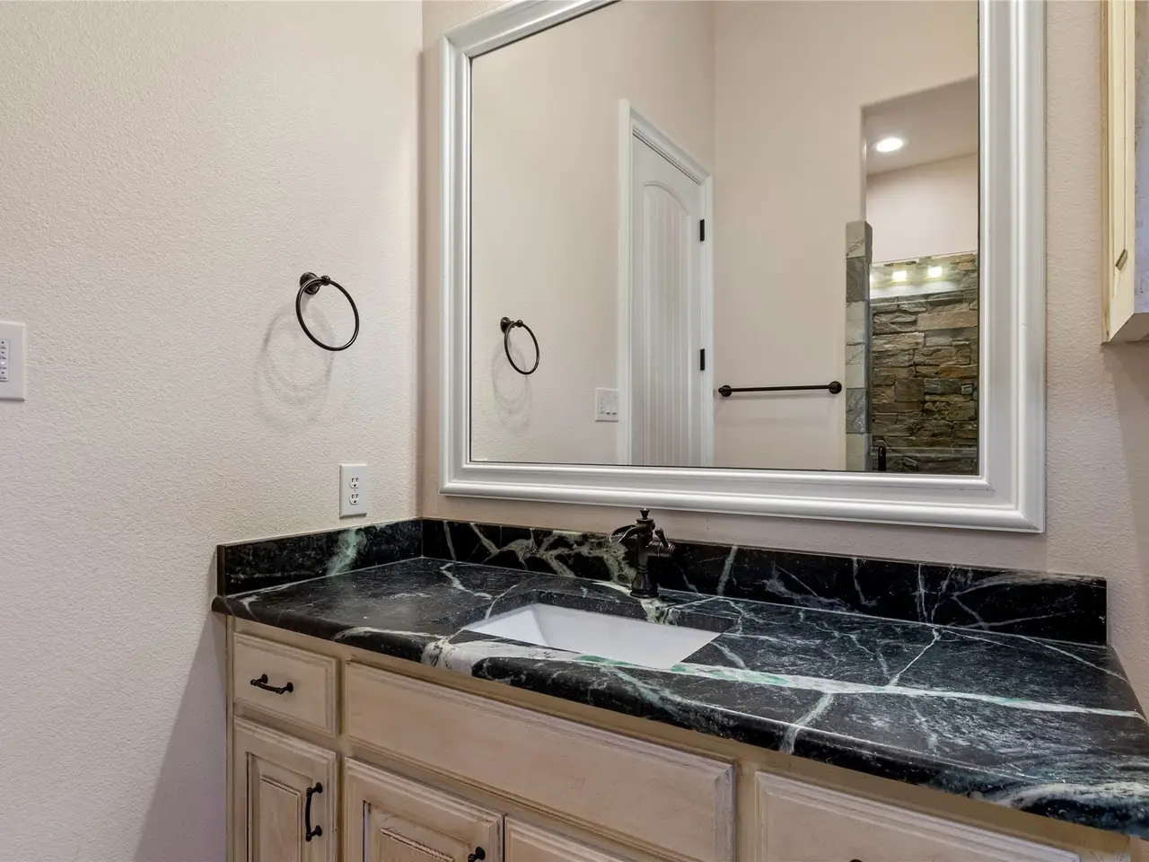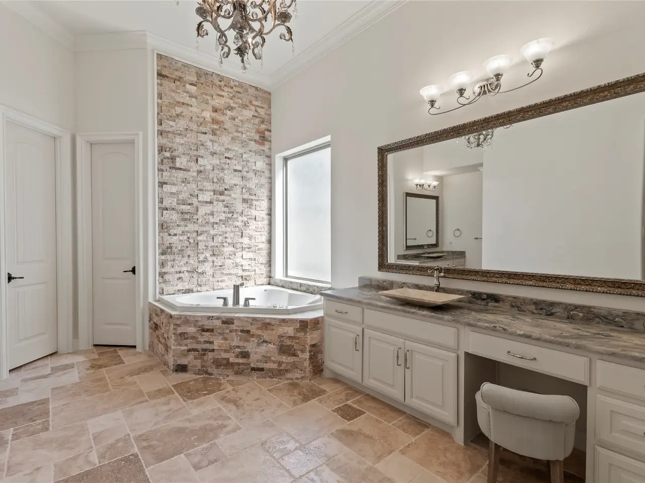 This stunning 2018 home, inspired by the timeless elegance of a Tuscan villa nestled in the foothills of Italy, offers 5,570 sq ft of refined waterfront living on a half-acre lot with 94 feet of open water frontage in the prestigious Pinnacle Golf Club at Cedar Creek Lake. Located in one of the most sought-after areas of the community, it's within walking distance to the clubhouse, restaurant, pool, and fitness center - and perfectly positioned next to the annual July 4 Pinnacle fireworks show for front-row lakeside views. Designed for both luxury and livability, the home features 5 bedrooms, 6 baths, 3 living areas, an office, exercise room, and a 3-car garage. A grand foyer welcomes you with a winding staircase, inlaid tile, chandelier, and sweeping lake views that instantly transport you to a Mediterranean retreat. The main living area is anchored by a stone fireplace and wet bar, flowing into a dining space with butlers pantry into a second spacious living area. The gourmet kitchen boasts a Thermador 6-burner gas range with pot filler framed in stone, Thermador fridge, custom cabinetry, and walk-in pantry. The waterside primary suite features soaring ceilings, plantation shutters, dual vanities, jetted soaking tub, walk-in shower, and two spacious closets. A private office and two full guest baths, including one with outdoor access, complete the main floor. Upstairs offers four bedrooms - two with en suite baths - and a private guest suite with its own living area. A bonus room with wet bar and balcony, plus an exercise room and full bath, create more space to unwind. Outdoor living includes a firepit, full-length balcony with composite decking, and kitchen with griddle and sink. The boathouse offers a boat slip, dual PWC lifts, and a covered seating area. Ownership includes social membership with clubhouse dining, pool, fitness center, tennis and pickleball; golf memberships available separately