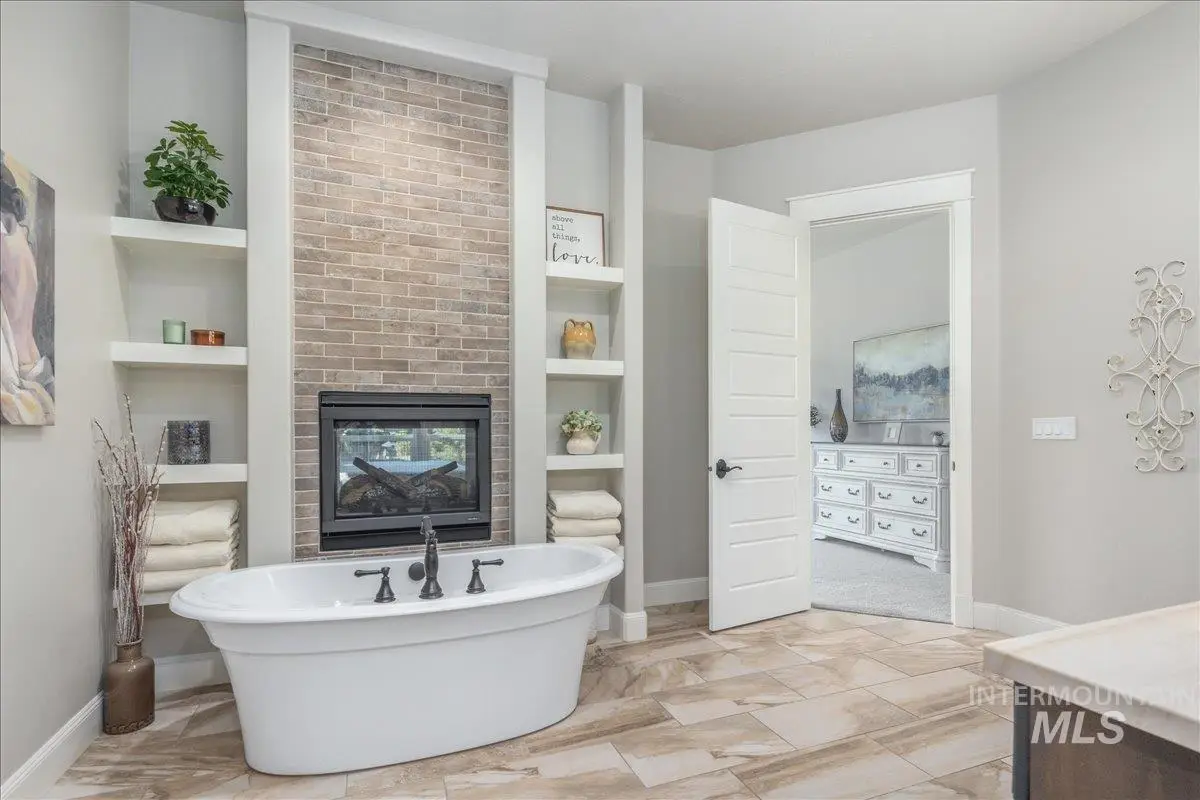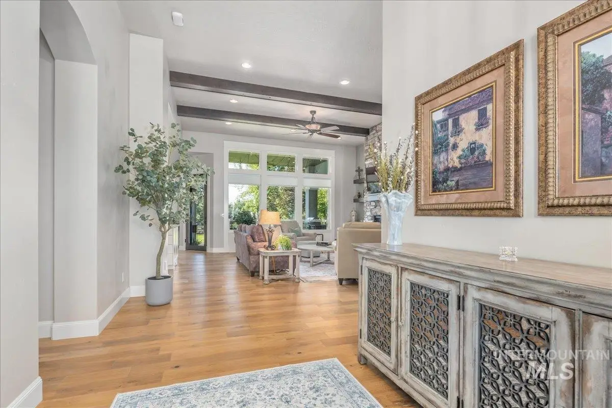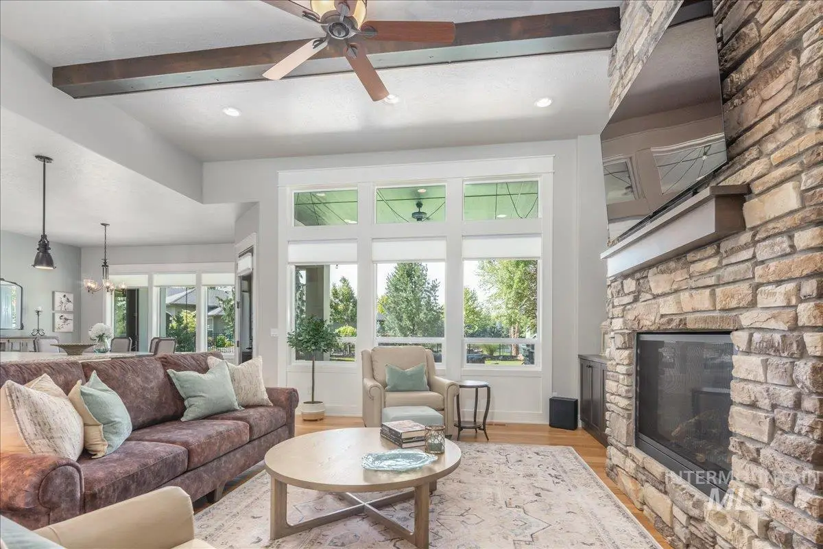 One of Eagle's most prestigious gated communities--Mace River Ranch Estates. Set on a spacious .63-acres, this custom-built single level home offers refined luxury with upgrades and designer touches throughout. Features soaring, 18 ft. ceilings with exposed hand-hewn wood beams and expansive great room, anchored by a stunning floor-to-ceiling stone gas fireplace and gorgeous wide-plank hardwood flooring throughout the main living spaces. The gourmet kitchen is a chef's dream, with top-of-the-line Wolf and Sub-Zero appliances, farmhouse sink, custom cabinetry, and generous storage. Retreat to the lavish primary suite featuring a double-sided gas fireplace shared with the spa-inspired upgraded bath with premium finishes including freestanding tub. Additional highlights include: Four-car garage with epoxy flooring & custom built-ins, outdoor BBQ, and full landscaping with new trees, new shrubs, fresh mulch, edging and existing fully fenced yard. Hunter Douglas electric shades & plantation shutters throughout. Upgraded security system, security lighting & 22kw Generac Generator. Central vac, two hot water heaters with recirculating hot water, reverse osmosis system & water softener. Mace River Ranch community amenities including a 40-acre nature preserve, tranquil water features, clubhouse & pool with direct access to the Boise River Greenbelt!