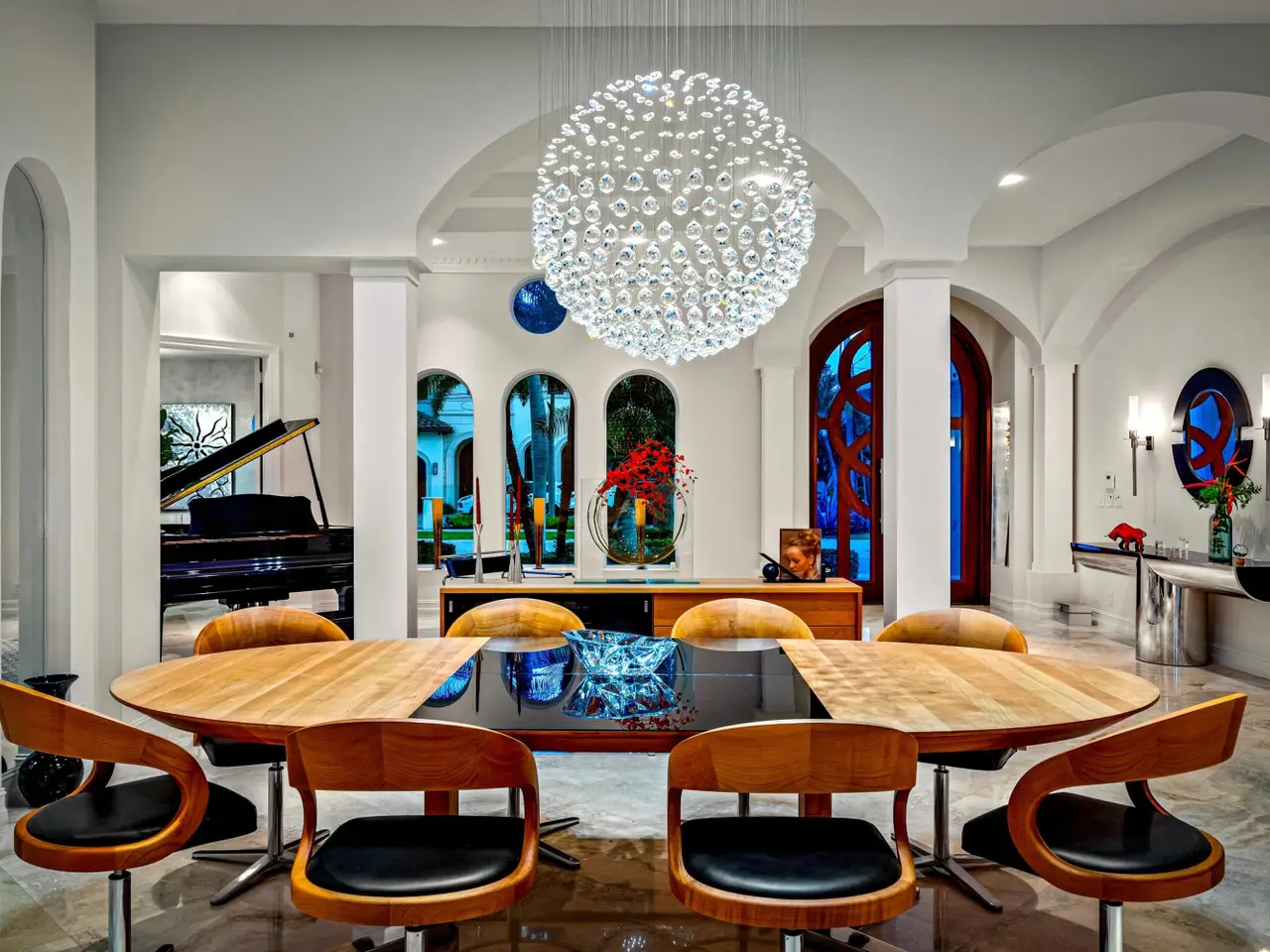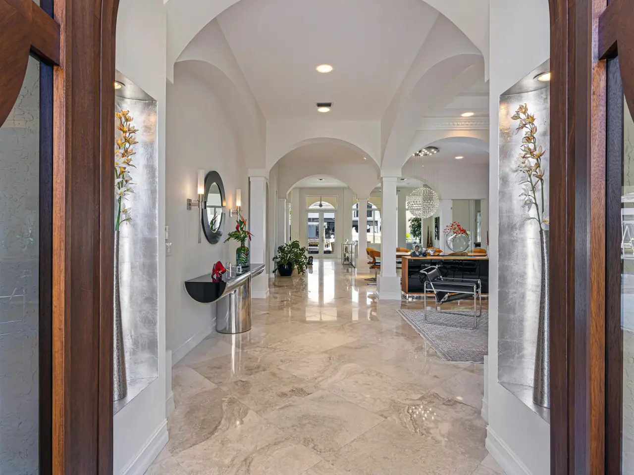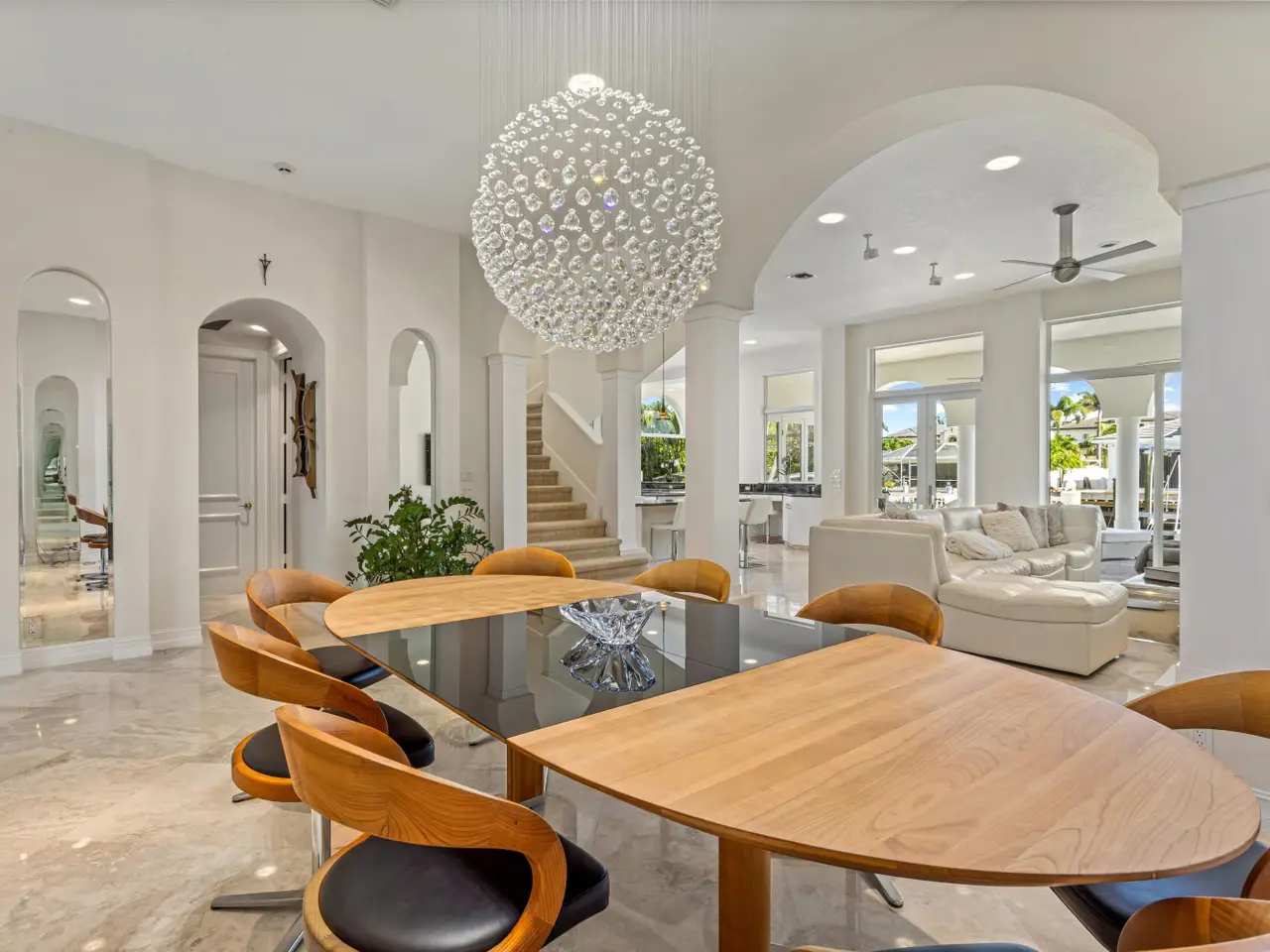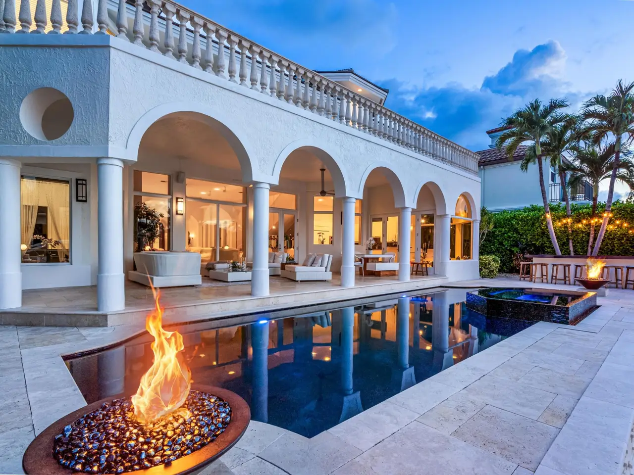 Luxe Boca Raton deepwater estate in the desirable Lake Rogers community fronts 80 feet on a deep-water canal with a dock offering easy ocean access, desirable for boaters. Interiors are peerlessly defined by grand architectural adornments, and the magnificent outdoor entertaining area centers on a sun-splashed pool with a spill-over spa bounded by an expansive patio with a wet bar and barbeque area.
