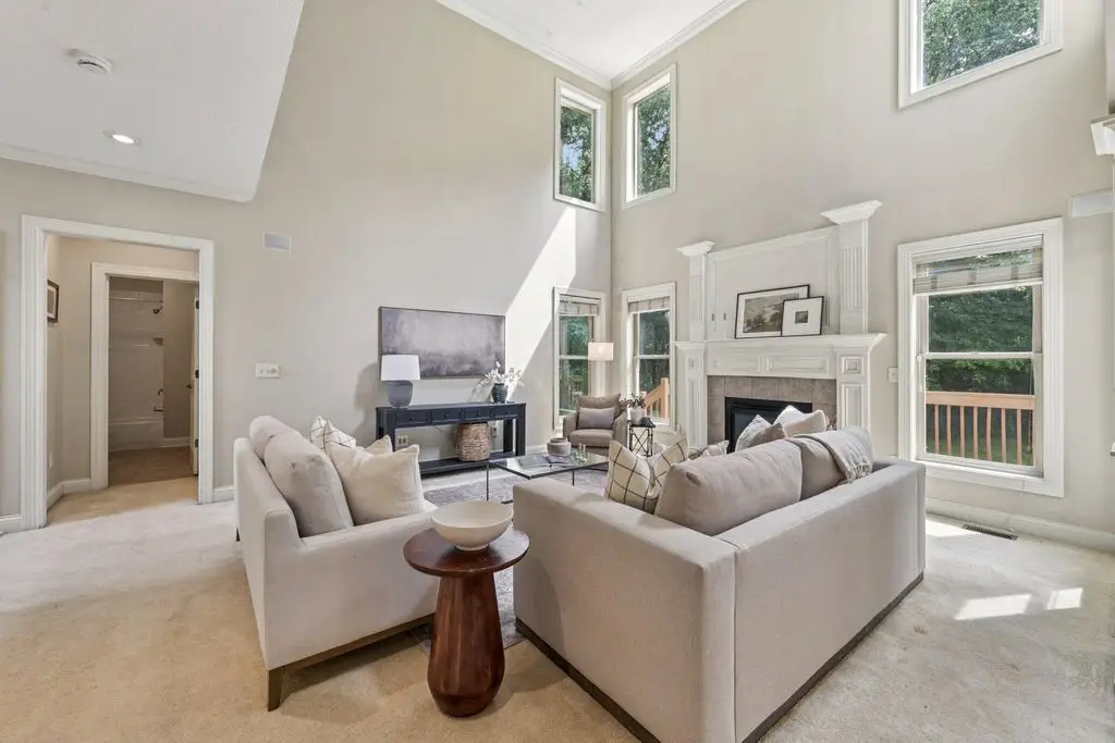 Two-story great room with cozy fireplace