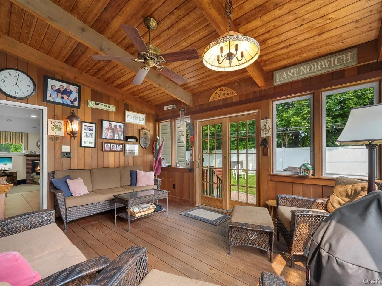Welcome to this beautiful, updated home in one of the most desirable sections of East Norwich. Large expanded cape filled with natural light. This home features a formal living room and dining room, an open and updated eat-in kitchen and a large step down den with cathedral ceilings and fireplace. There is an enclosed patio that offers views of the yard and is a great place to enjoy all four seasons through the walls of windows. There is great flow for entertaining. There is a first floor primary bedroom and a full bath. The second floor has three spacious bedrooms and another full bath. Beautiful yard with outdoor kitchen and hot tub. Convenient to shops, restaurants and schools. Meticulously maintained. This house is a must see!