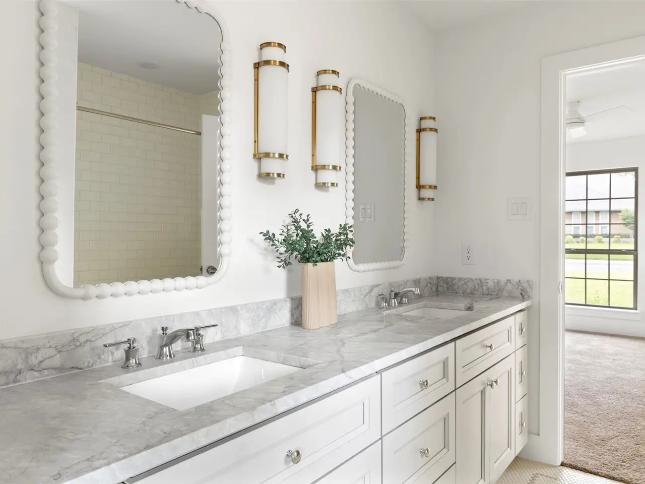 Spa-style bath with double vanities and freestanding tub