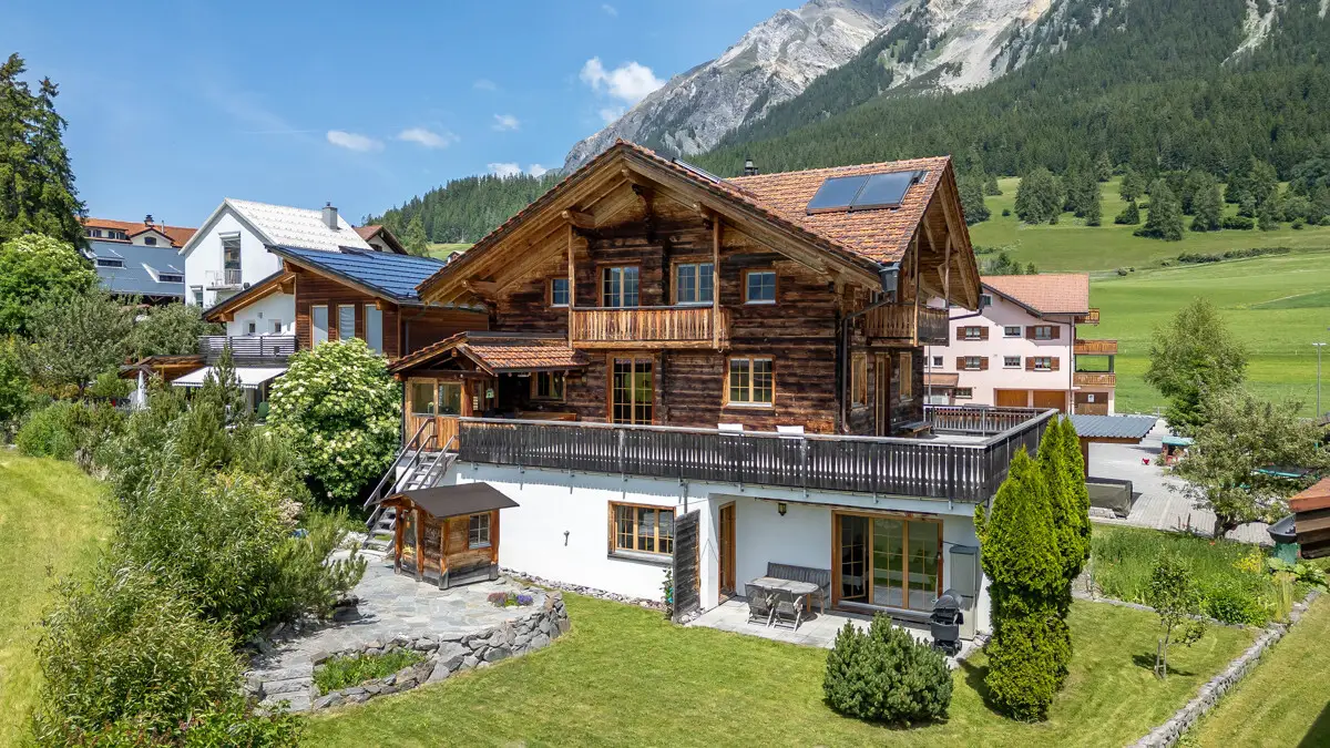 This charming, detached home at the edge of Lantsch/Lenz offers unobstructable views of the Grisons mountains along with sun throughout the day and borders directly onto agricultural and nature conservation zones – perfect for those who value peace, unspoiled countryside, and privacy. The property blends traditional chalet character with contemporary home comforts. The 5.5-room main house spans two levels and features open, light-filled galleries. The separate 3.5-room flat with its own entrance is ideal for guests or for short- or long-term rental. The carefully tended garden with multiple seating areas, the covered terrace, and extensive amount of exterior space provide plenty of opportunity for relaxation, play and social gatherings. Whether as a holiday home, main residence or multigenerational living solution – this prospect is suited to a number of different lifestyles. The house is in excellent condition and ready to move into. Shopping amenities, school and public transport connections to Lenzerheide, Chur and Davos are all within easy reach on foot. Two garage spaces and four outdoor parking spots round off the offer. The property - Approx. 177m² 5.5-room detached house - Self-contained flat extending to approx. 91m² with separate entrance - Large garden with terrace and covered seating area - Directly adjacent to protected agricultural and designated green zones - Two garage spaces and four outdoor parking spots - Long-established secondary residence permit