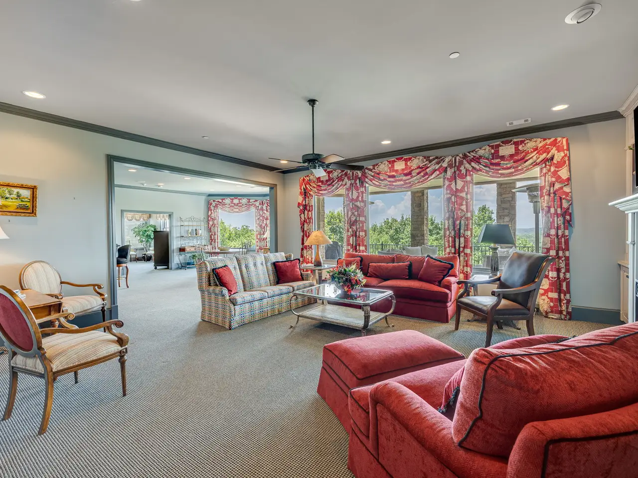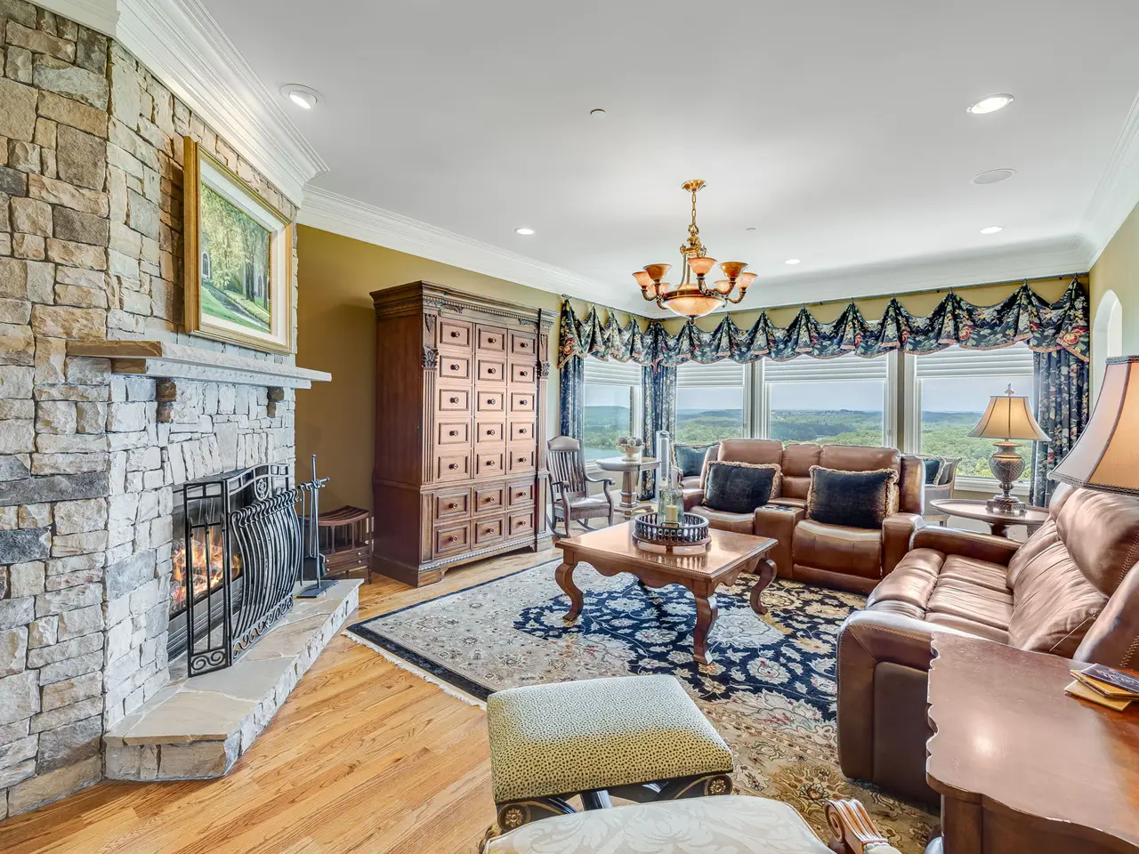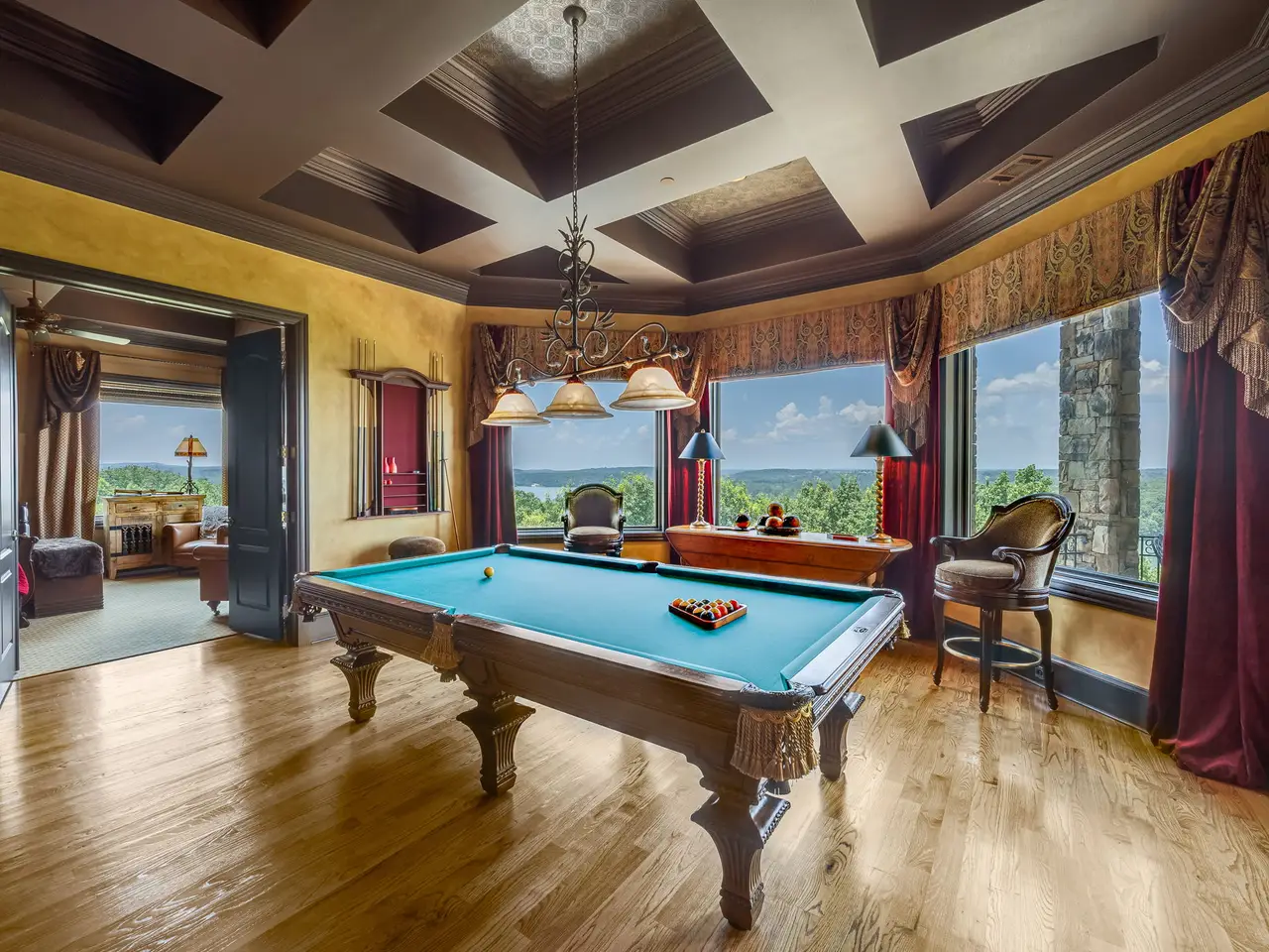 Harbour Point Yacht Club and Marina! A rare opportunity to own a truly exceptional Lake Lanier estate, offered fully furnished with elegant, high-end pieces and ideally positioned on one of the most desirable lots on the lake. Located within the prestigious, gated Harbour Point Yacht Club and Marina community, this custom-built home showcases sweeping sunset views over Lake Lanier and the Blue Ridge Mountains from three expansive verandas. Designed with both luxury and lifestyle in mind, this four-level estate features an elevator, two home offices, and a heated pool and spa. A deeded boat slip is included, offering seamless access to lakefront living. The main level welcomes you with a grand two-story foyer and living room, formal study, and refined dining room. A brand-new custom chef's kitchen is outfitted with a 60" Wolf range with double ovens, Sub-Zero refrigerator, Miele coffee station, and an oversized walk-in pantry. The cozy keeping room features a stone fireplace, and the spacious primary suite includes a spa-like bath and newly designed California Closets. The terrace level is an entertainer's dream, complete with a wine cellar and tasting room, full kitchen and bar, gathering room with fireplace, 10-seat home theater, steam shower, sauna, and private guest suite. The lower poolside level adds even more space for entertaining with a second full kitchen, additional ensuite, gathering room, game room, and fitness room-all opening to the pool and landscaped, fenced backyard. Additional features include a three-car garage plus a dedicated Harley garage, a newly resurfaced pool with cabana, and numerous recent upgrades including a Crestron Smart Home system, updated irrigation, fire sprinkler and security systems, and tankless hot water.