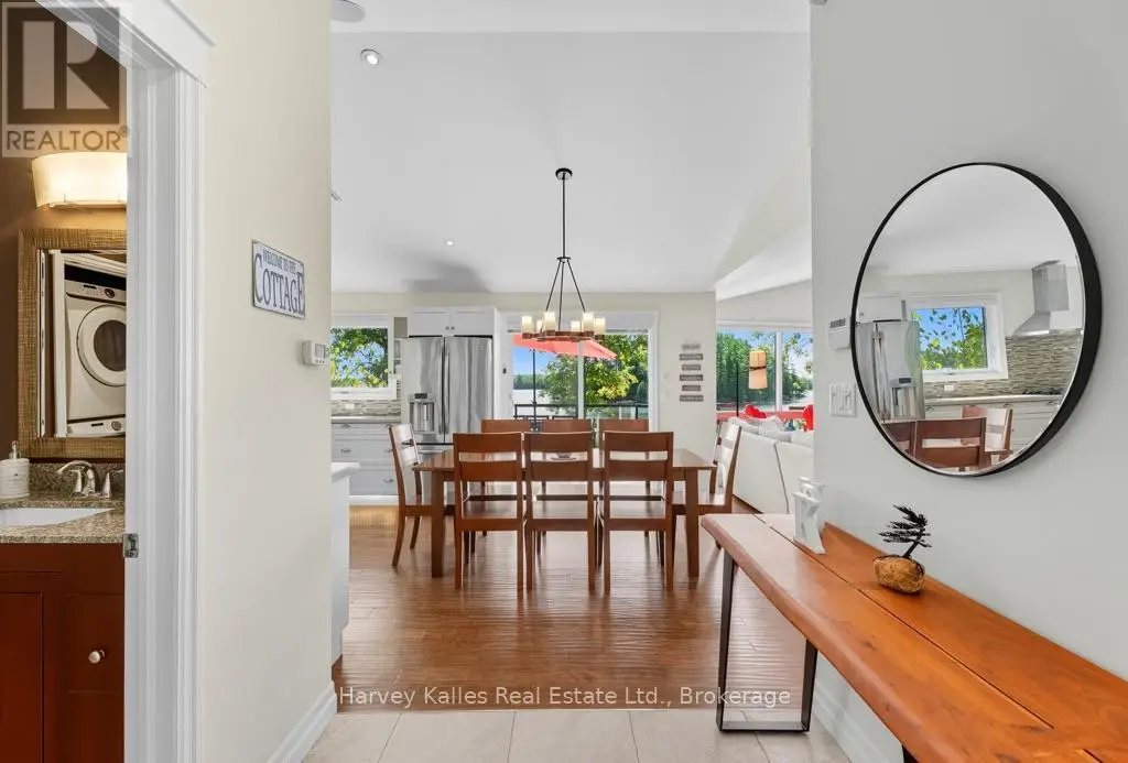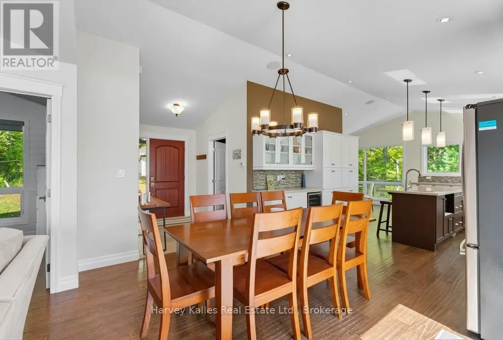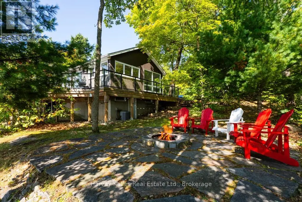 Stunning & inviting 4 season southerly oriented Lake Manitouwabing water's edge hideaway boasting island-dotted views and a beautiful sun-drenched classic rock shelf shoreline. Gentle topography, ease of year round municipally maintained road access with drive to the back door convenience. The all redone, elegant all season, 3 bedroom, 2 bath, sprawling bungalow boasts water views from almost every room, with a lakeside array of south to south-easterly facing windows & sliding glass doors spilling onto a large wraparound lakeside deck which connects down onto the brand new dock with expansive lakefront terrace area and separate granite fire pit patio. The cottage beckons & welcomes one with a lake view as soon as the door opens. Light & bright, luxurious designer infused interior features a gorgeous chef's kitchen with centre island & S/S appliances, water views, breakfast nook, bar area with bar fridge, opening to a generous lake-view dining area, and grande centrepiece great room with handsome floor-to-ceiling stacked stone propane-burning fireplace, and prow-front wall of windows overlooking once again stunning views. Waterside principal bedroom complete with its own walkout, walk-in closet, and luxe ensuite. 2 more main floor bedrooms, bath, laundry, plus the 276 sq. ft. sleeping cabin with bath attached to the insulated 2-car 23' x 23' detached garage. 213' of southerly shoreline, with rock point, rock shelf entry, deep and shallow water, sunrise and island-dotted views. 1.4 acres of level, private lands. Magnificent mechanicals, drilled well, central air, hot water on demand. The list goes on and on. Minutes from the exclusive Manitou Ridge Club for golf and dining, and a breeze to access from Toronto. With the ever rare and appealing aspect of having membership in the 'Longhorn Estates' Conservation Area 120+ acre backlands with hiking trails. 4 season cottaging splendour abounds on the ever desired Lake Manitouwabing. Being sold turnkey, fully furnished (id:16999)