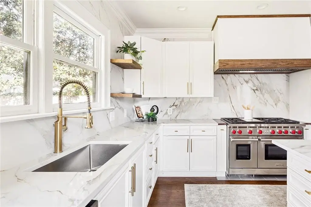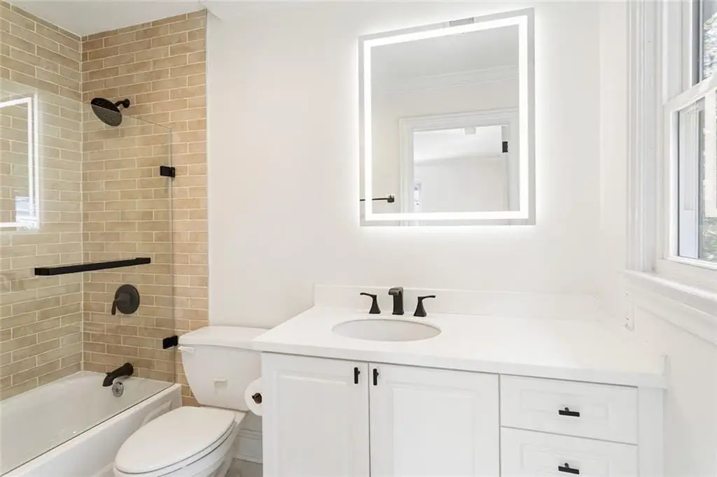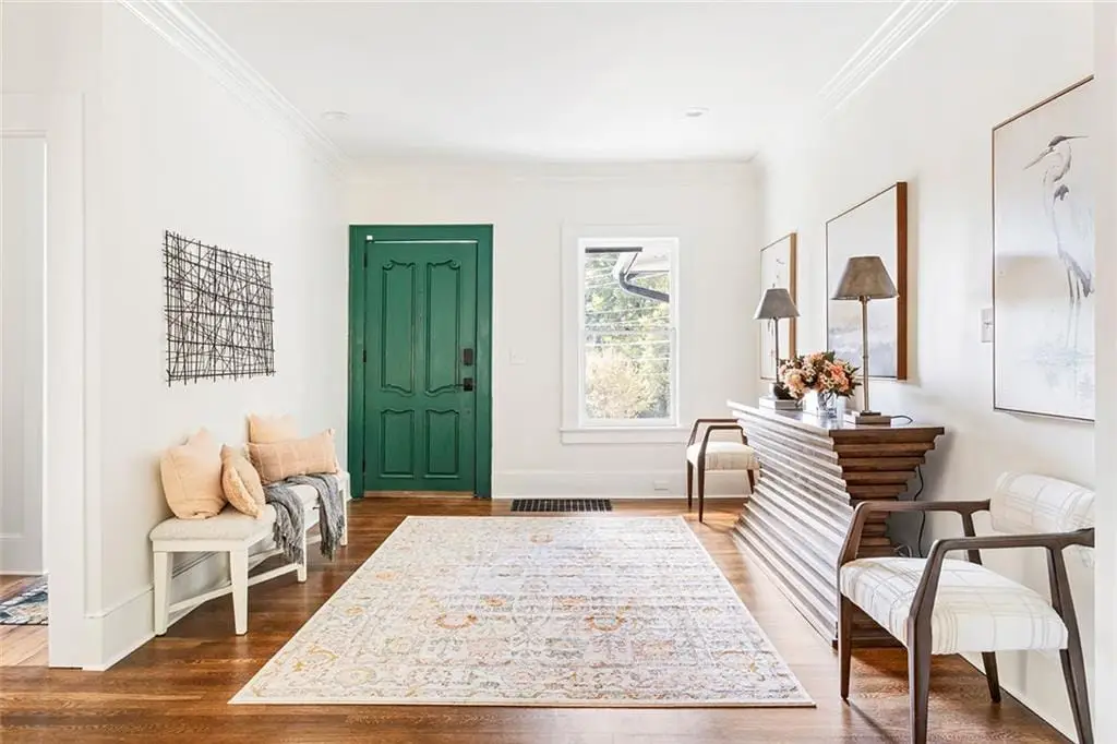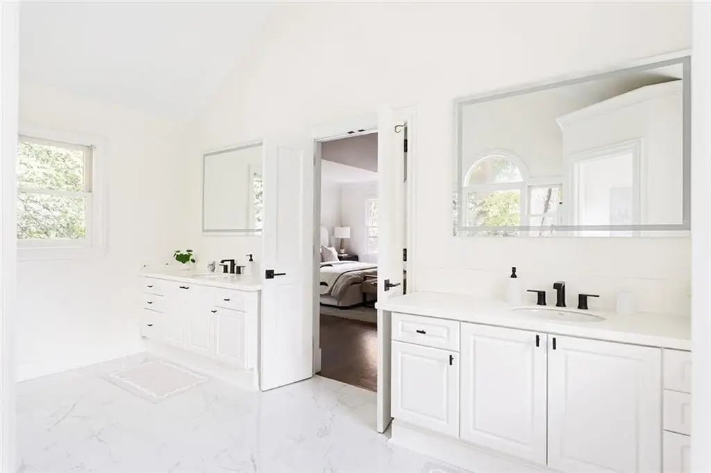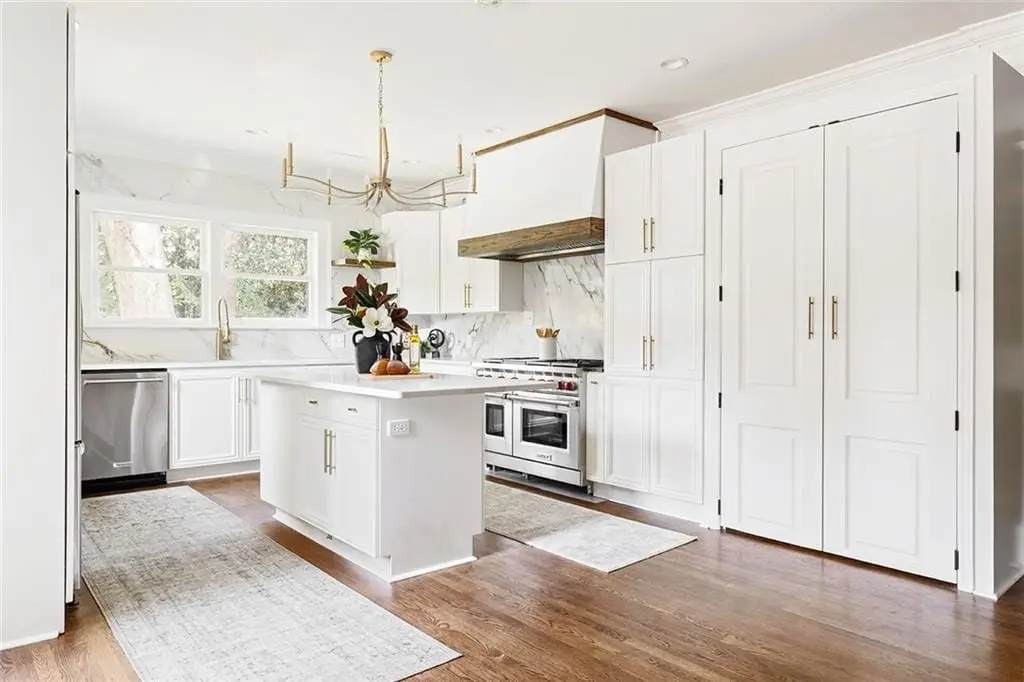 Perched proudly atop its corner hill, this reimagined 1930s Morningside bungalow has been transformed into a stately five-bedroom, five-bath retreat known as The White House for its timeless elegance and commanding presence. Every detail of this residence blends classic architecture with refined modern living, creating a home that feels both sophisticated and deeply personal. A brand-new concrete driveway welcomes you home with ease, leading to a charming covered front porch with its signature swing an ideal perch to enjoy the views of vibrant city life below. Inside, refinished hardwood floors flow throughout a sunlit open floor plan anchored by a statement stone fireplace framed by custom built-ins. The formal dining room opens seamlessly to a serene living area, while the showstopping designer kitchen steals the scene with its oversized island, six-burner Wolf gas range with grill, custom vent hood, built-in pantry, and sink overlooking the backyard. The main level offers two bedrooms, including a private ensuite tucked quietly at the rear, plus a versatile front bedroom with French doors leading to the porch perfect for an office or library. Upstairs, the homes expanded footprint reveals two additional ensuites and a luxurious primary suite that feels like a private sanctuary. Enjoy vaulted ceilings, a cozy sitting area, a custom walk-in closet, and a spa-worthy bathroom featuring a dramatic shower room, soaking tub, and dual vanities overlooking the treetops for a peaceful elevated escape. A highlight of the upper level is the beautifully designed custom laundry room thoughtfully equipped with abundant built-in storage, a hanging rod, sink, and a spacious folding table to make everyday living both elegant and efficient. Step outside through double French doors to a newly designed backyard oasis with a brick patio, lush level lawn, and professional landscaping ideal for entertaining, pets, or al fresco dining. A detached one-car garage with extra storage and an extended driveway provide ample off-street parking. Every inch of this property has been thoughtfully updated, from the brand-new retaining wall, sod, and curated landscaping to the fresh exterior and interior paint, new furnace, and refined finishes that elevate both form and function. Just moments from Piedmont Park, the Atlanta BeltLine, Virginia-Highland, and top-rated schools, this Morningside gem offers a rare opportunity to own a hilltop haven that perfectly balances historic charm, modern design, and luxurious livability.