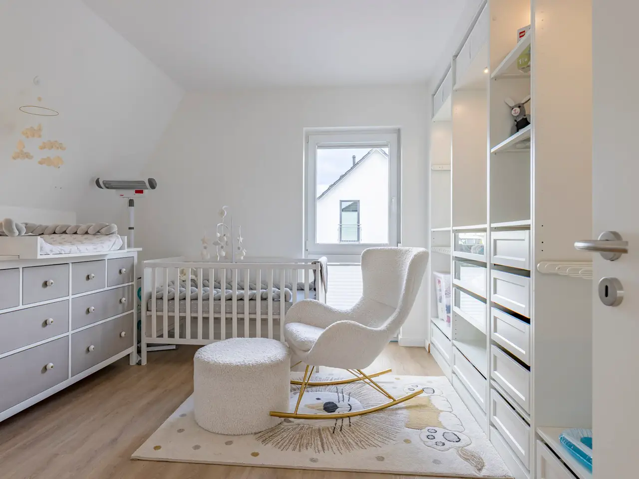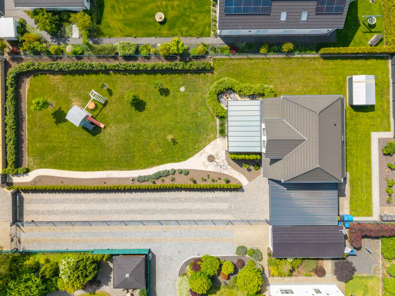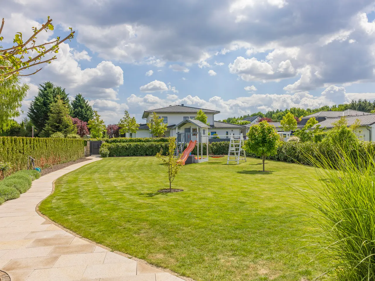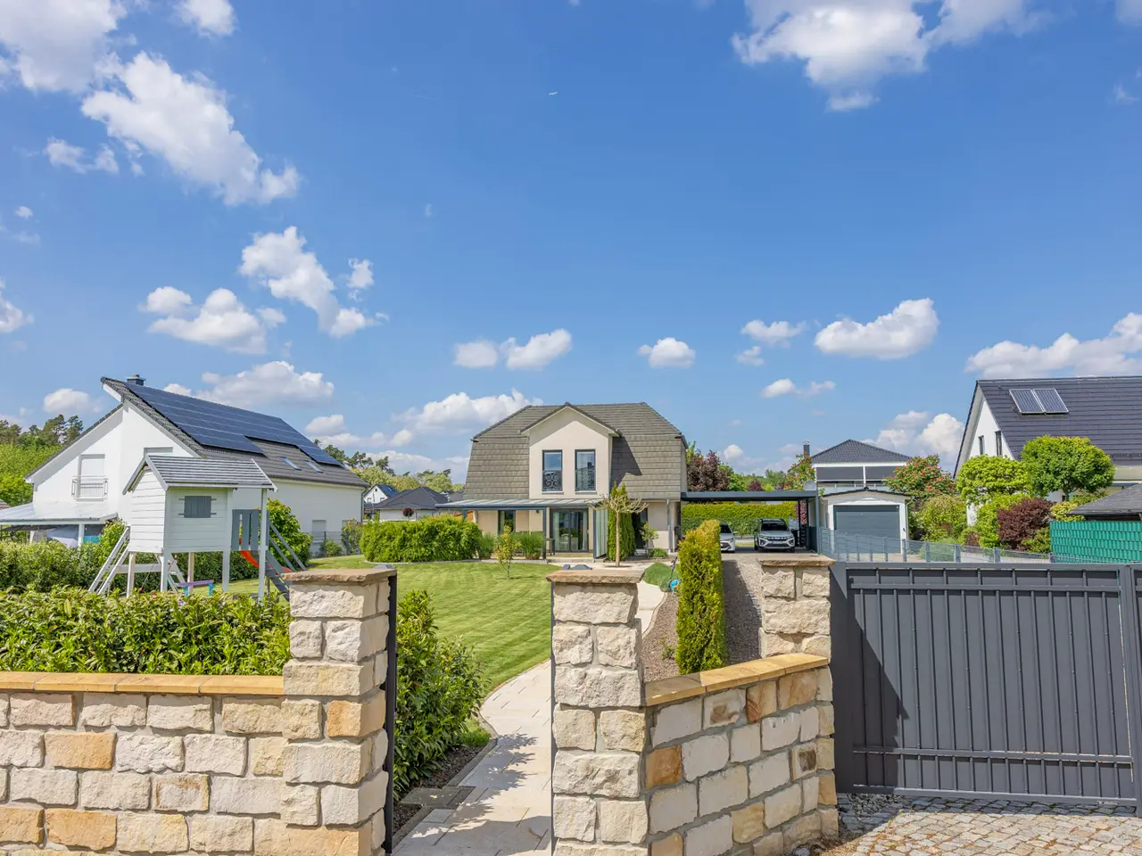 This well-kept detached house, built in 2017, is for sale in a high-quality residential estate. With a living space of approx. 161.9 m² on a spacious plot of approx. 1305 m², this house offers a wide range of possible uses and modern amenities. The property comprises a total of five rooms, including four bedrooms and two bathrooms. The first floor and upper floor have underfloor heating, which is operated by an efficient geothermal heat pump (brine borehole) and is also combined with a ventilation system. This environmentally friendly solution ensures a pleasant heat distribution and fresh air supply throughout the house. The home technology is supported by Homatic smart home control, which enables convenient operation of heating, lighting and other electronic devices. LAN cabling ensures a reliable internet connection throughout the houseThe rooms are fitted with high-quality tiled and vinyl flooring. The fitted kitchen offers ample worktop and storage space. The stylish outdoor facilities underline the special character of this property. A spacious, covered natural stone terrace with electric awning invites you to spend relaxing hours outdoors. Paths and paving made of natural stone and granite are not only a visual highlight, but also robust and durable. A fountain with irrigation system supplies the high-quality plants in the garden. A garden shed offers additional storage space, e.g. for bicycles, or can be used individually. The spacious double carport is directly connected to the house, so that you can reach your car safely even in bad weather. The long, paved driveway also offers ample parking space for families and visitors. The electric access gate offers additional convenience and security. The location of the property is characterized by its tranquillity and good connections to the surrounding freeways. Schools and shopping facilities are just a few minutes' drive away, while the nearby golf course provides leisure activities and recreation. The large plot also offers the possibility of integrating a pool or other leisure facilities. All in all, this as-new detached house presents itself as a property that impresses with both its modern fittings and its versatile usage options. The combination of a quiet location, high-quality construction and environmentally friendly technologies makes it an ideal home for discerning buyers who value quality and comfort.