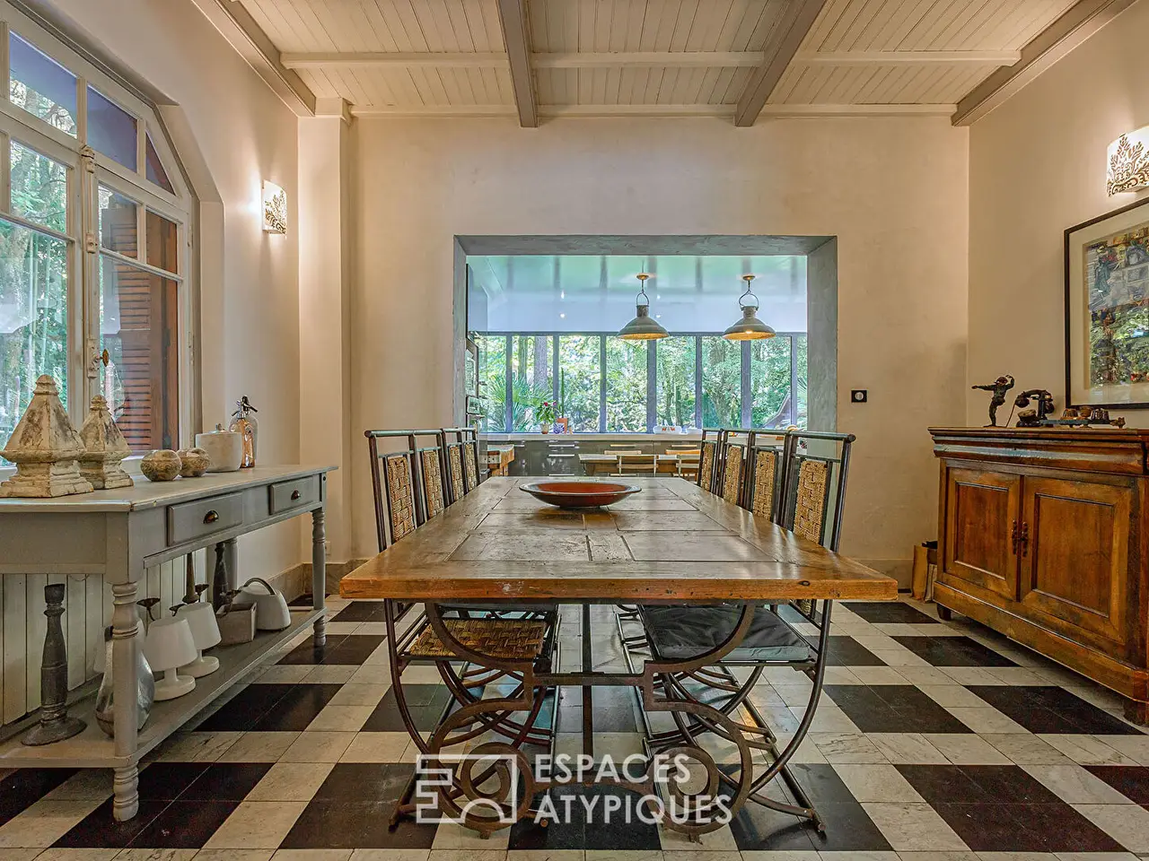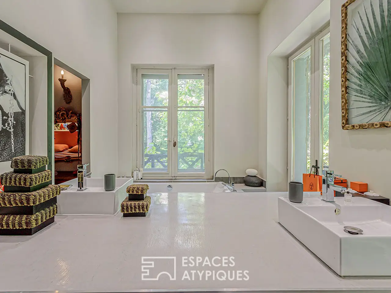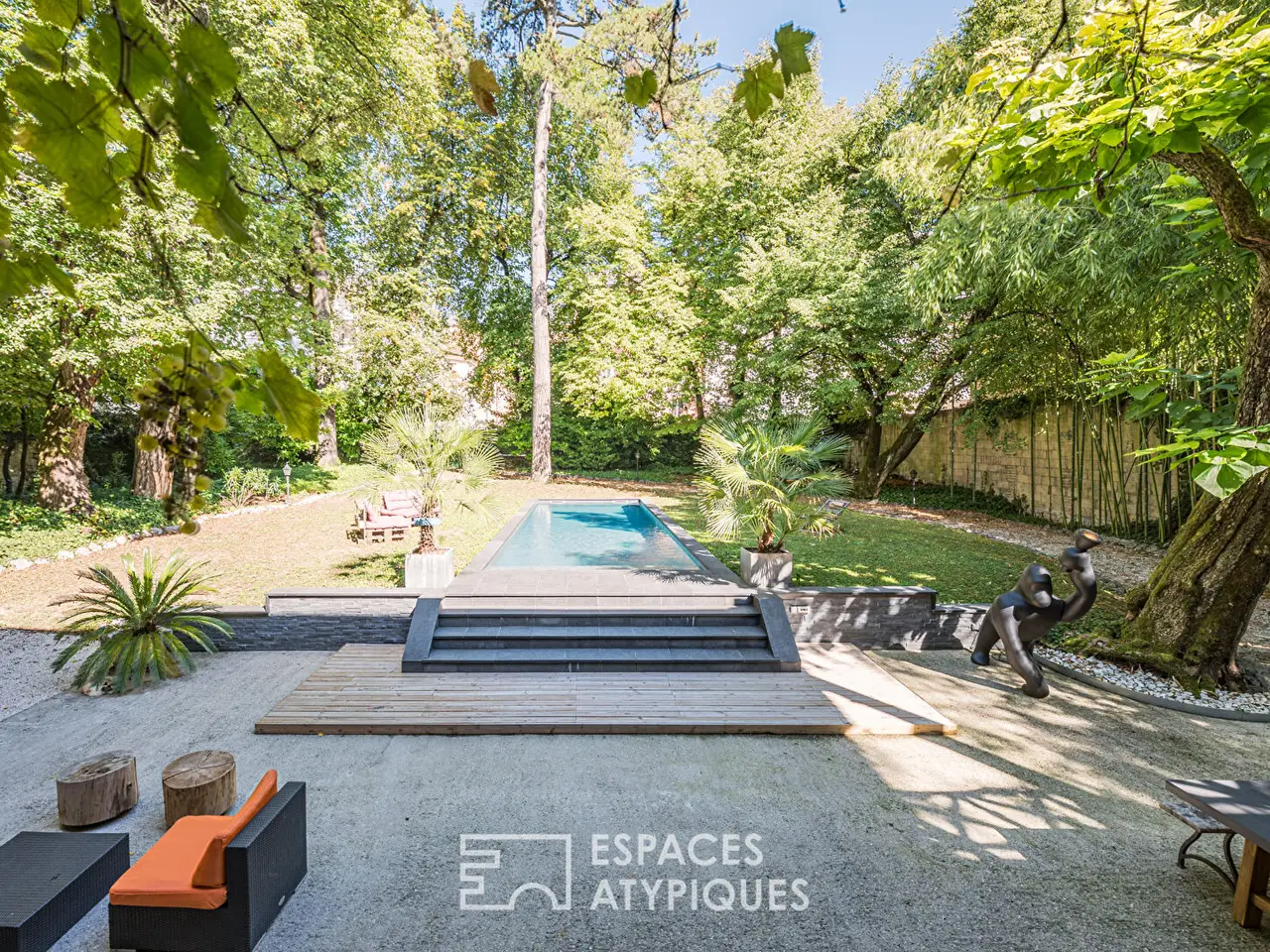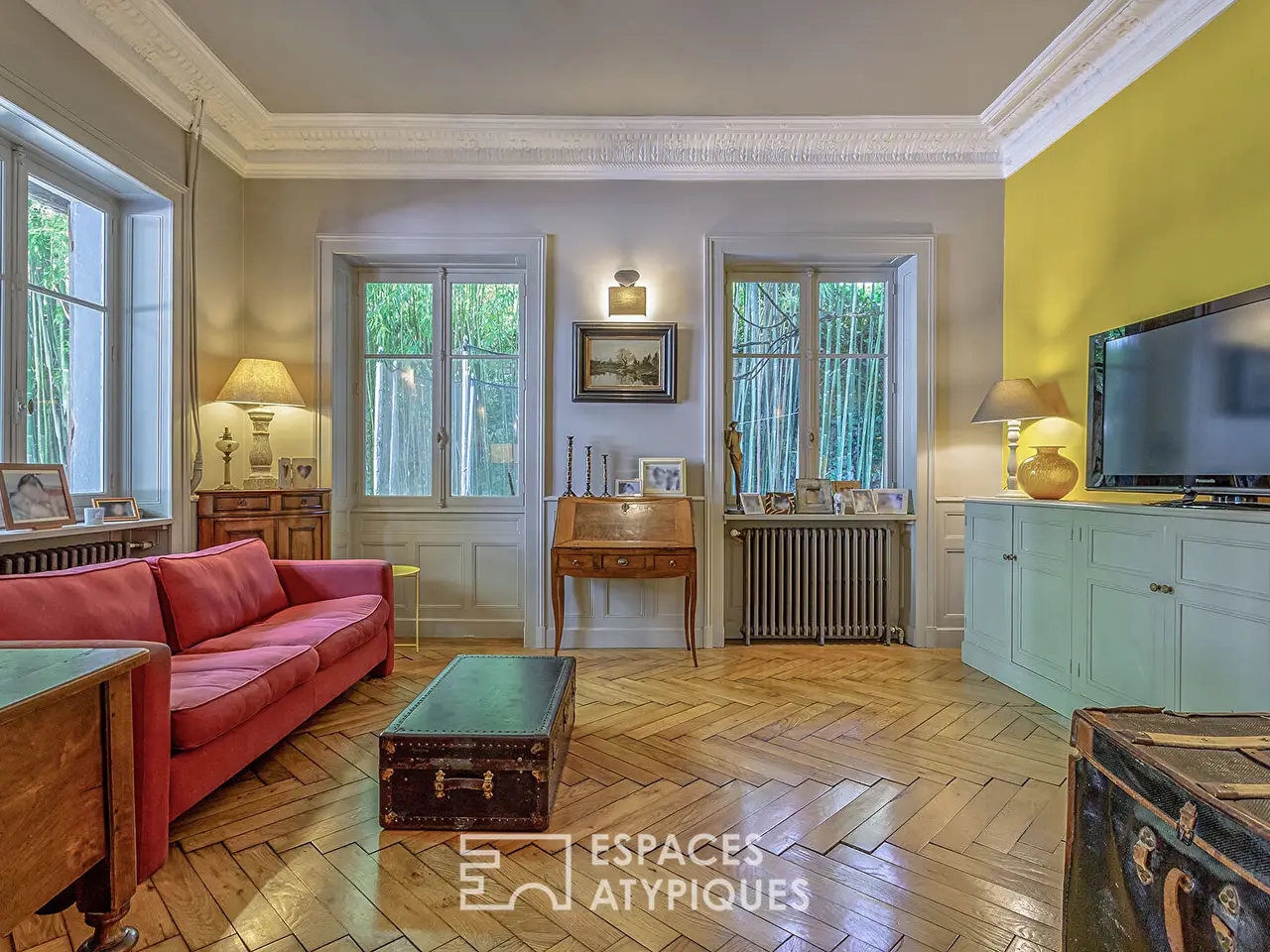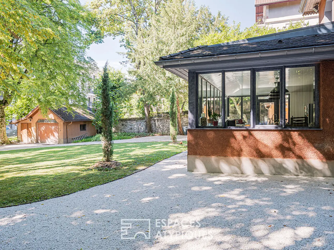 Nestled in the heart of a landscaped park of 2,100 sqm, this historic 238 sqm residence stands as a rare address in the very center of Aix-les-Bains.Sheltered by century-old trees, it combines the charm of preserved heritage with the comfort of a prestigious villa. An elegant swimming pool extends the serene atmosphere of this private estate.Inside, generous volumes and a harmonious layout are revealed. From the entrance, the double living room with herringbone parquet flooring and period moldings expresses the full authenticity of the property. The adjoining dining room, ideal for entertaining, echoes the contemporary kitchen set within a glass extension offering panoramic views over the garden.Upstairs, two bedrooms are arranged, including a master suite with its bathroom, a shower room, and a gallery-style balcony overlooking the park and pool. The converted attic space, with its exposed beams, hosts two additional bedrooms with unique character.Outdoors, the landscaped garden creates an intimate setting where lush greenery, terraces, and relaxation areas blend seamlessly. The long, refined swimming pool becomes the centerpiece of this haven of greenery. An independent caretaker's house enhances the potential of the property, further complemented by a covered garage and spacious cellars.Its privileged location, just steps away from shops, schools, cultural facilities, and the lake, makes it truly unique. This historic residence, rare on the Aix-les-Bains real estate market, will appeal to lovers of character and authenticity.Energy class: D / Climate class: DEstimated annual energy costs (standard use, 2023 prices): between €2,890 and €3,970.REF. 2027EAAdditional information* 15 rooms* 4 bedrooms* 2 bathrooms* 1 bathroom* 2 floors in the building* Outdoor space : 2100 SQM* Parking : 3 parking spaces* Property tax : 2 649 €Energy Performance CertificatePrimary energy consumptiond : 197 kWh/m2.yearHigh performance housing*A*B*C*197kWh/m2.year42*kg CO2/m2.yearD*E*F*GExtremely poor housing performance* Of which greenhouse gas emissionsd : 42 kg CO2/m2.yearLow CO2 emissions*A*B*C*42kg CO2/m2.yearD*E*F*GVery high CO2 emissionsEstimated average amount of annual energy expenditure for standard use, established from energy prices for the year 2021 : between 2890 € and 3970 €Agency feesThe fees include VAT and are payable by the vendorMediatorMediation Franchise-Consommateurswww.mediation-franchise.com29 Boulevard de Courcelles 75008 ParisInformation on the risks to which this property is exposed is available on the Geohazards website : www.georisques.gouv.fr