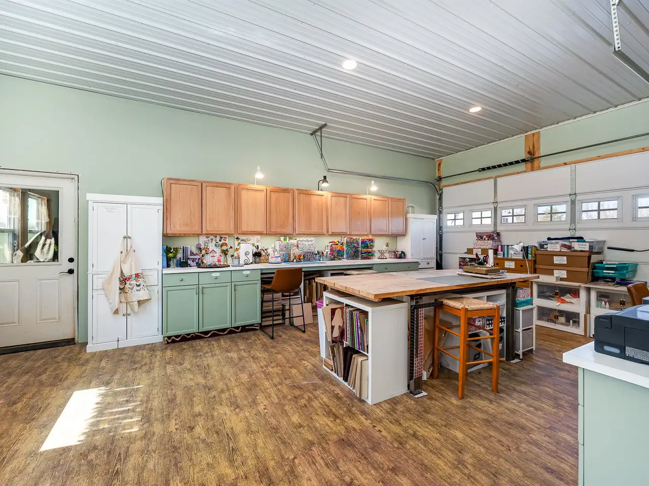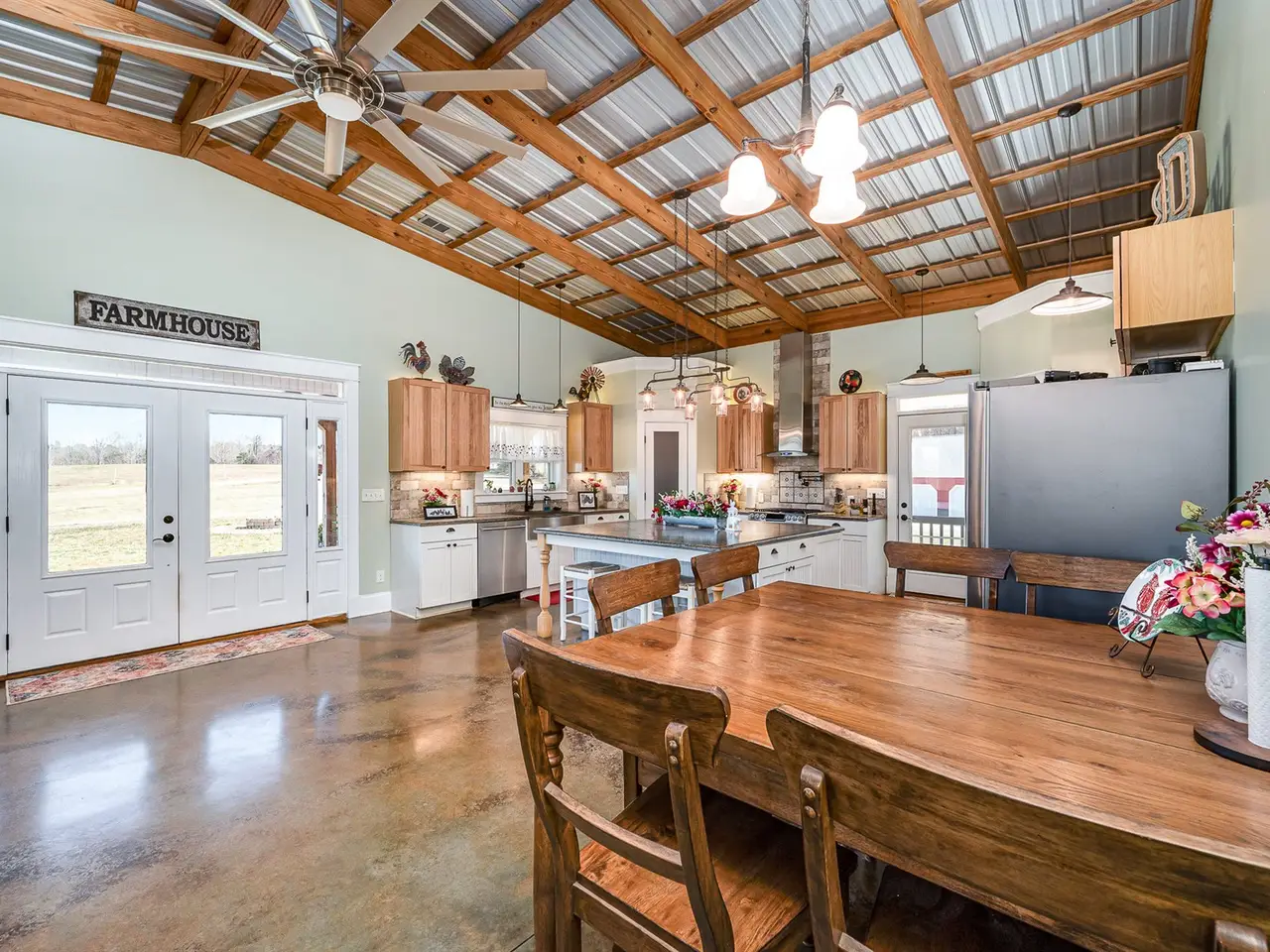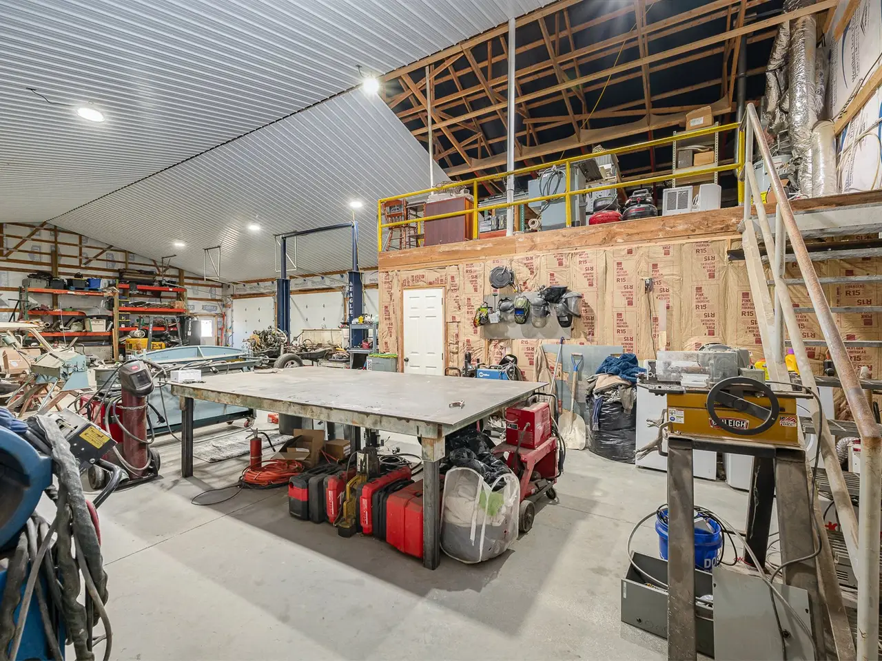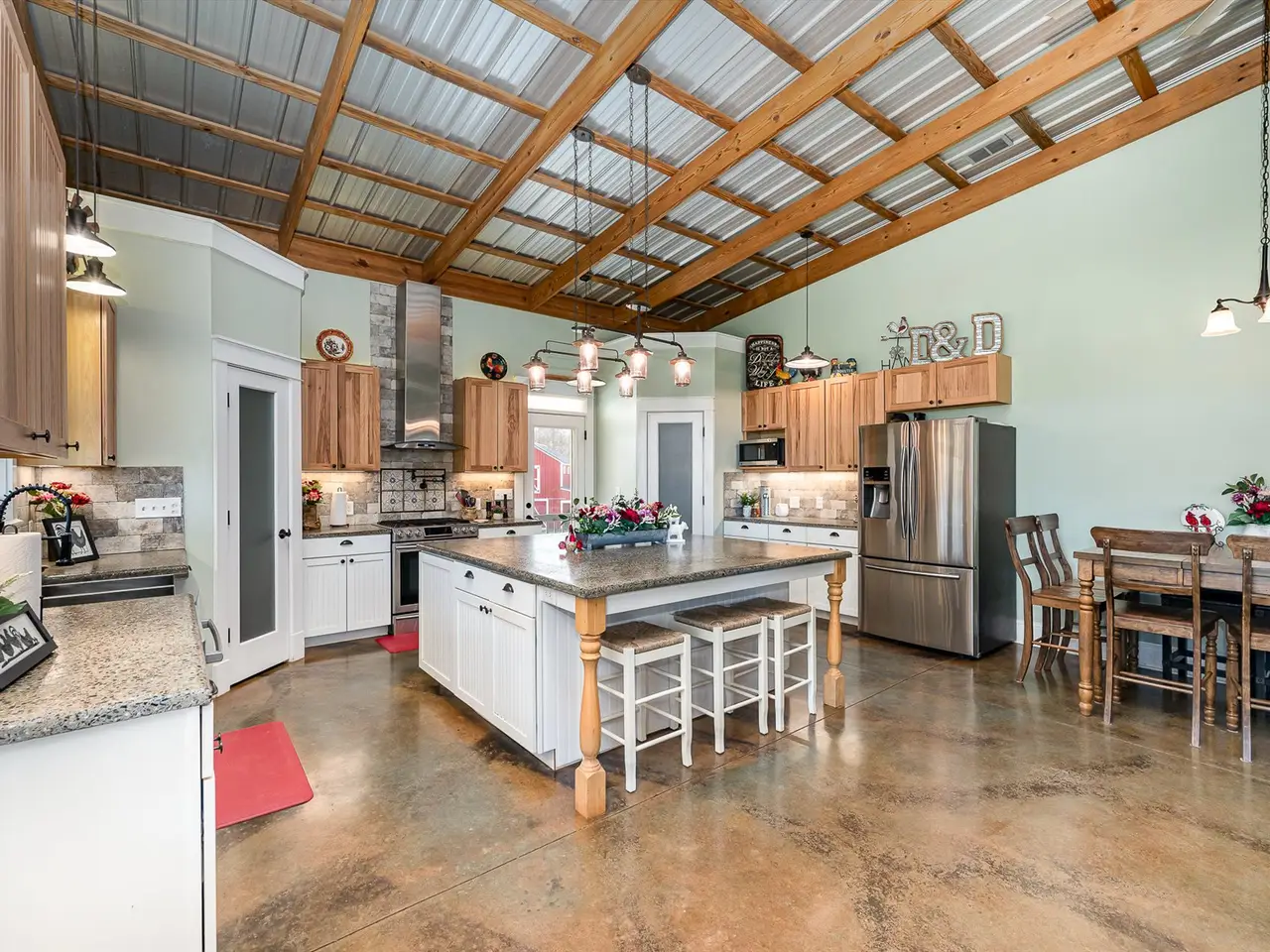 Nestled on 10 acres yet close to downtown Mooresville. Breezy open spaces, 9-foot ceilings, and distinctive custom touches throughout. Gourmet kitchen with custom concrete countertop inlaid with glass, stained concrete floors. Striking stone fireplace in the great room. The spacious hobby/craft room is perfect for creating. Those needing serious workspace, the 4,000 sq. ft. shop is an absolute dream! Complete with an office that could double as a studio apt, fully equipped with 3-phase inverter & 110 receptacle wiring, Multiple outlets for welding/machinery, Fully plumbed for compressed air, plus an Ingersoll Rand 80-gallon air compressor, Three 12'x10' roll-up doors, 15' eave height, and a vaulted ceiling with a 21' center height, 1,500-lb hydraulic 2-post lift. Walk through the woods to your private retreat. 532 sq. ft. off-grid oasis powered by solar backup, heated by woodstove, with kitchen, great room, and sleeping loft. Eligible to be annexed to MGSD.