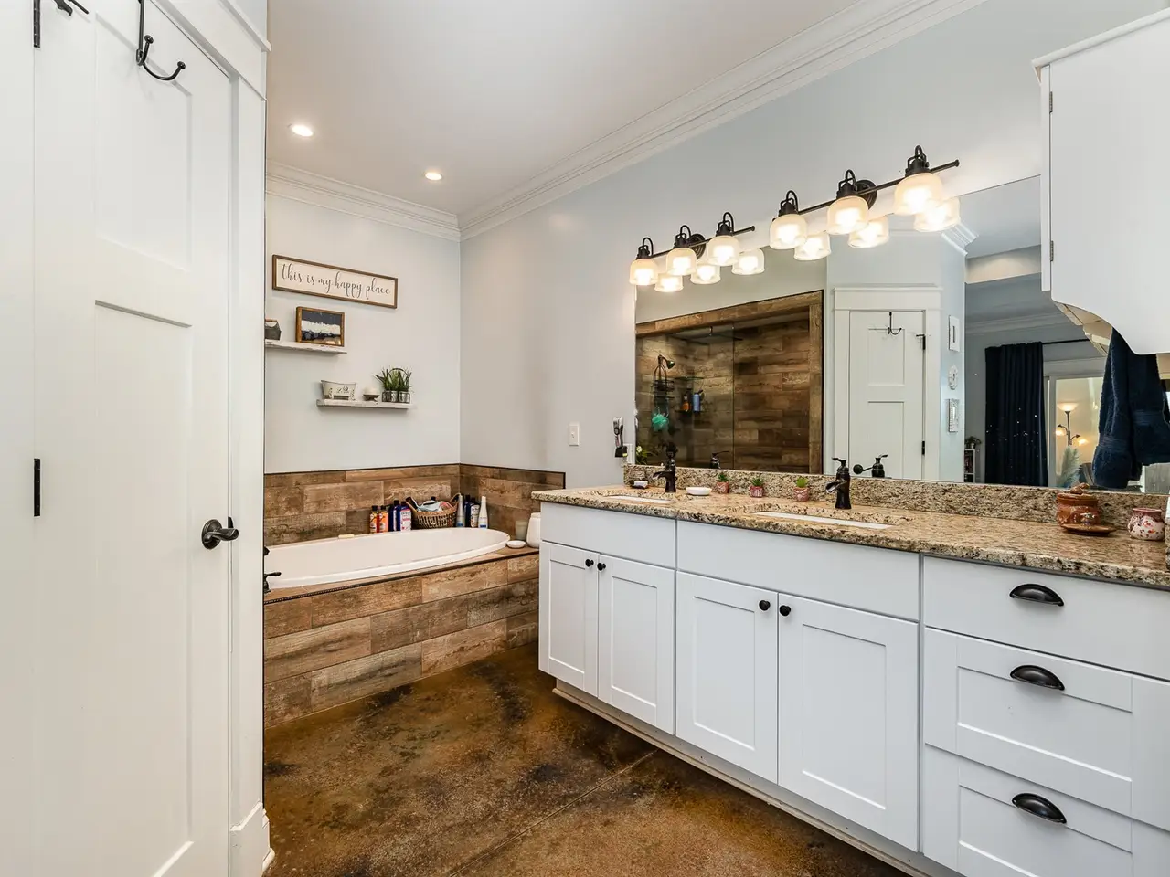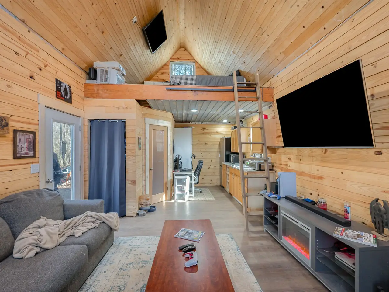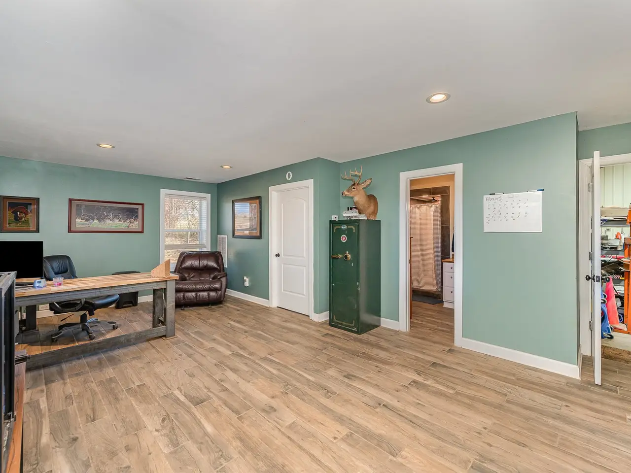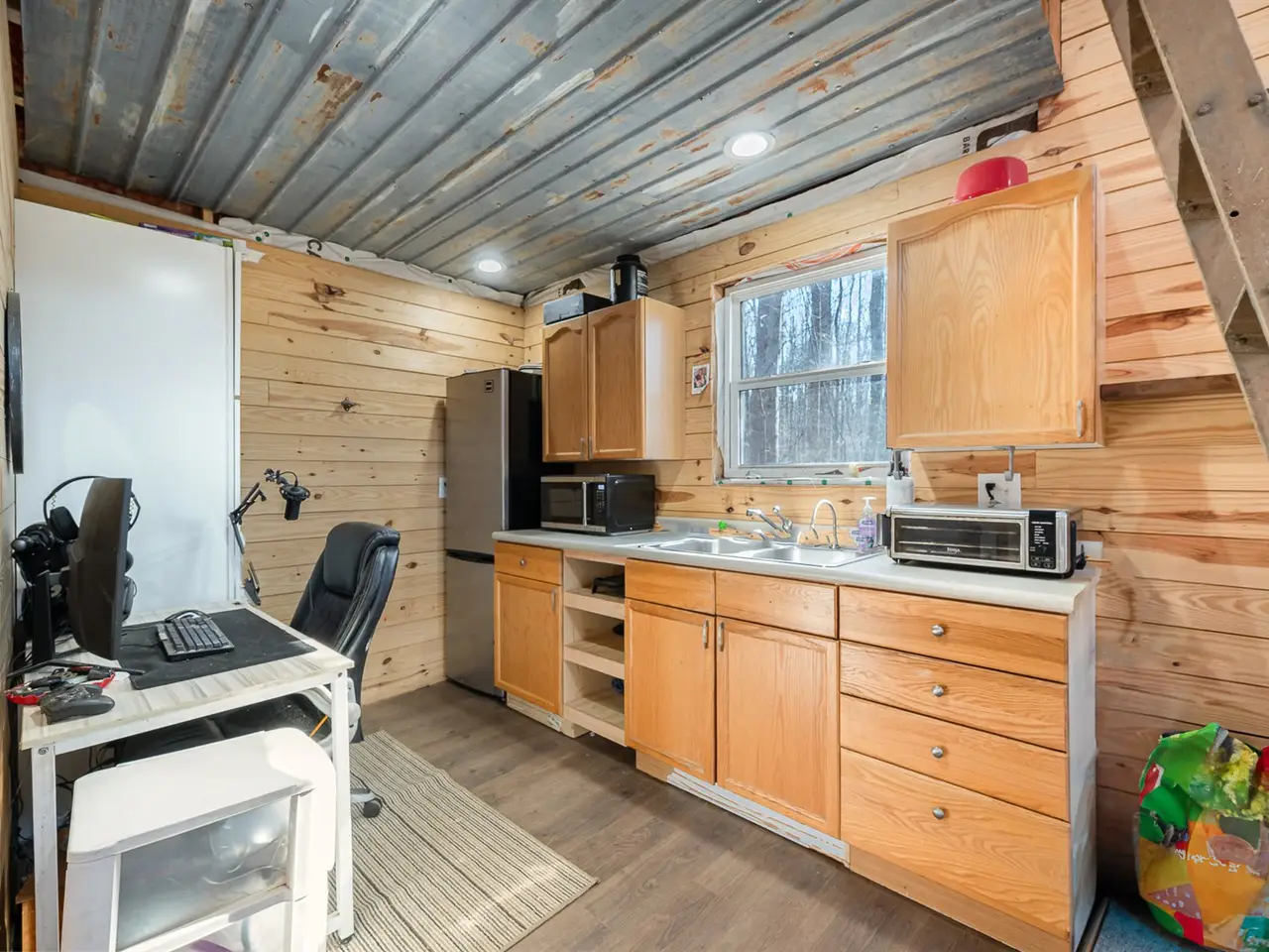 Nestled on 10 acres yet close to downtown Mooresville. Breezy open spaces, 9-foot ceilings, and distinctive custom touches throughout. Gourmet kitchen with custom concrete countertop inlaid with glass, stained concrete floors. Striking stone fireplace in the great room. The spacious hobby/craft room is perfect for creating. Those needing serious workspace, the 4,000 sq. ft. shop is an absolute dream! Complete with an office that could double as a studio apt, fully equipped with 3-phase inverter & 110 receptacle wiring, Multiple outlets for welding/machinery, Fully plumbed for compressed air, plus an Ingersoll Rand 80-gallon air compressor, Three 12'x10' roll-up doors, 15' eave height, and a vaulted ceiling with a 21' center height, 1,500-lb hydraulic 2-post lift. Walk through the woods to your private retreat. 532 sq. ft. off-grid oasis powered by solar backup, heated by woodstove, with kitchen, great room, and sleeping loft. Eligible to be annexed to MGSD.