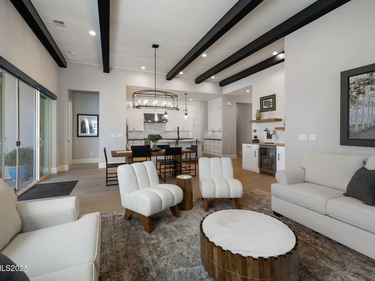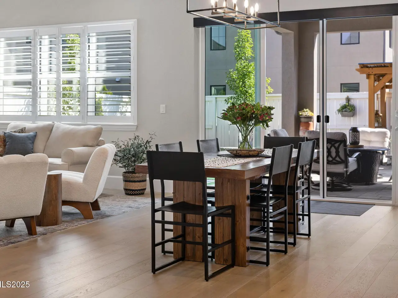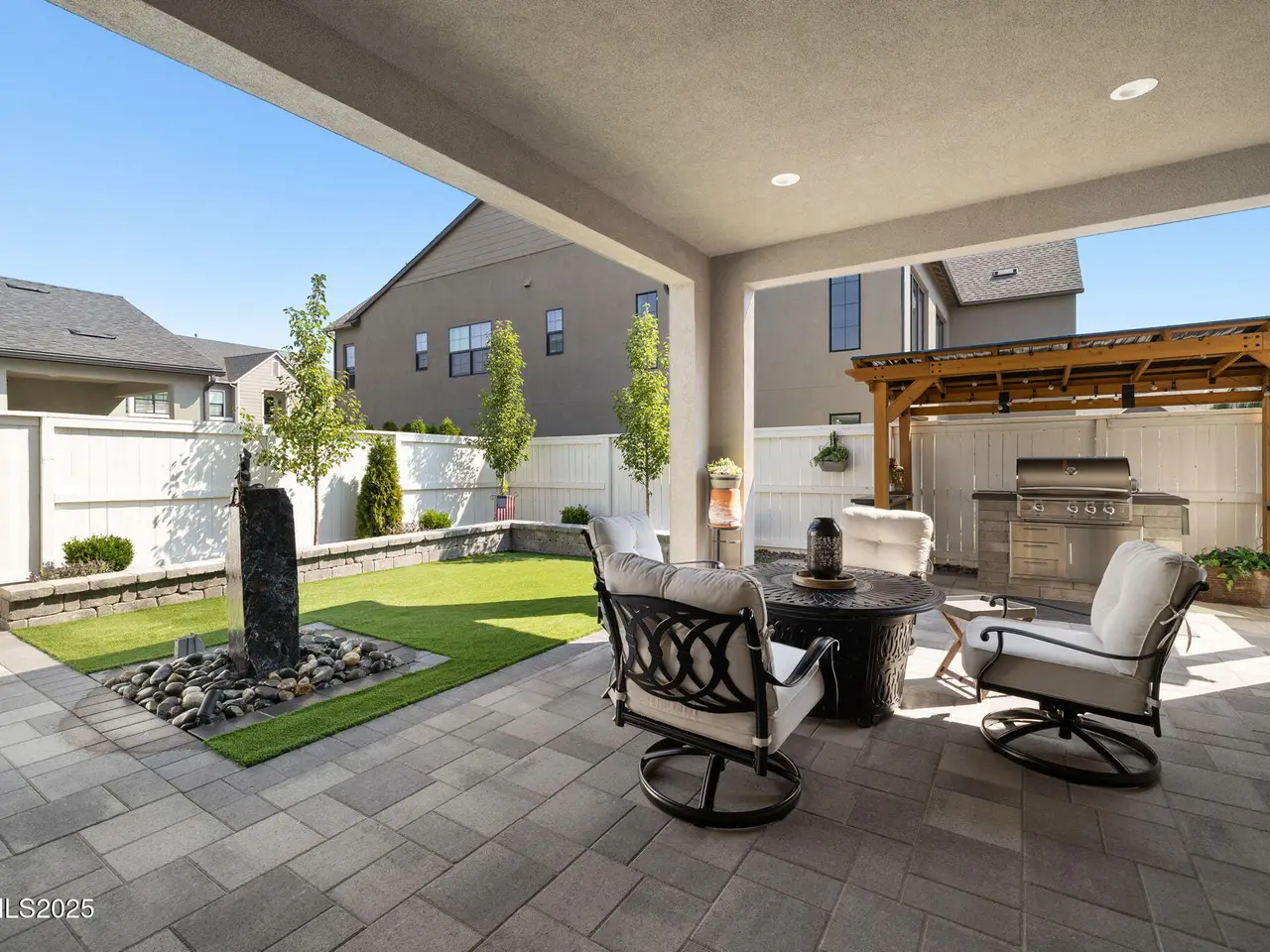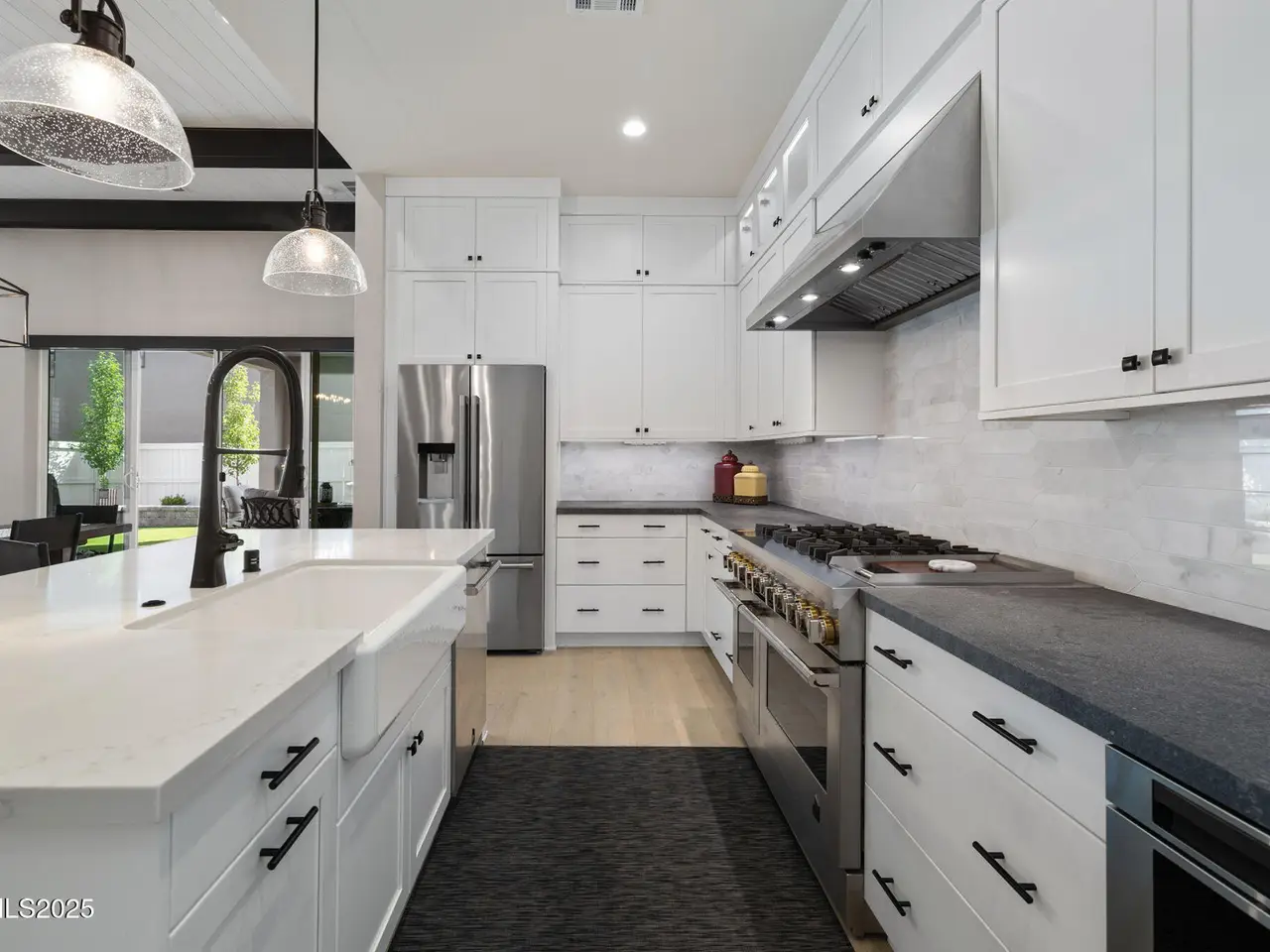 Single-level living behind the private gates of Rancharrah. This true lock-and-leave modern farmhouse combines luxury, comfort, and convenience with timeless design details including custom beam ceilings, shiplap, and an abundance of natural light. The thoughtfully designed floorplan offers a spacious primary ensuite, a secondary ensuite, and a private office with gorgeous custom built-ins. The heart of the home features a chef's kitchen with quartz countertops, craftsman-style cabinetry with rollout drawers and black hardware accents, JennAir stainless steel appliances, and farmhouse porcelain sink at kitchen island. The dining area is a focal point with a show-stopping chandelier and flows right into the great room anchored by a dramatic floor-to-ceiling stone fireplace, perfect for cozy evenings. European oak flooring flows seamlessly throughout the main living areas. Outdoor living is equally impressive with a covered patio, built-in barbecue, firepit, low-maintenance landscaping, and a tranquil water feature. Living in Rancharrah, Northern Nevada's most luxurious development, means enjoying incomparable amenities. The reimagined Club at Rancharrah is just a short walk away and offers resort-style living with a pool, outdoor cantina with poolside service, private dining at Nineteen 57, a three-level fitness center, group classes, kids' clubs, summer camps, family movie nights, seasonal events, and even a full-service spa and salon. Outdoor recreation includes pickleball and bocce courts, while private meeting and event spaces add to the exclusivity. Beyond the gates, enjoy easy access to the Village at Rancharrah with fine dining, shops, and wellness services. The location also places you minutes from Bartley Ranch's trails and amphitheater, Reno-Tahoe International Airport, Midtown, and Downtown Reno. Mt. Rose Ski Resort is just 18 minutes away, with Lake Tahoe only 40 minutes from your door. This home is a perfect balance of refined interiors, effortless lifestyle, and unmatched amenities in one of Reno's most prestigious communities.