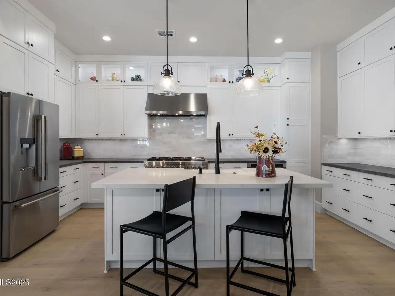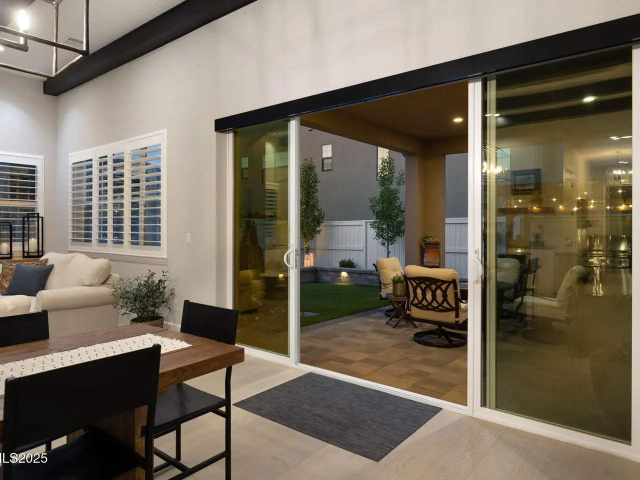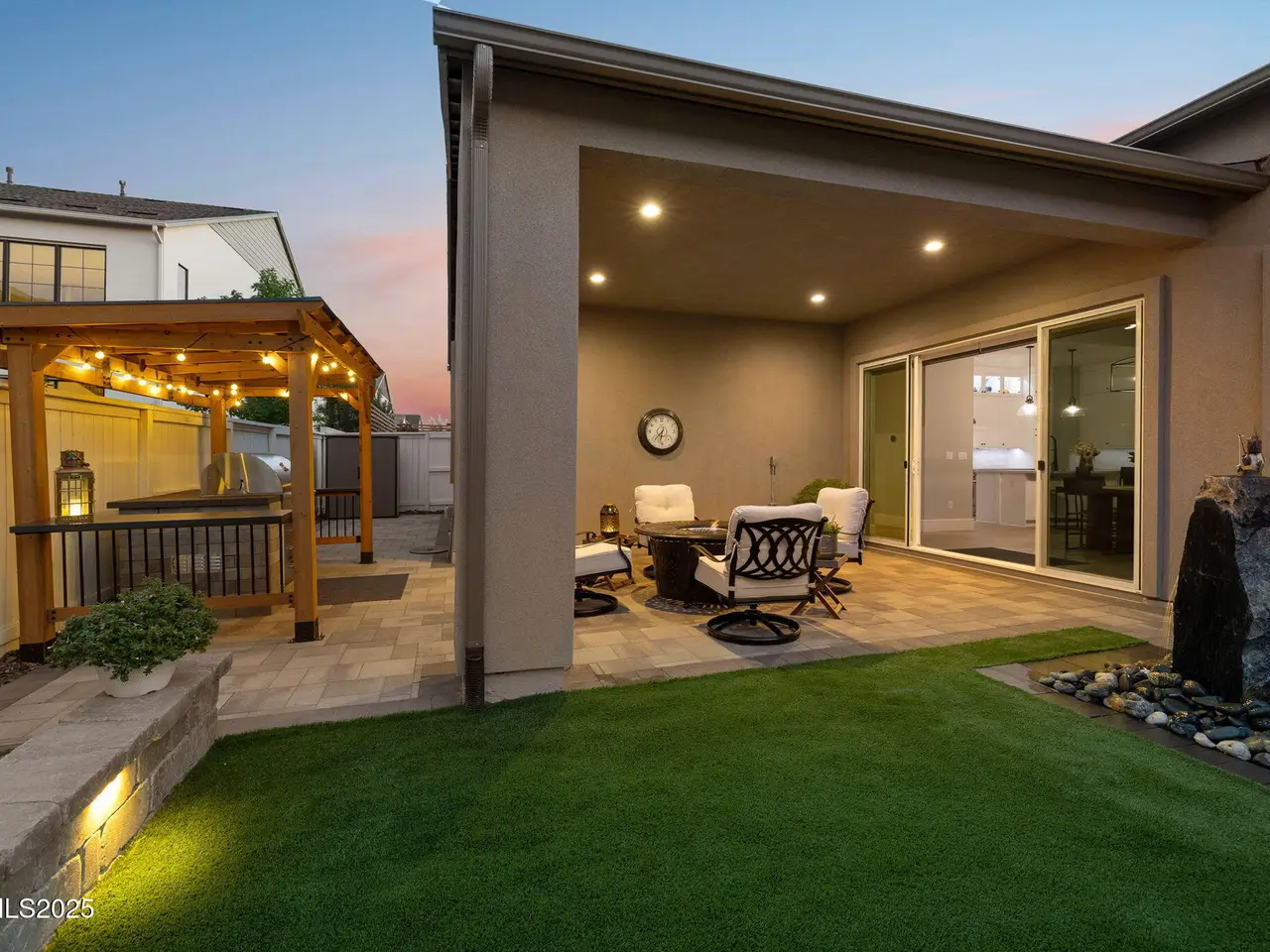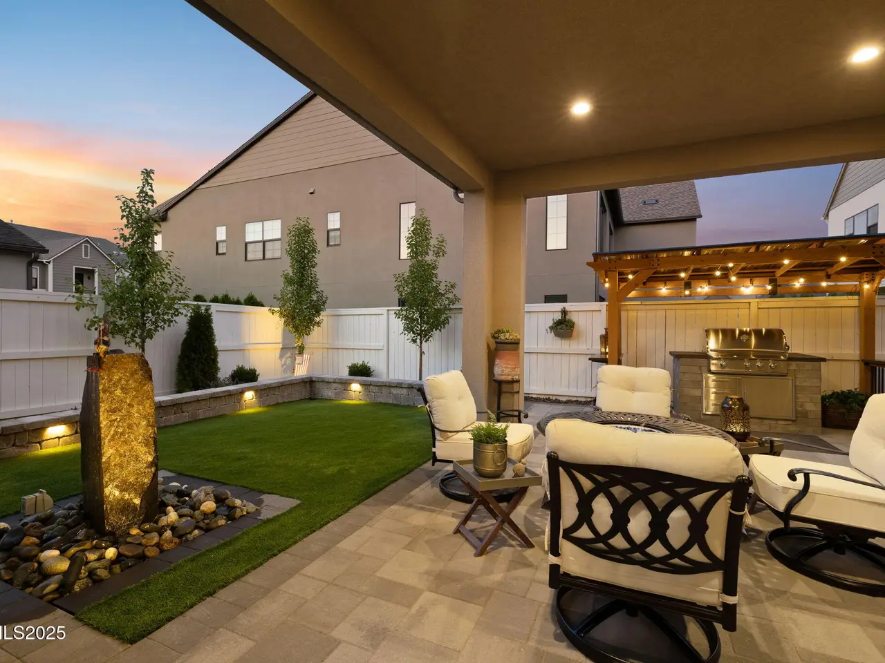Single-level living behind the private gates of Rancharrah. This true lock-and-leave modern farmhouse combines luxury, comfort, and convenience with timeless design details including custom beam ceilings, shiplap, and an abundance of natural light. The thoughtfully designed floorplan offers a spacious primary ensuite, a secondary ensuite, and a private office with gorgeous custom built-ins. The heart of the home features a chef's kitchen with quartz countertops, craftsman-style cabinetry with rollout drawers and black hardware accents, JennAir stainless steel appliances, and farmhouse porcelain sink at kitchen island. The dining area is a focal point with a show-stopping chandelier and flows right into the great room anchored by a dramatic floor-to-ceiling stone fireplace, perfect for cozy evenings. European oak flooring flows seamlessly throughout the main living areas. Outdoor living is equally impressive with a covered patio, built-in barbecue, firepit, low-maintenance landscaping, and a tranquil water feature. Living in Rancharrah, Northern Nevada's most luxurious development, means enjoying incomparable amenities. The reimagined Club at Rancharrah is just a short walk away and offers resort-style living with a pool, outdoor cantina with poolside service, private dining at Nineteen 57, a three-level fitness center, group classes, kids' clubs, summer camps, family movie nights, seasonal events, and even a full-service spa and salon. Outdoor recreation includes pickleball and bocce courts, while private meeting and event spaces add to the exclusivity. Beyond the gates, enjoy easy access to the Village at Rancharrah with fine dining, shops, and wellness services. The location also places you minutes from Bartley Ranch's trails and amphitheater, Reno-Tahoe International Airport, Midtown, and Downtown Reno. Mt. Rose Ski Resort is just 18 minutes away, with Lake Tahoe only 40 minutes from your door. This home is a perfect balance of refined interiors, effortless lifestyle, and unmatched amenities in one of Reno's most prestigious communities.