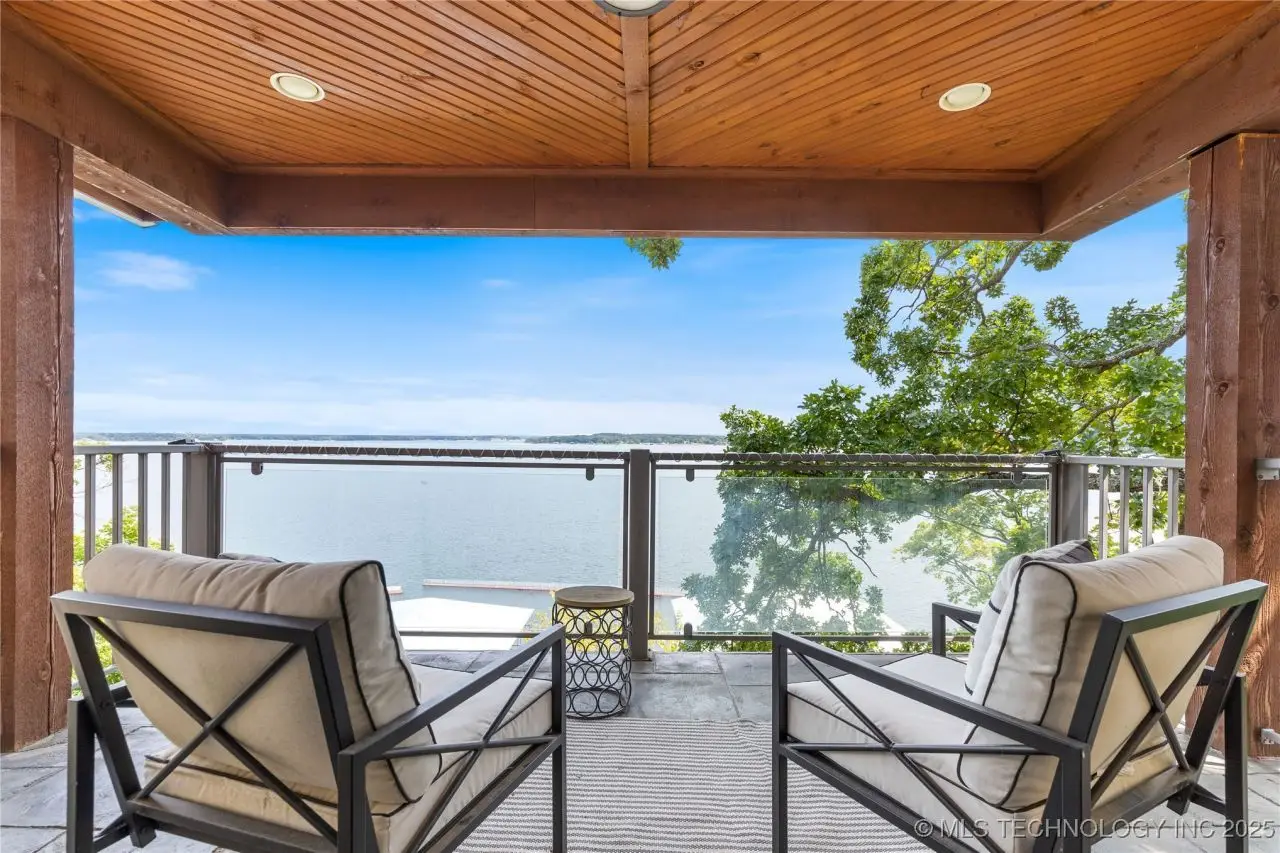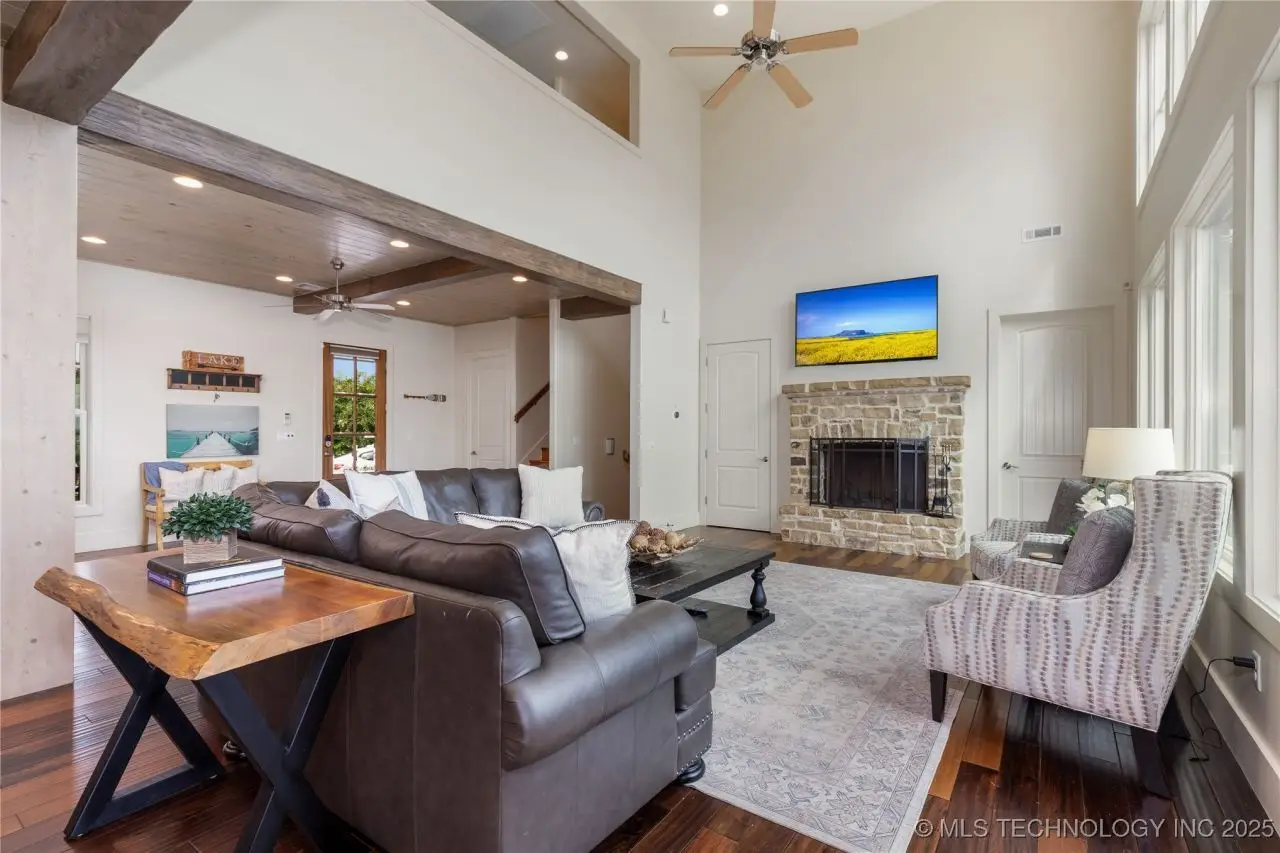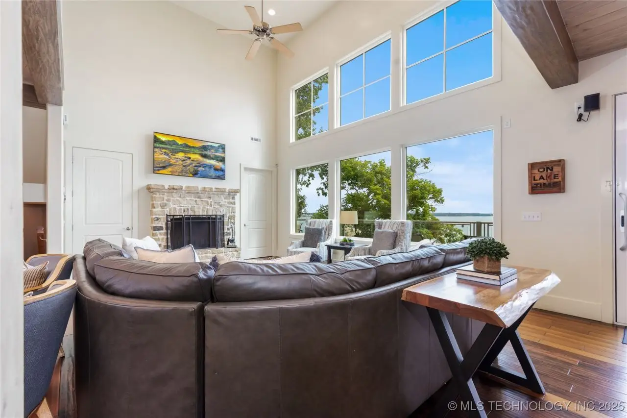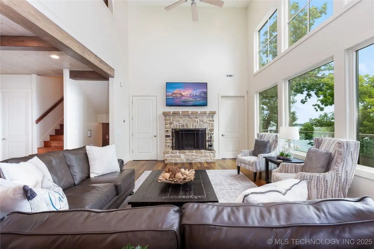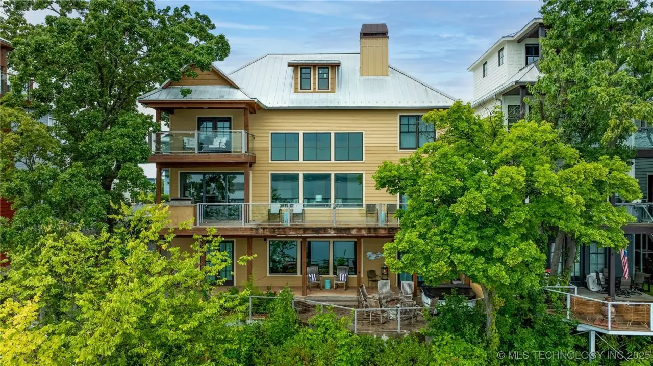 Come see this stunning residence in the gated community of South Shore! Sold fully furnished by a designer, & located an estimated hour hour from Tulsa, this beautifully designed home offer five bedrooms and five full bathrooms, providing both space and comfort for family and guests. An open floor plan flows seamlessly throughout, with breathtaking lake views from all three levels. Each with its own patio as well. The basement is made for entertaining with a wet bar, shuffleboard table, Pac Man arcade and more! Or, you can relax outside in the hot tub or around the firepit while enjoying the views. This property also has a dock slip with a lift and boat cover, offering unmatched convenience for lake living. South Shore also offers a community clubroom, pool, and ponds.