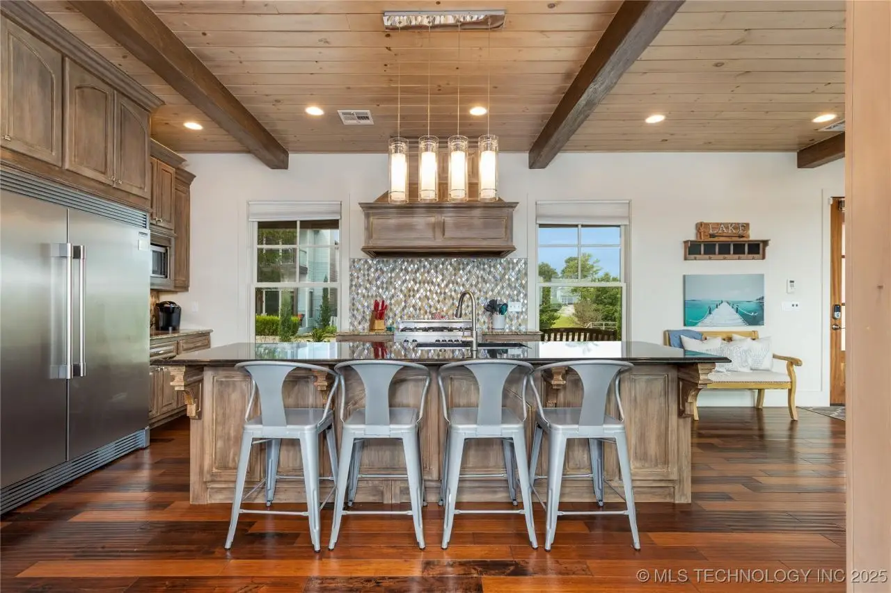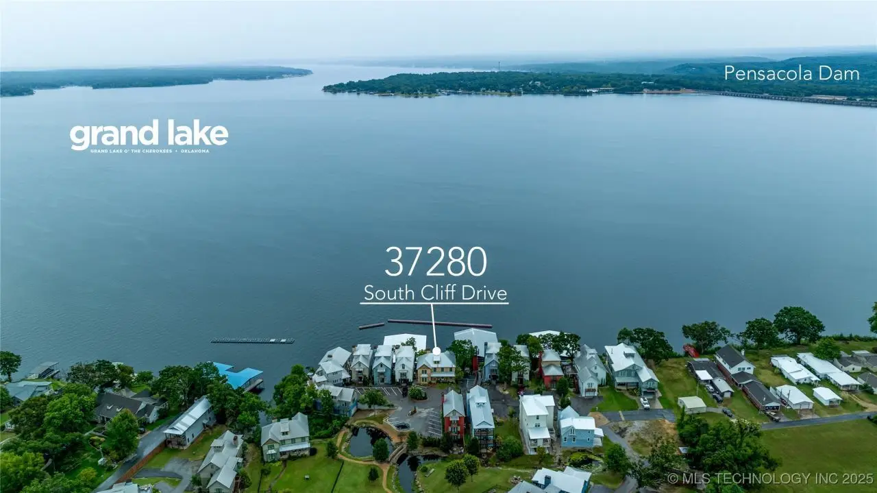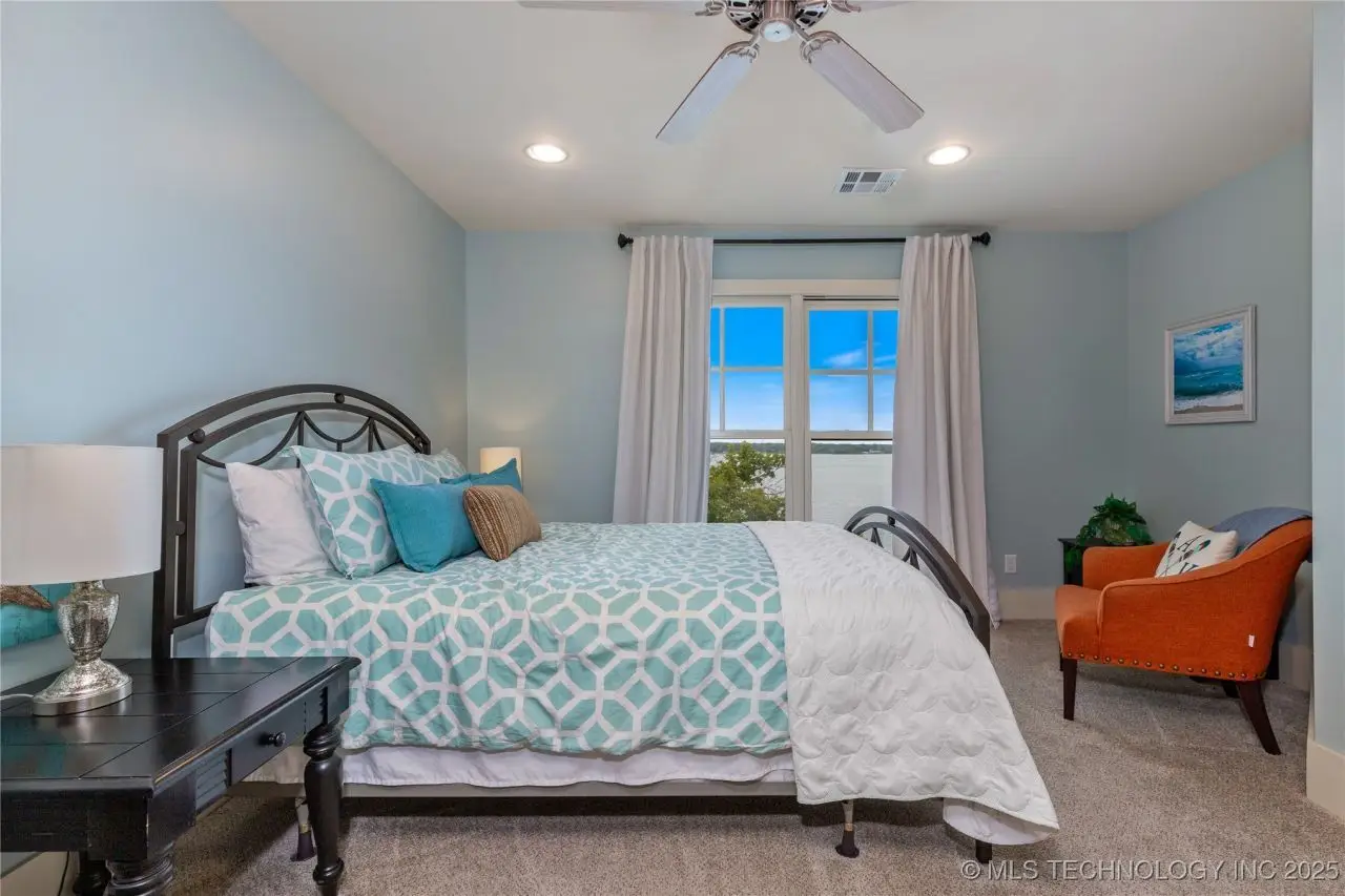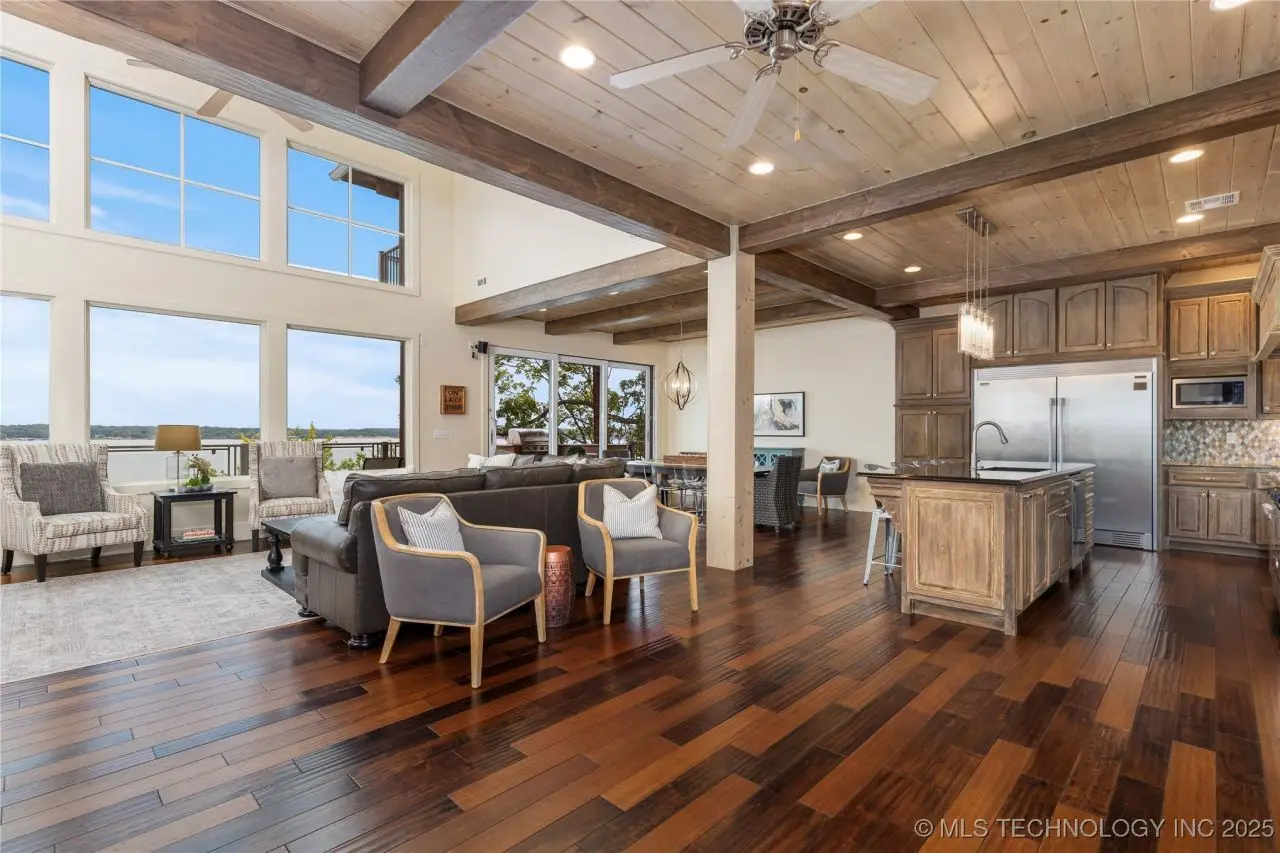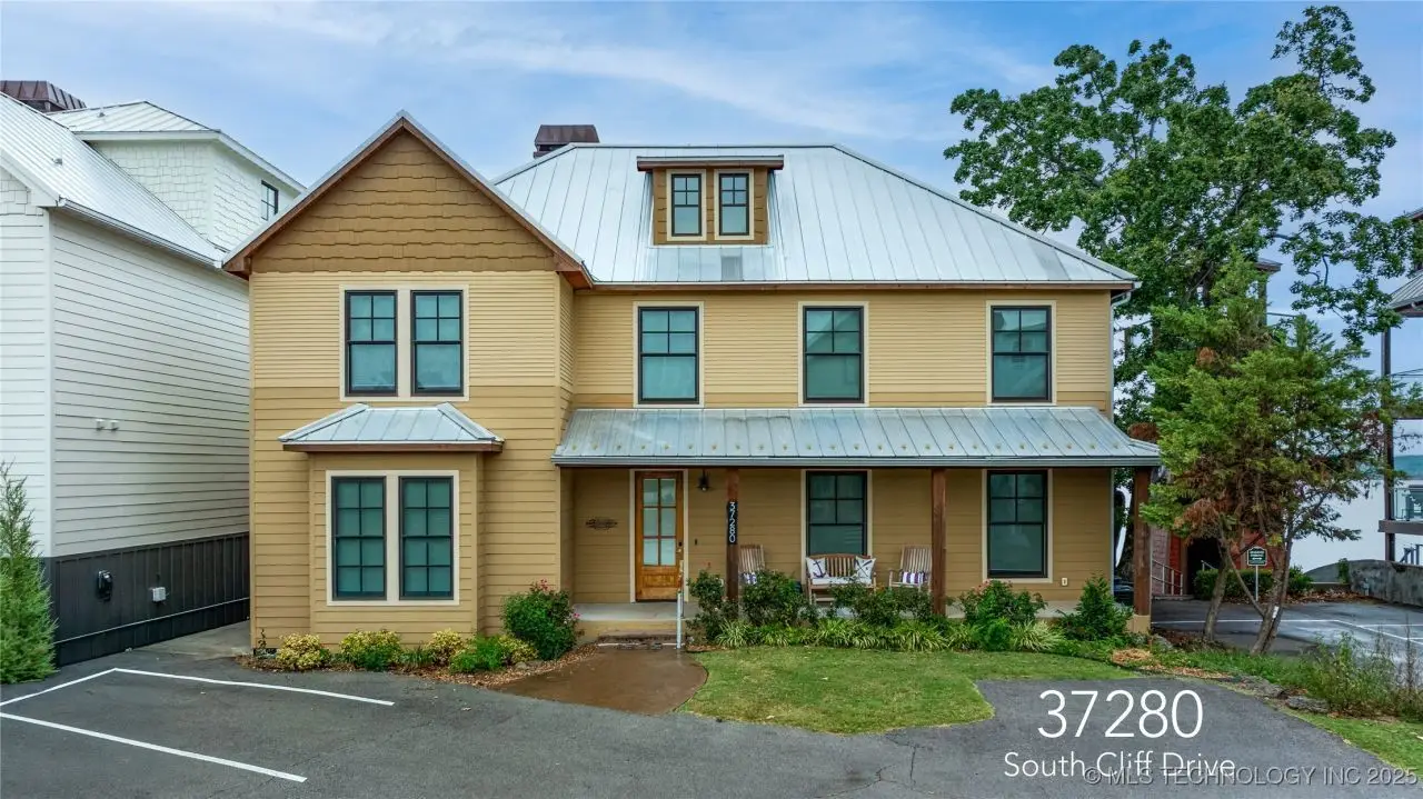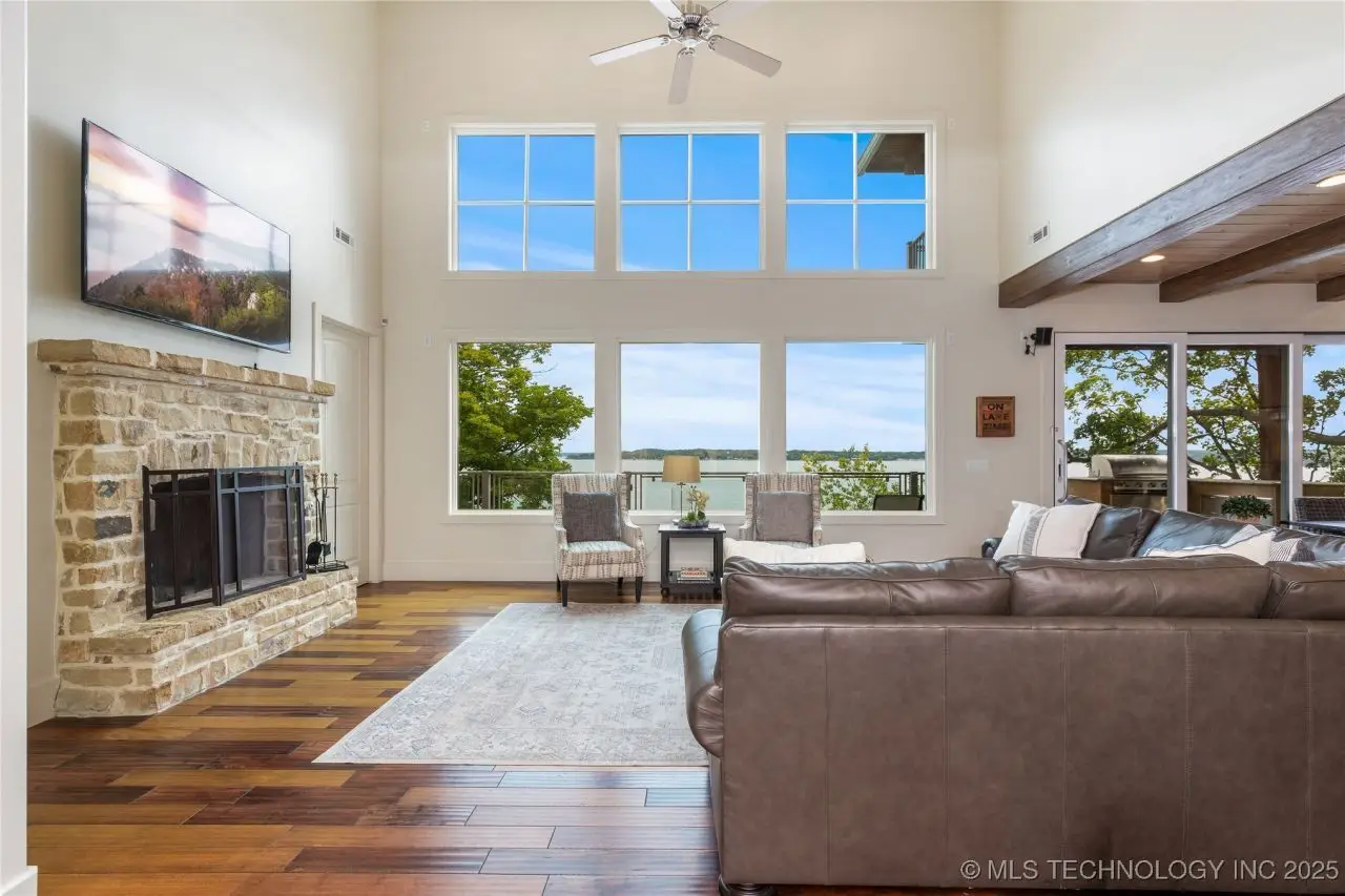 Come see this stunning residence in the gated community of South Shore! Sold fully furnished by a designer, & located an estimated hour hour from Tulsa, this beautifully designed home offer five bedrooms and five full bathrooms, providing both space and comfort for family and guests. An open floor plan flows seamlessly throughout, with breathtaking lake views from all three levels. Each with its own patio as well. The basement is made for entertaining with a wet bar, shuffleboard table, Pac Man arcade and more! Or, you can relax outside in the hot tub or around the firepit while enjoying the views. This property also has a dock slip with a lift and boat cover, offering unmatched convenience for lake living. South Shore also offers a community clubroom, pool, and ponds.
