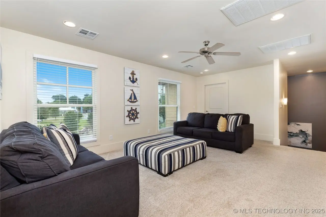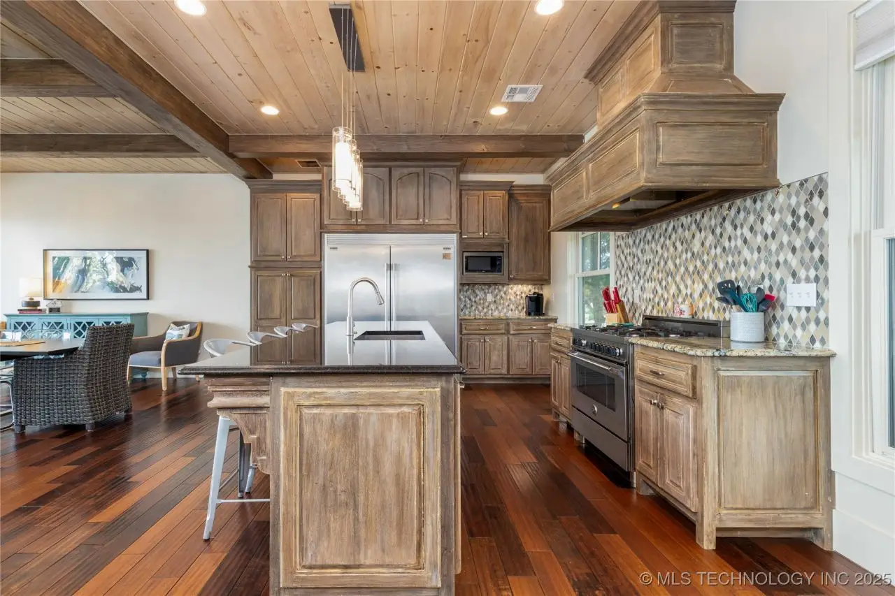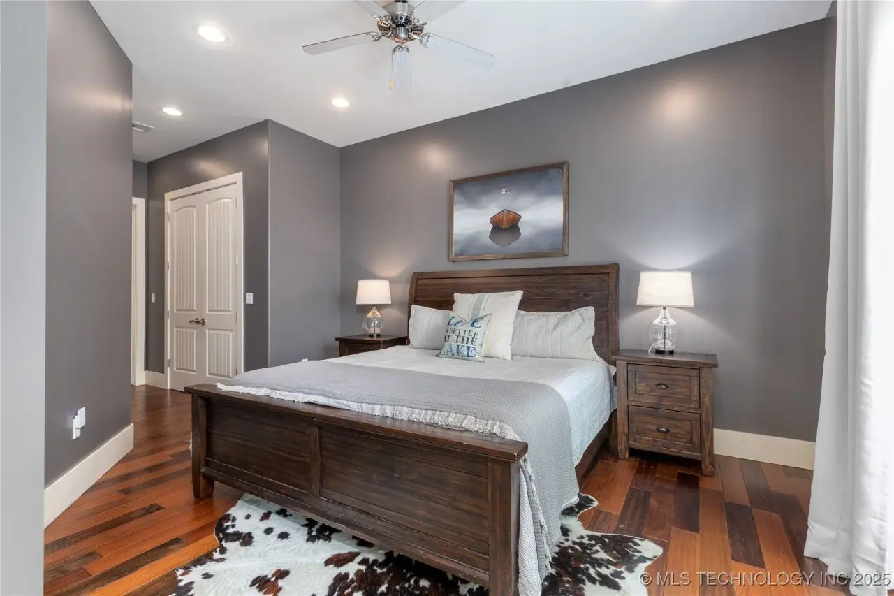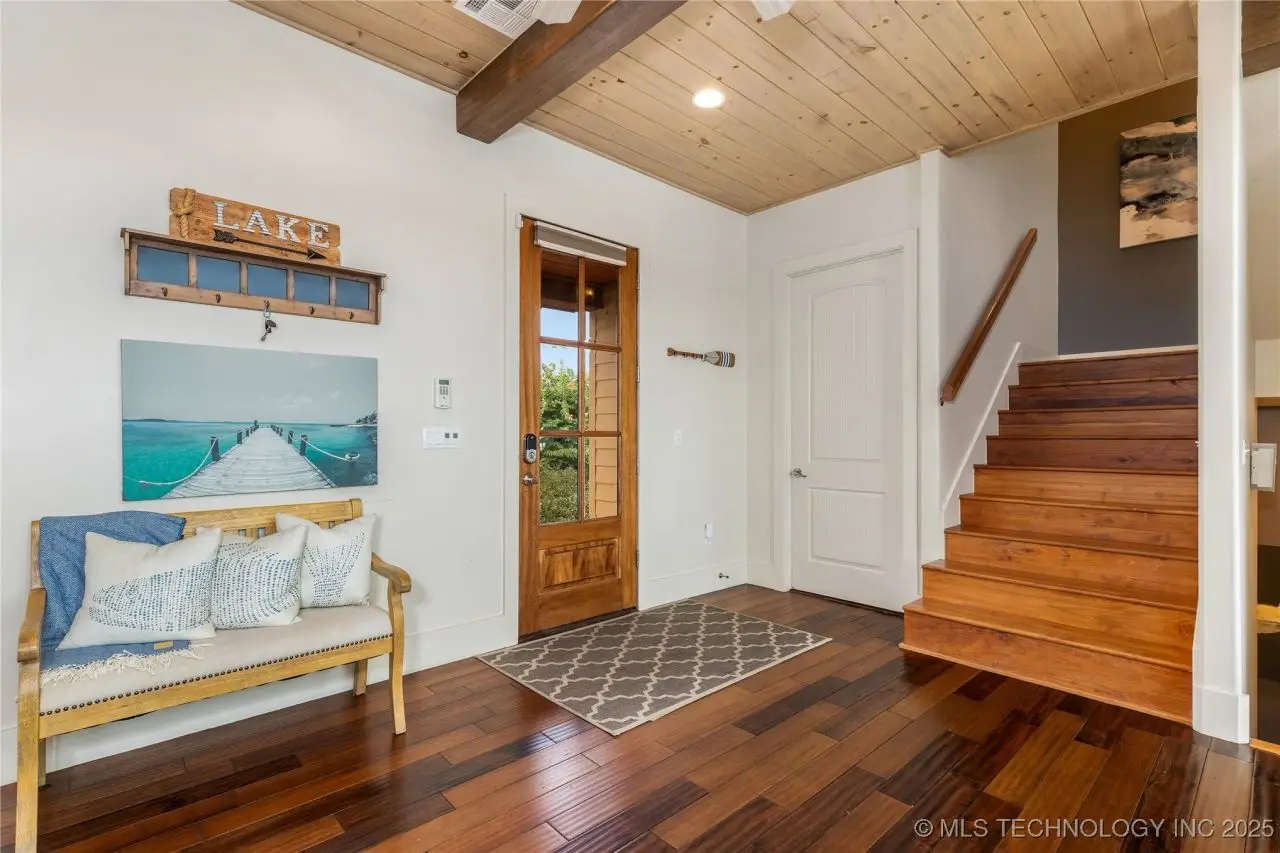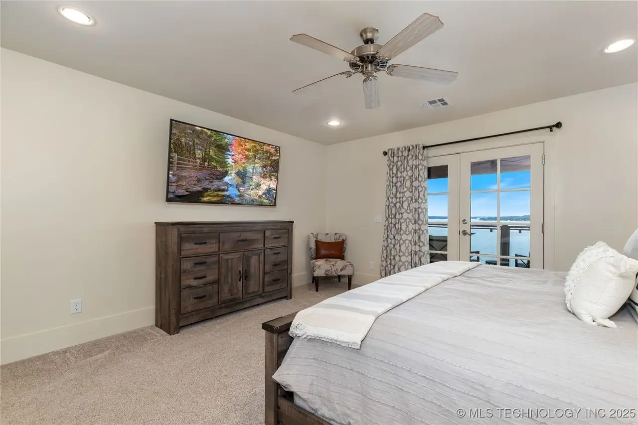 Come see this stunning residence in the gated community of South Shore! Sold fully furnished by a designer, & located an estimated hour hour from Tulsa, this beautifully designed home offer five bedrooms and five full bathrooms, providing both space and comfort for family and guests. An open floor plan flows seamlessly throughout, with breathtaking lake views from all three levels. Each with its own patio as well. The basement is made for entertaining with a wet bar, shuffleboard table, Pac Man arcade and more! Or, you can relax outside in the hot tub or around the firepit while enjoying the views. This property also has a dock slip with a lift and boat cover, offering unmatched convenience for lake living. South Shore also offers a community clubroom, pool, and ponds.