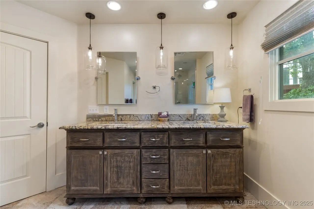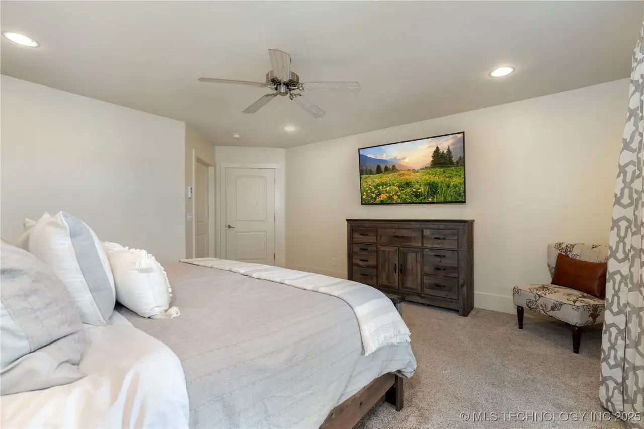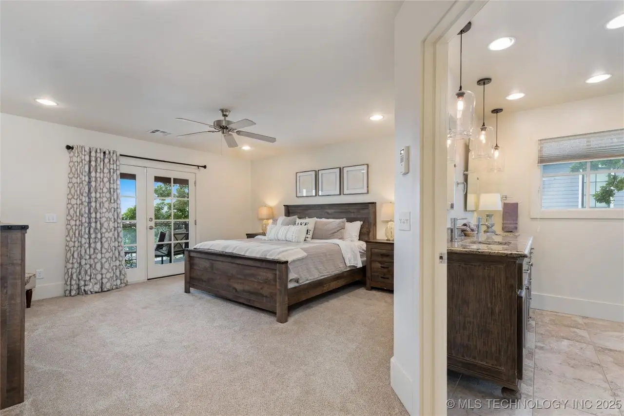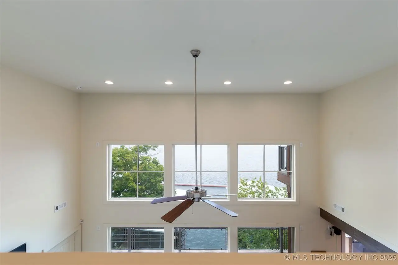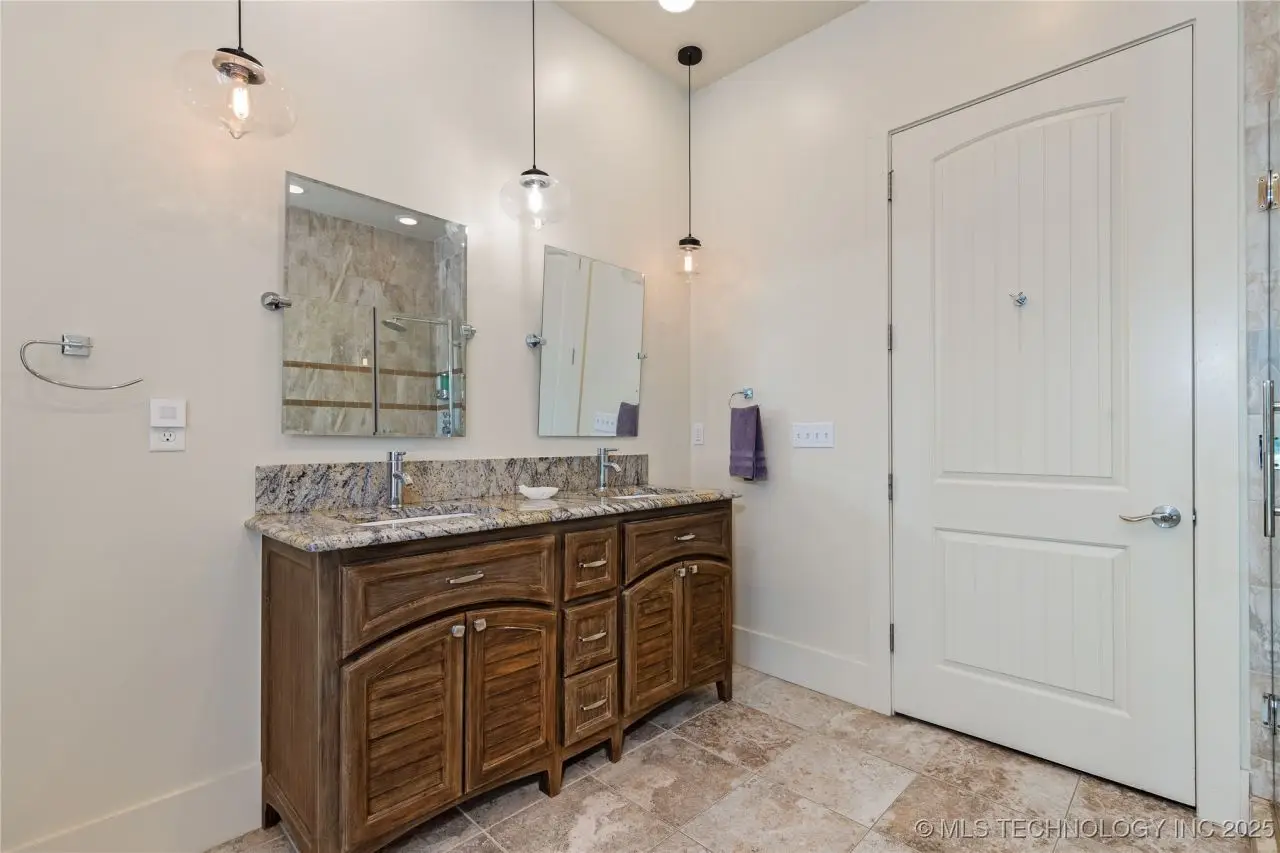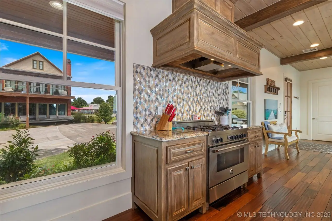 Come see this stunning residence in the gated community of South Shore! Sold fully furnished by a designer, & located an estimated hour hour from Tulsa, this beautifully designed home offer five bedrooms and five full bathrooms, providing both space and comfort for family and guests. An open floor plan flows seamlessly throughout, with breathtaking lake views from all three levels. Each with its own patio as well. The basement is made for entertaining with a wet bar, shuffleboard table, Pac Man arcade and more! Or, you can relax outside in the hot tub or around the firepit while enjoying the views. This property also has a dock slip with a lift and boat cover, offering unmatched convenience for lake living. South Shore also offers a community clubroom, pool, and ponds.