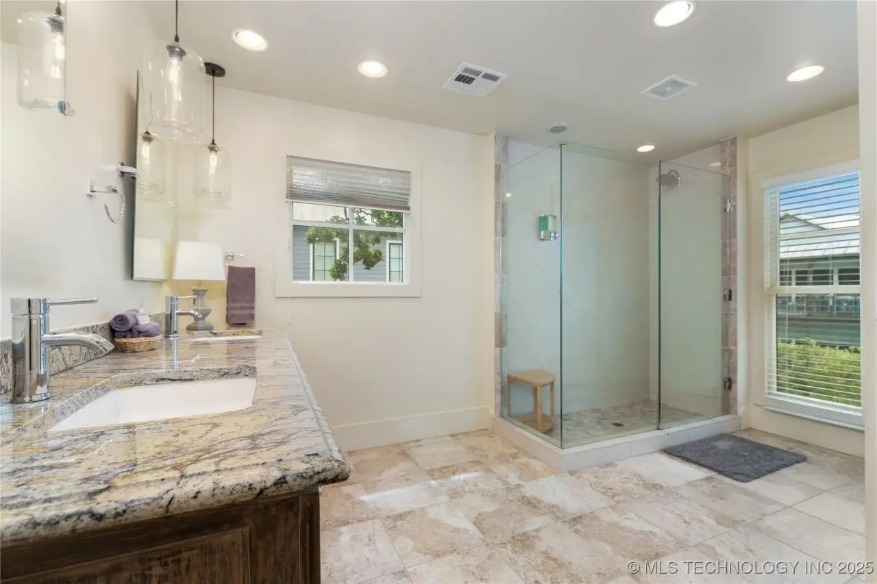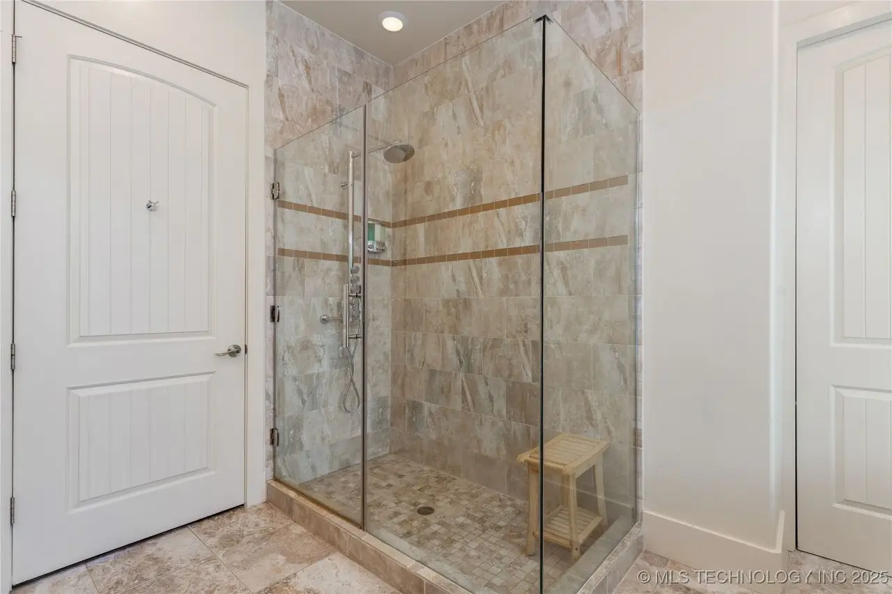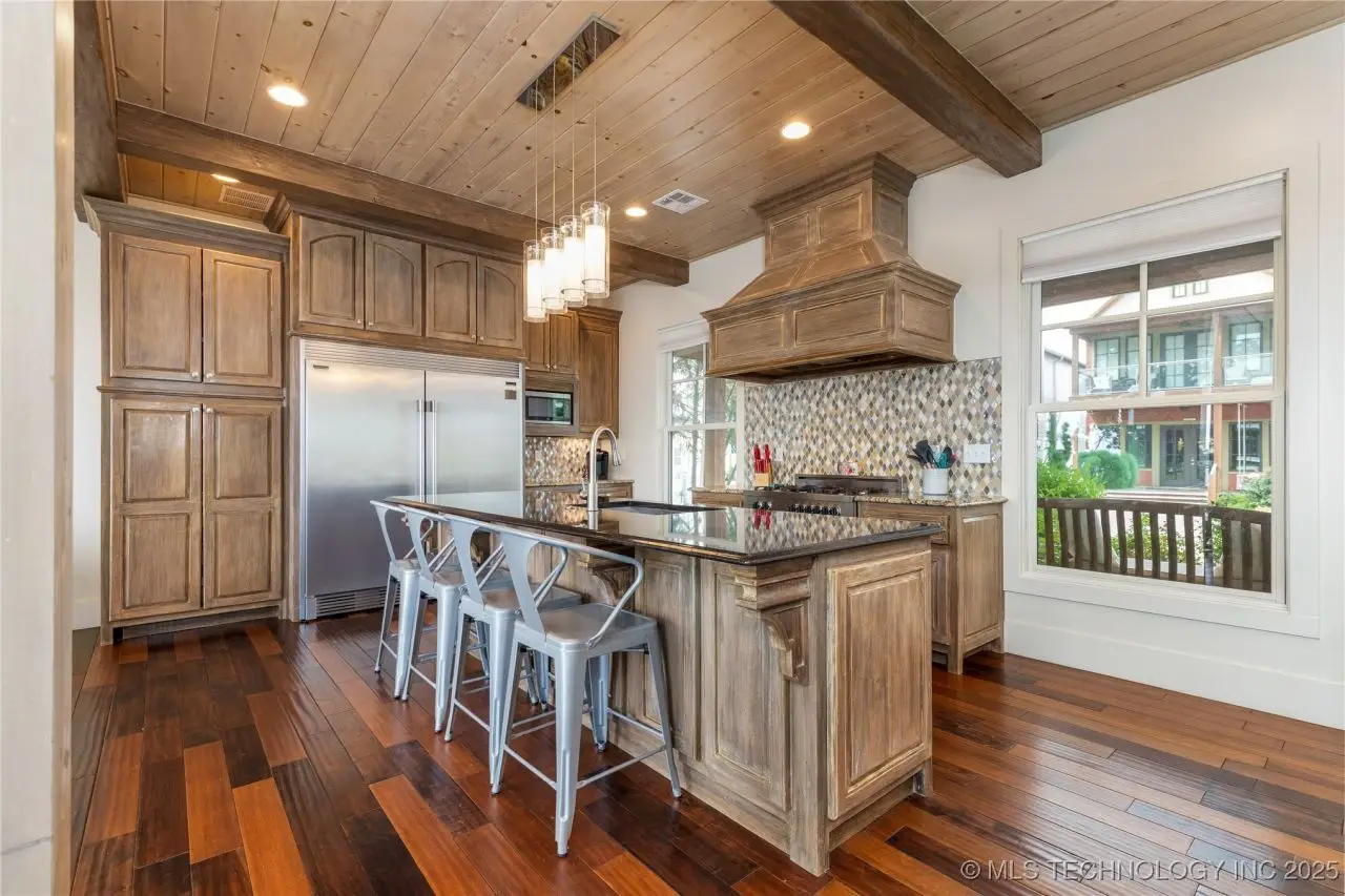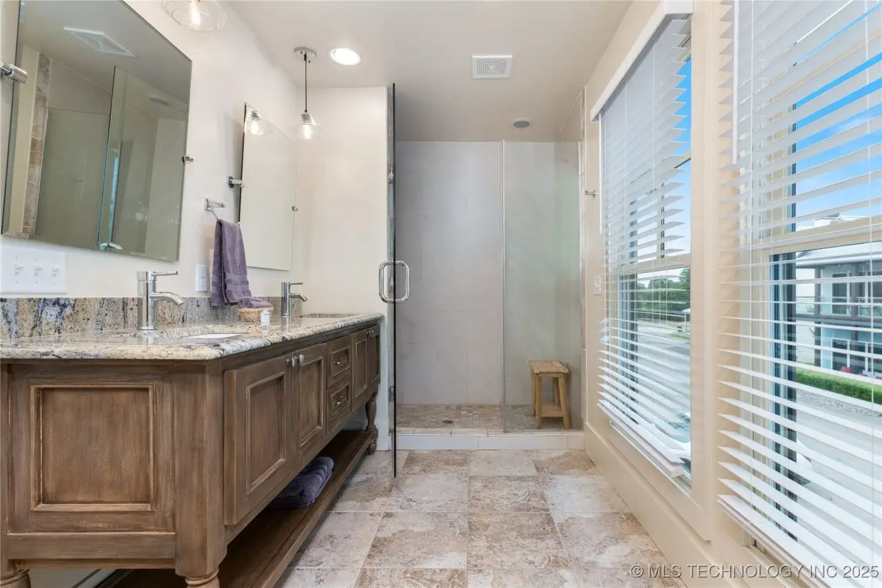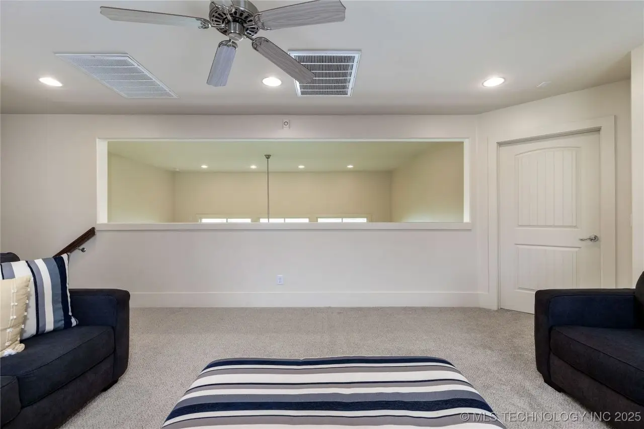 Come see this stunning residence in the gated community of South Shore! Sold fully furnished by a designer, & located an estimated hour hour from Tulsa, this beautifully designed home offer five bedrooms and five full bathrooms, providing both space and comfort for family and guests. An open floor plan flows seamlessly throughout, with breathtaking lake views from all three levels. Each with its own patio as well. The basement is made for entertaining with a wet bar, shuffleboard table, Pac Man arcade and more! Or, you can relax outside in the hot tub or around the firepit while enjoying the views. This property also has a dock slip with a lift and boat cover, offering unmatched convenience for lake living. South Shore also offers a community clubroom, pool, and ponds.