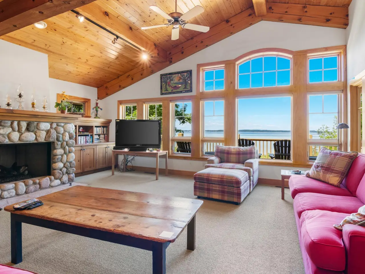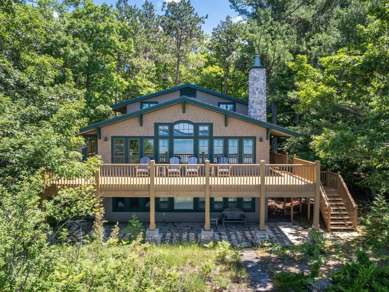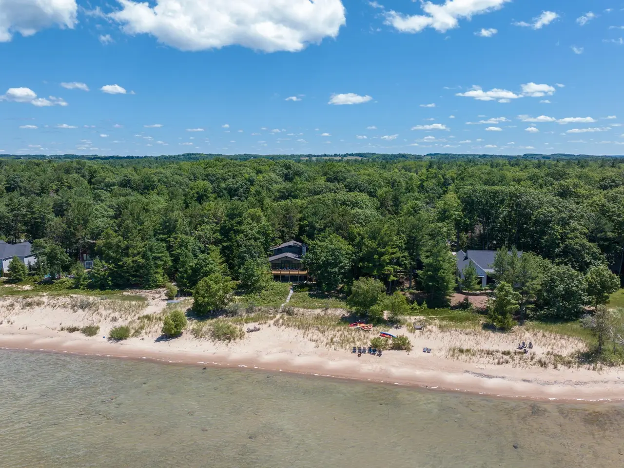 Grand Traverse Bay at its Finest! Welcome to your private retreat on the shores of Grand Traverse Bay-featuring 100 feet of pristine, crystal-clear waterfront, a sugar- sand beach, and breathtaking panoramic sunset views. Nestled on a large, wooded lot along a quiet, private road just 3.5 miles north of Elk Rapids. With 5-bedrooms and 3.5 baths, this beautifully crafted craftsman-style home (designer and builder Paul Maurer) features meticulous attention to detail and premium finishes throughout, perfect for year-round living or summer escapes. The open concept main floor includes a well-appointed island kitchen with wood floors, main floor laundry, a spacious sunroom overlooking the water, and a main floor primary suite with en suite bath, stone gas fireplace and built-in bookcases. Upstairs, two bedrooms share a jack and Jill full bath while the walk out lower level includes 2, additional bedrooms a family room, stone gas fireplace and screened in covered porch ideal for guests or multi-generational living. Covered large back porch and beautiful sun filled deck to gaze out on the lake front. Two -car detached garage, beautifully maintained home, and move-in ready. This property blends natural beauty with everyday comfort.