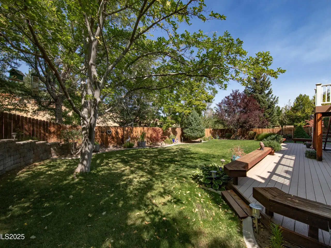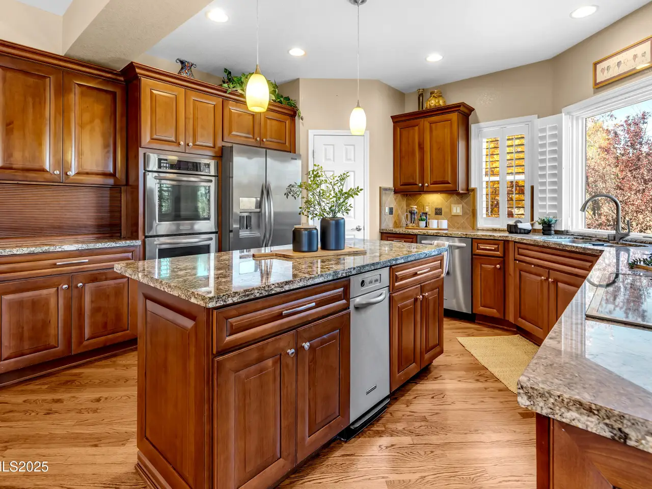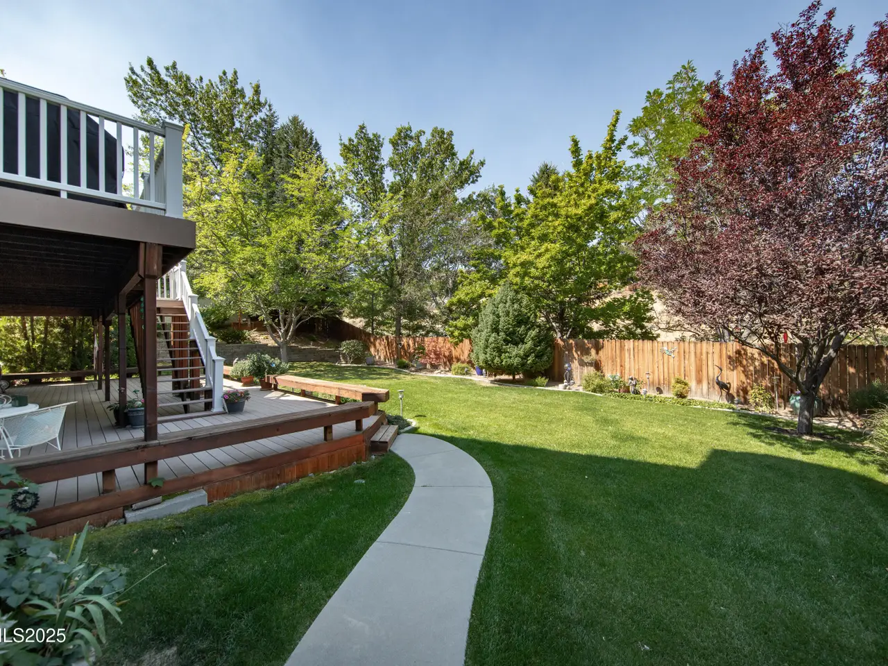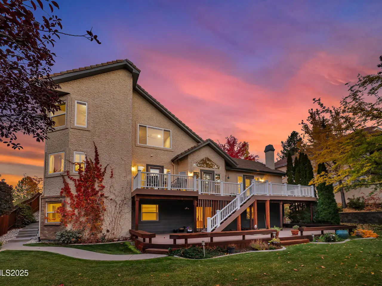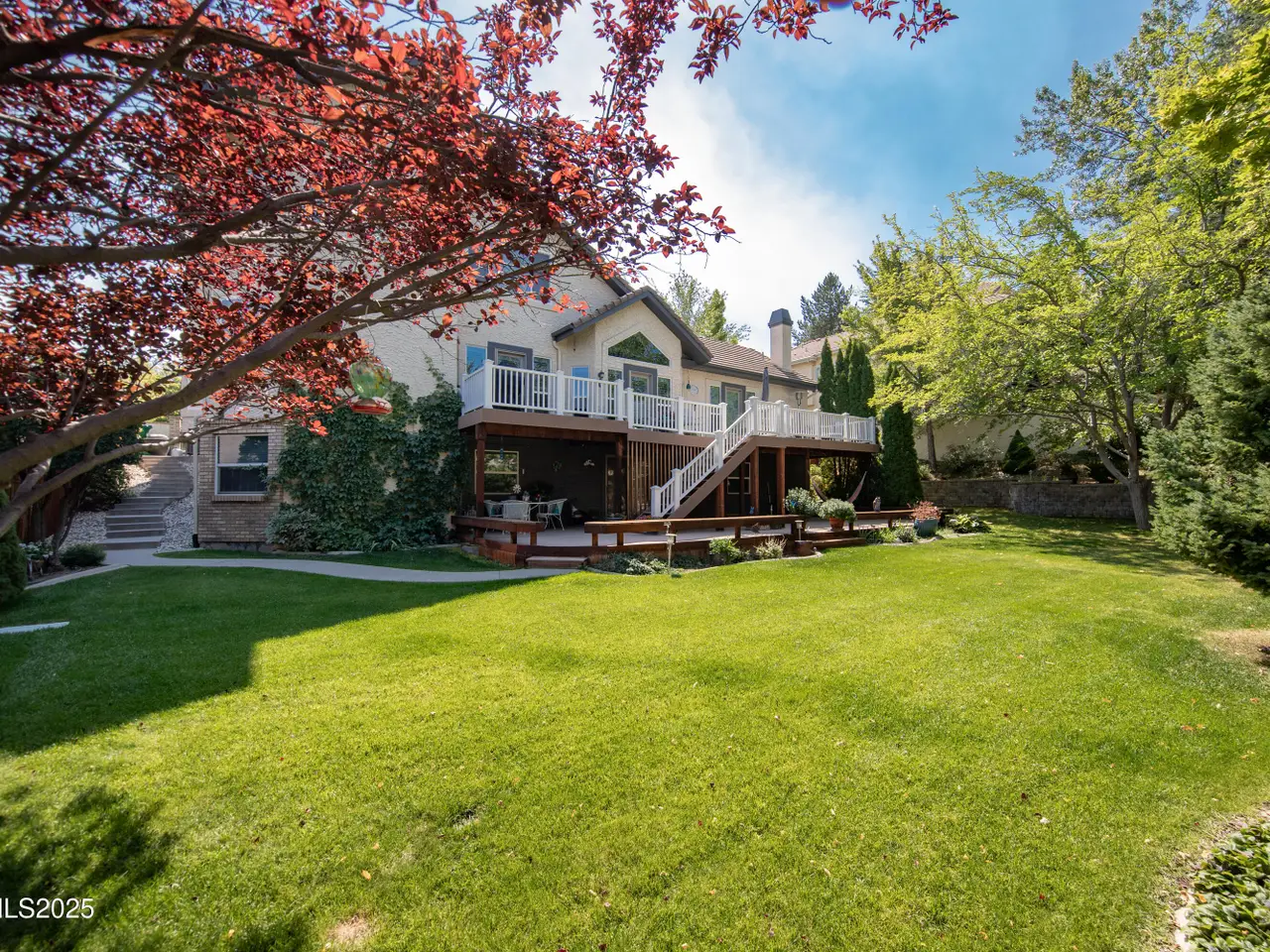 This majestic home, nestled on one of Reno's most picturesque streets, offers an unparalleled living experience. Centrally located in SW Reno, it provides convenient access to all the amenities and attractions you desire. Step into quality craftsmanship and custom details in this meticulously maintained home. The main level boasts beautiful wood floors, plantation shutters, and high ceilings. An inviting entry features a sweeping staircase beneath a dramatic cathedral ceiling. The living and dining rooms are open yet defined, offering tree views through large windows and deck access through French doors. The kitchen is a chef's dream, featuring a corner sink with windows overlooking mature trees, a walk-in pantry, a center island with a breakfast bar, an appliance garage, a trash compactor, a dining nook, and high-end appliances. It overlooks a warm and inviting family room, complete with a wood-burning fireplace and ceiling fan. A bar with display cabinets, a sink, and granite counters makes entertaining effortless - the perfect spot to relax and enjoy a game or movie. The large primary bedroom, conveniently located on the main floor, offers tall ceilings, ceiling fan, and French doors leading to the deck. Its spacious en-suite bathroom includes a soaking tub, a roomy shower, and an extensive vanity with two sinks, complemented by separate his and hers closets. The second story features a large loft/office with built-in shelves and double doors for privacy, along with three generous bedrooms and a full bathroom with a tub. The walk-out basement offers endless possibilities: multi-generational living, a teenage hangout, family entertainment space, a man cave, additional office space, or simply room to spread out. The spacious main area includes a wood-burning fireplace, a nook ideal for a game table, and easy access to the lower deck and backyard. There's also a large bedroom and full bathroom, plus a bonus room, perfect for an in-law unit or guest suite. Abundant storage is available in a huge laundry/utility room and additional storage closets. Outside, mature and well-maintained landscaping on the expansive half acre lot provides picturesque views from every window. Two beautiful Trex-style decks, one on the main level with convenient stairs to the ground level deck. A wonderful place for parties or relaxing afternoons. An extra-large, finished three-car garage features built-in cabinets and new paint. There is NO HOA. A private road maintenance agreement is 500 per year, and an access road easement in the back of the property is managed by the City of Reno. The kitchen refrigerator, washer, dryer and basement TV are included. The home also features a 2022 HVAC system and a newer water heater. Come visit this extraordinary home!