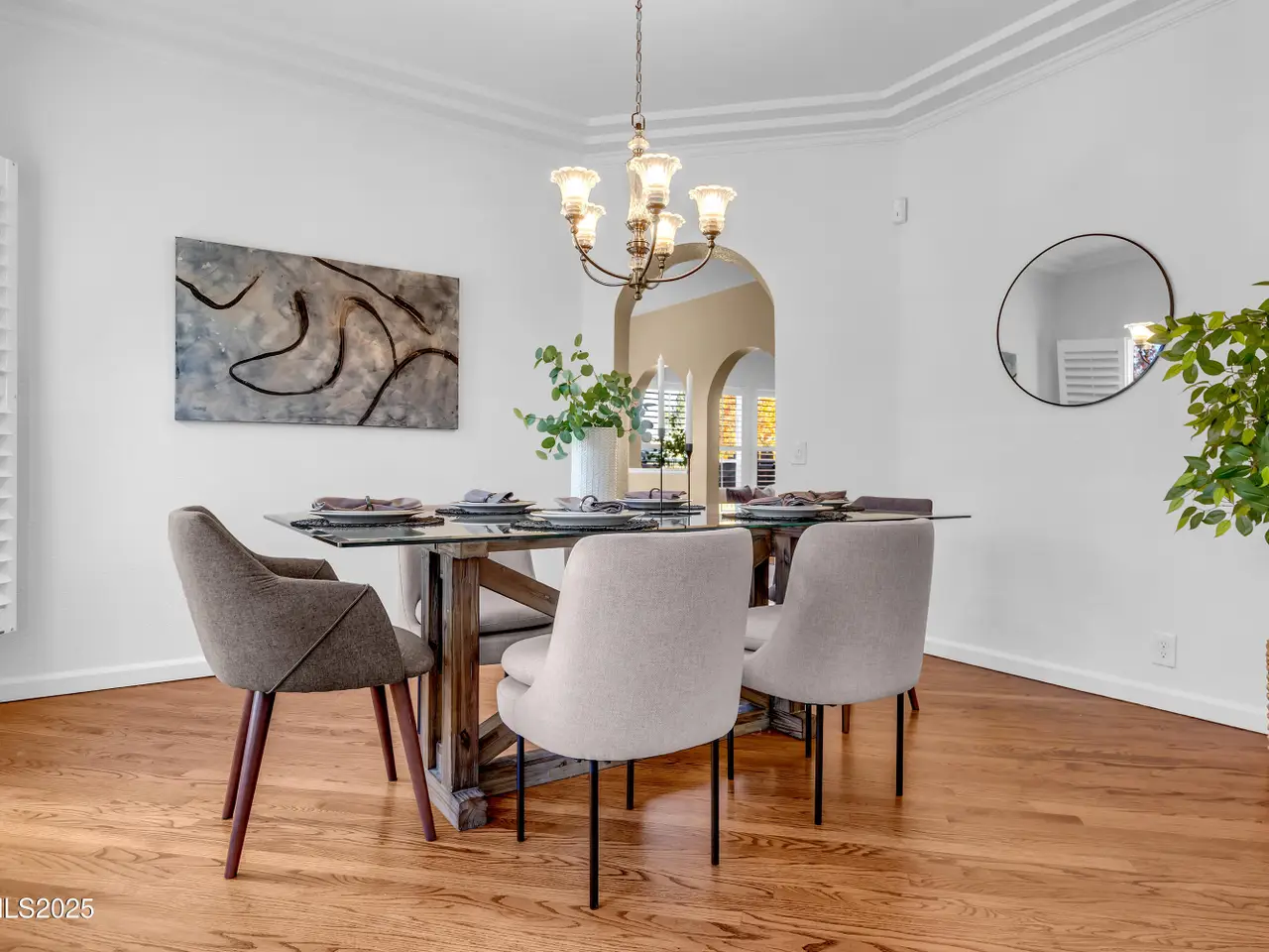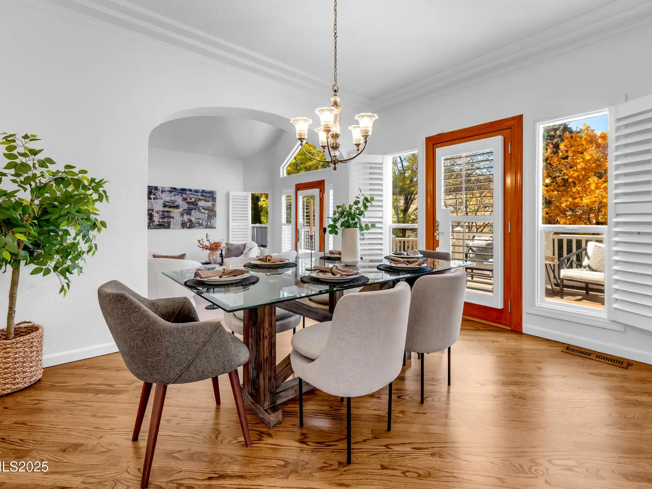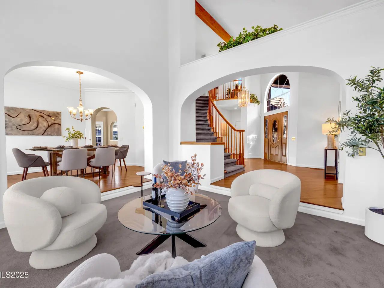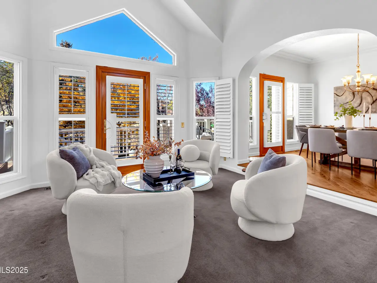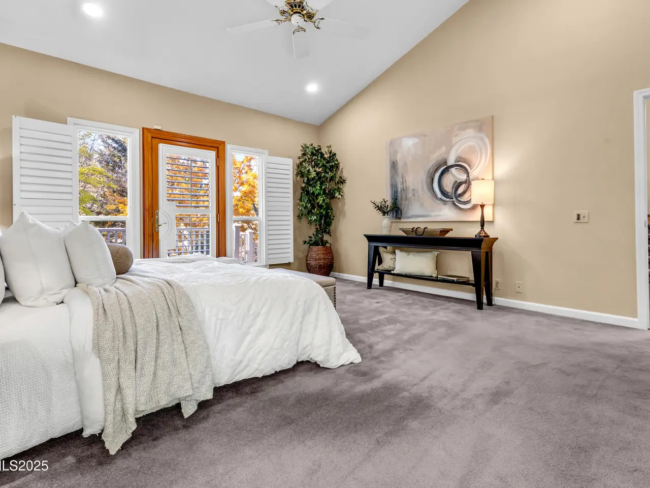 This majestic home, nestled on one of Reno's most picturesque streets, offers an unparalleled living experience. Centrally located in SW Reno, it provides convenient access to all the amenities and attractions you desire. Step into quality craftsmanship and custom details in this meticulously maintained home. The main level boasts beautiful wood floors, plantation shutters, and high ceilings. An inviting entry features a sweeping staircase beneath a dramatic cathedral ceiling. The living and dining rooms are open yet defined, offering tree views through large windows and deck access through French doors. The kitchen is a chef's dream, featuring a corner sink with windows overlooking mature trees, a walk-in pantry, a center island with a breakfast bar, an appliance garage, a trash compactor, a dining nook, and high-end appliances. It overlooks a warm and inviting family room, complete with a wood-burning fireplace and ceiling fan. A bar with display cabinets, a sink, and granite counters makes entertaining effortless - the perfect spot to relax and enjoy a game or movie. The large primary bedroom, conveniently located on the main floor, offers tall ceilings, ceiling fan, and French doors leading to the deck. Its spacious en-suite bathroom includes a soaking tub, a roomy shower, and an extensive vanity with two sinks, complemented by separate his and hers closets. The second story features a large loft/office with built-in shelves and double doors for privacy, along with three generous bedrooms and a full bathroom with a tub. The walk-out basement offers endless possibilities: multi-generational living, a teenage hangout, family entertainment space, a man cave, additional office space, or simply room to spread out. The spacious main area includes a wood-burning fireplace, a nook ideal for a game table, and easy access to the lower deck and backyard. There's also a large bedroom and full bathroom, plus a bonus room, perfect for an in-law unit or guest suite. Abundant storage is available in a huge laundry/utility room and additional storage closets. Outside, mature and well-maintained landscaping on the expansive half acre lot provides picturesque views from every window. Two beautiful Trex-style decks, one on the main level with convenient stairs to the ground level deck. A wonderful place for parties or relaxing afternoons. An extra-large, finished three-car garage features built-in cabinets and new paint. There is NO HOA. A private road maintenance agreement is 500 per year, and an access road easement in the back of the property is managed by the City of Reno. The kitchen refrigerator, washer, dryer and basement TV are included. The home also features a 2022 HVAC system and a newer water heater. Come visit this extraordinary home!
