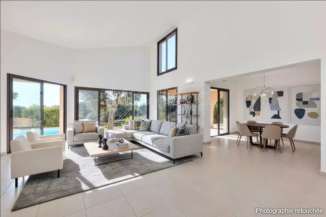 This modern 153 m² villa is ideally located in a quiet area surrounded by nature, close to the golf courses of Valescure. Facing south, it offers an unobstructed view of the Esterel hills. With its numerous openings and spacious living area, the villa is filled with natural light, creating a sense of freedom and openness. The interior layout includes a large living room with an open-plan kitchen, a dining area, a spacious pantry, two master suites, and 2 additional bedrooms. A large garage provides ample space for parking your car. Finally, a secluded pool ensures relaxing moments in complete privacy during sunny summer days.