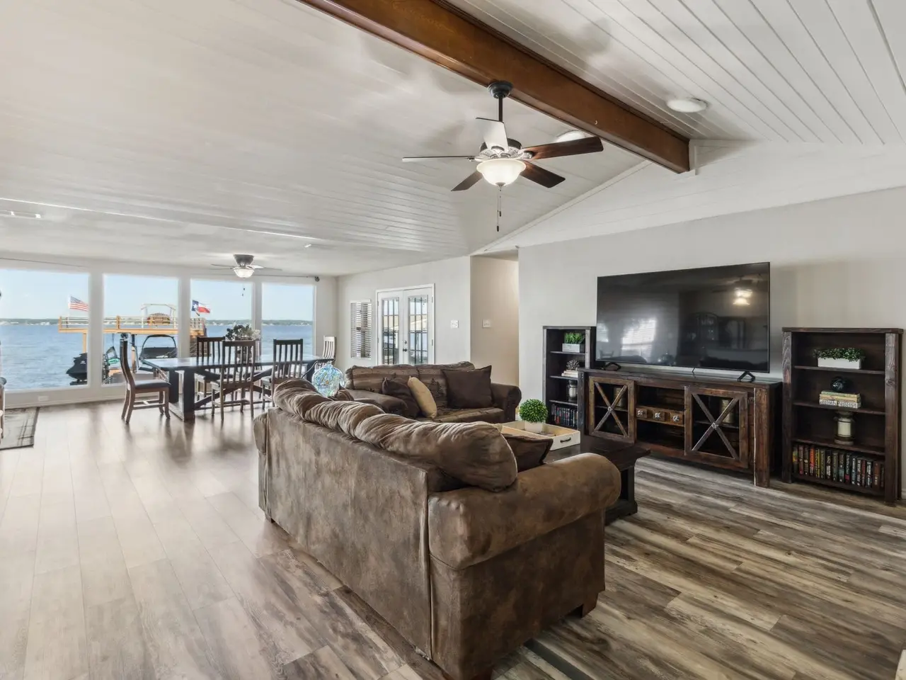 Great location with deep water! This stunning lakeside home offers picturesque sunsets over open water, best enjoyed from the recently updated dock or the spacious covered patio. The dock features an upper deck with storage for a boat and two jet skis, along with easy water access via stairs leading directly from the deck, making it perfect for swimming, boating, and other water activities. Inside, large windows provide breathtaking views and fill the home with natural light. Recent updates include new flooring and a primary suite with direct access to the roof deck, offering a private spot to relax. Three additional bedrooms and bathrooms for guest. Possibility for a 5th bedroom currently setup as a second living room with double murphy beds. Currently setup to sleep 14, this property is ideal as a permanent residence, a weekend getaway, or a smart investment. The gated yard provides privacy, while two covered parking spots add convenience. Located with easy access to dining along the lake, this home combines comfort, style, and the best of waterfront living. HOA provides community boat ramp and park for private use.
