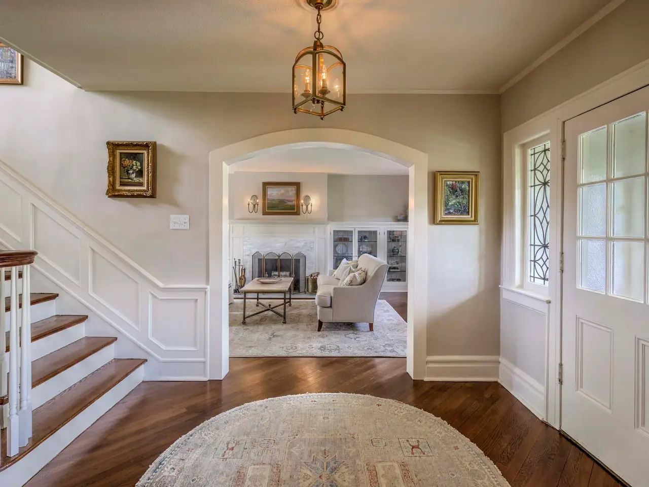 Location. Lifestyle. Luxury. Beautifully appointed interiors. Classic elegance. This center hall colonial blends classic architectural Details with modern amenities. Situated on one of only a few flat streets in Maplewood, it's just three-quarters of a mile from the train and village. The foyer, with leaded glass windows and newly refinished hardwood floors, leads to a spacious living room featuring leaded glass shelves and a wood-burning fireplace. Adjacent is a family room, perfect for relaxing. The formal dining room is ideal for large gathering dinners. A chef's eat-in kitchen BOAsts high-end appliances, granite countertops, and a banquette. Additional features include a pantry with a wine refrigerator. The finished basement with a powder room, perfect for a playroom or game room, includes a separate laundry room. The second floor has four bedrooms and a bonus room with a cathedral ceiling, a brick chimney wall and an antique, leaded glass window. The primary bedroom has a walk-in closet and renovated bath. A renovated hallway bath has a double vanity and full tub. The third floor features a private, ensuite bedroom. A large patio overlooks an expansive backyard. The detached three-bay garage includes a climbing wall and loft. A backyard gate provides access to a coveted private back lane where neighbors gather to socialize and play.